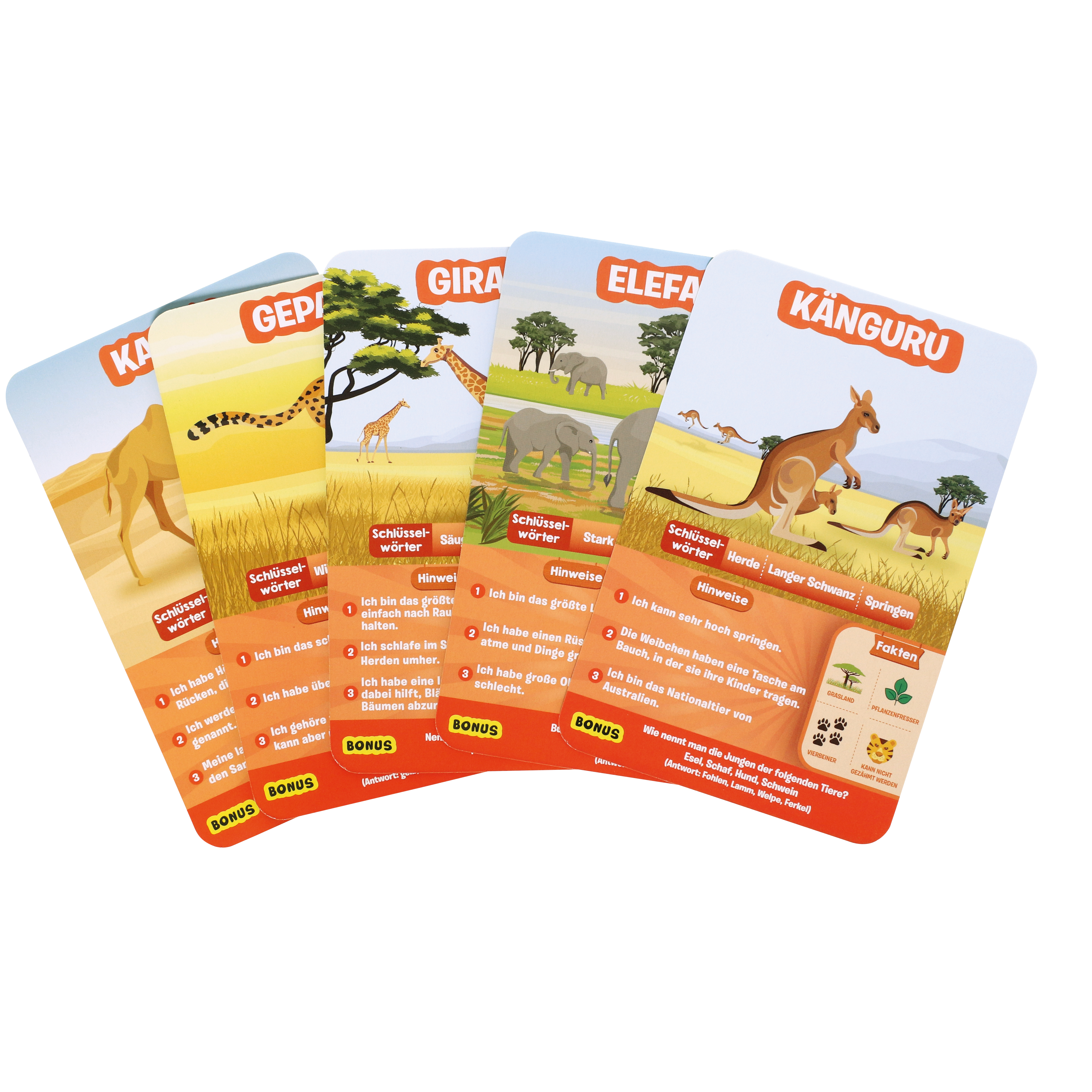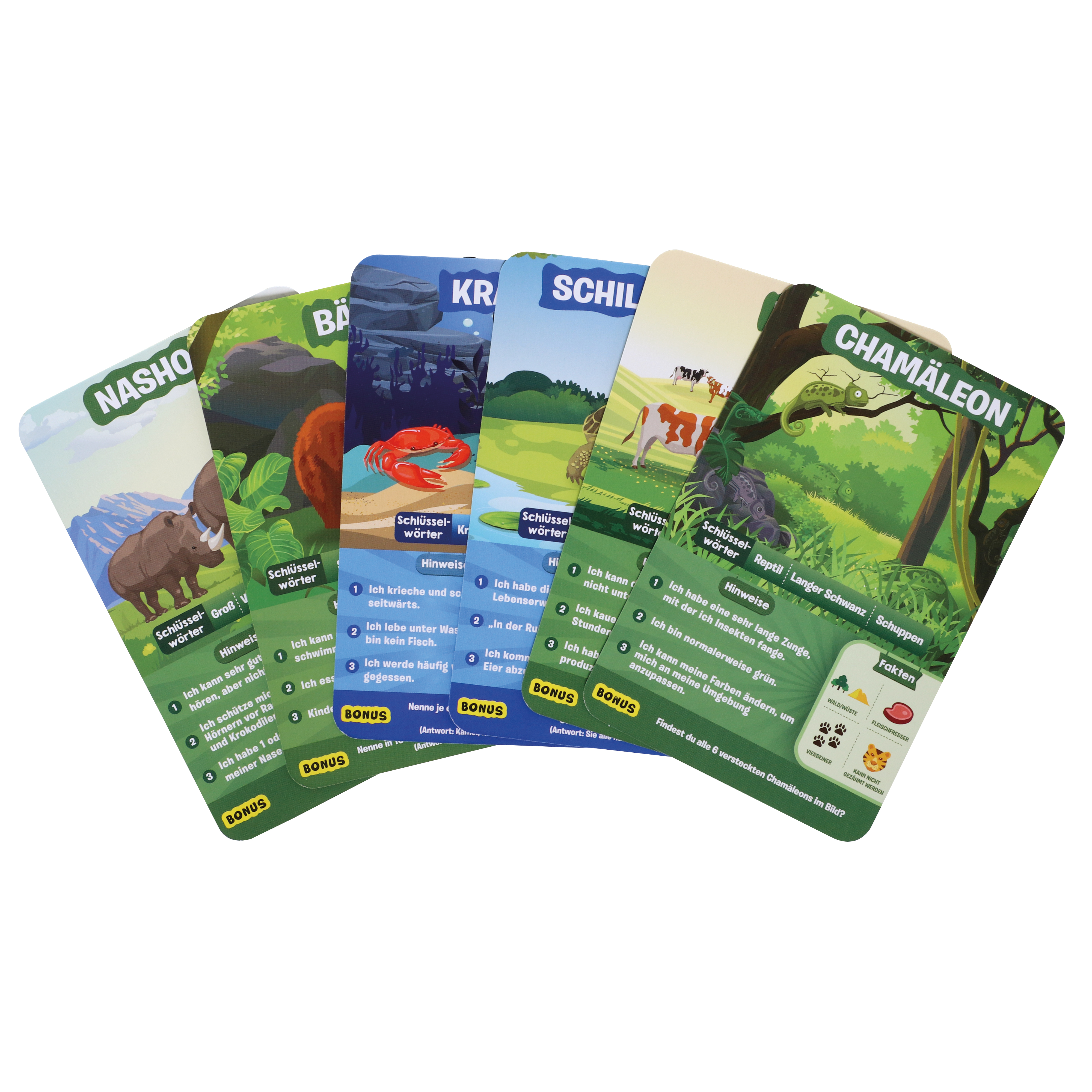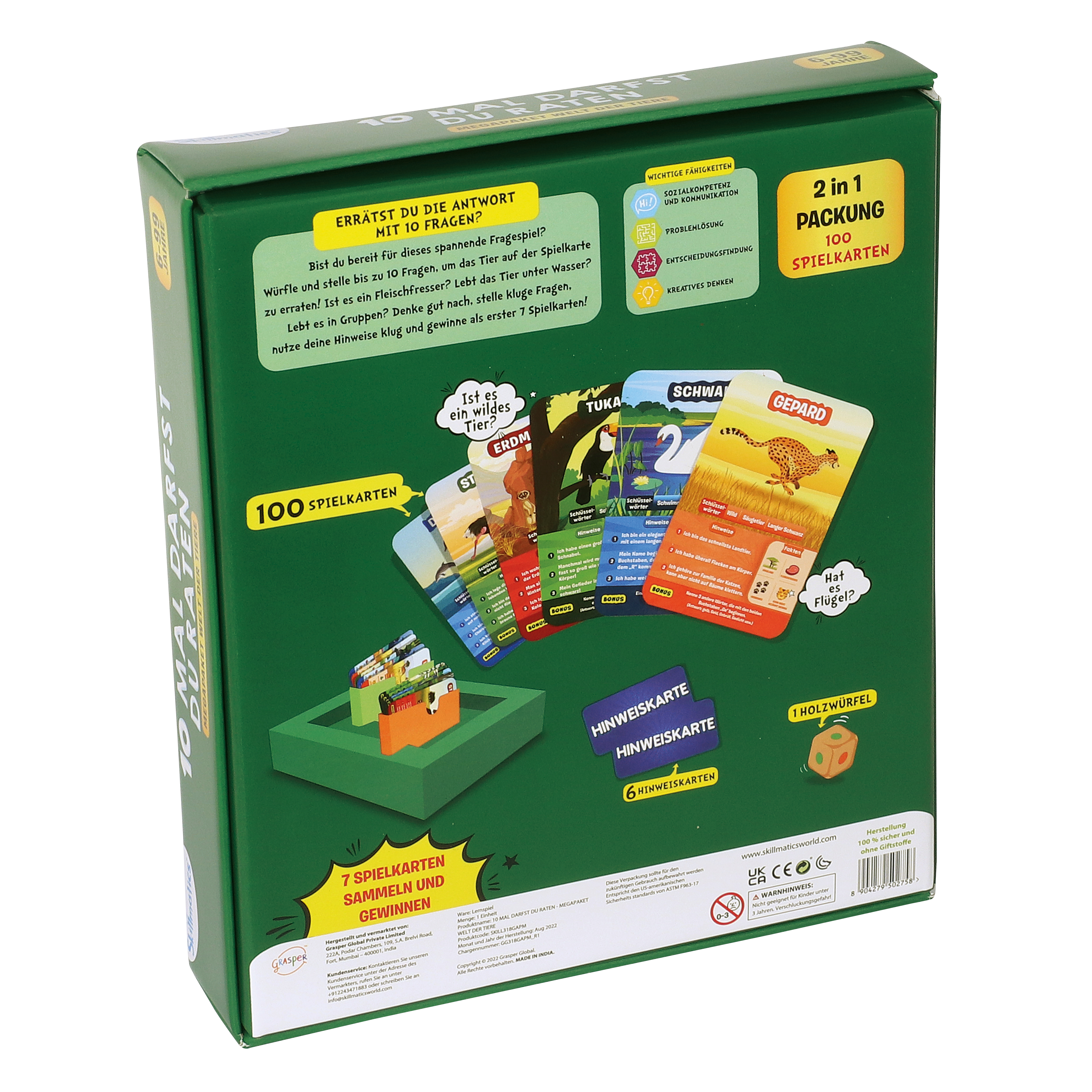 Aufregendes Fragespiel - Stelle bis zu 10 Fragen, um das Tier auf der Spielkarte zu erraten. Ist es ein Fleischfresser? Ist es ein Haustier? Lebt es in Gruppen? Denke scharf nach, stelle clevere Fragen, setze deine Hinweiskarten klug ein und sei der Erste, der 7 Spielkarten gewinnt. Inhalt: 100 Spielkarten, 6 Hinweiskarten, 1 Holzwürfel.