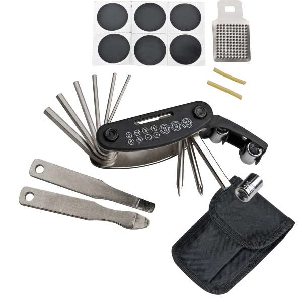 17 teiliges Reparaturset fürs Fahrrad. Es beinhaltet ein Multifunktionswerkzeug und selbstklebendes Flickzeug zur Reparatur einer Reifenpanne. Wir drucken Ihr Logo vorzugsweise einfarbig silber auf die Außenseite des Etuis.