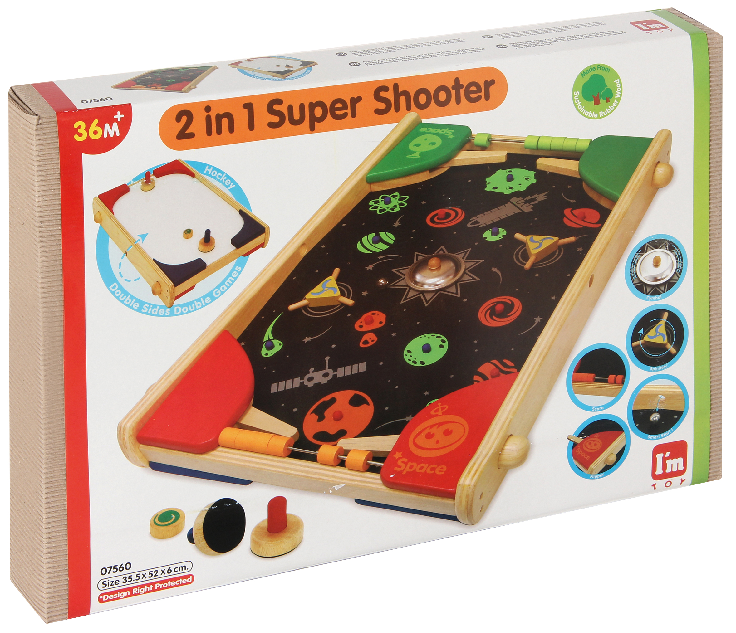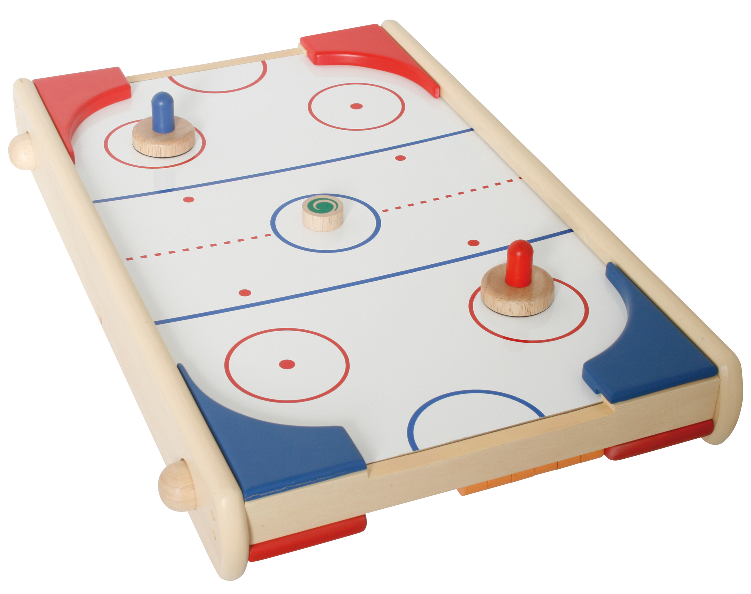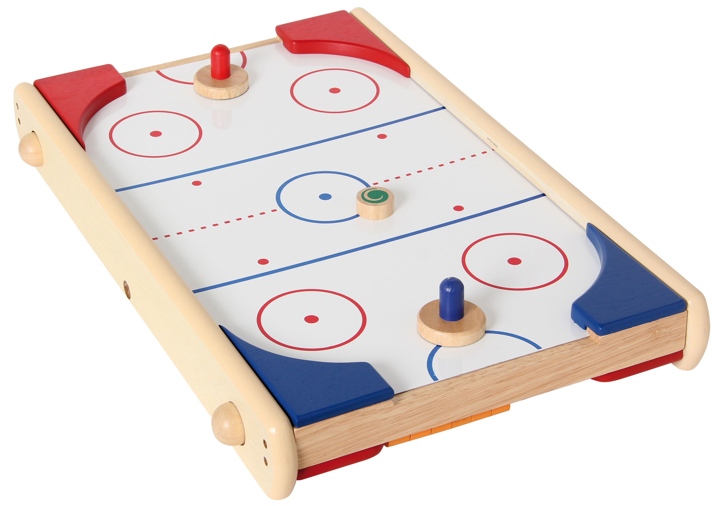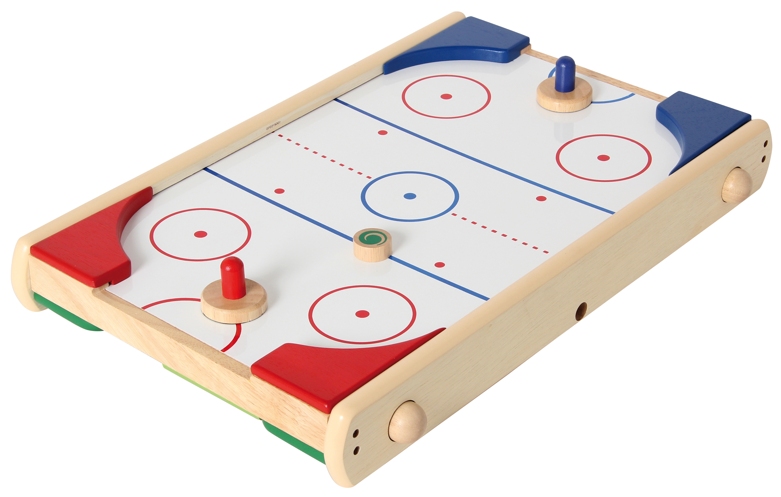 Zwei Spielideen in einem: Flipper und Hockey. Das Spiel besteht aus einem massiven, hölzernen Spielbrett (beidseitig bespielbar!), einem Ball, einem Puck, zwei Punkte-Zählern, zwei Hand-Kickern.