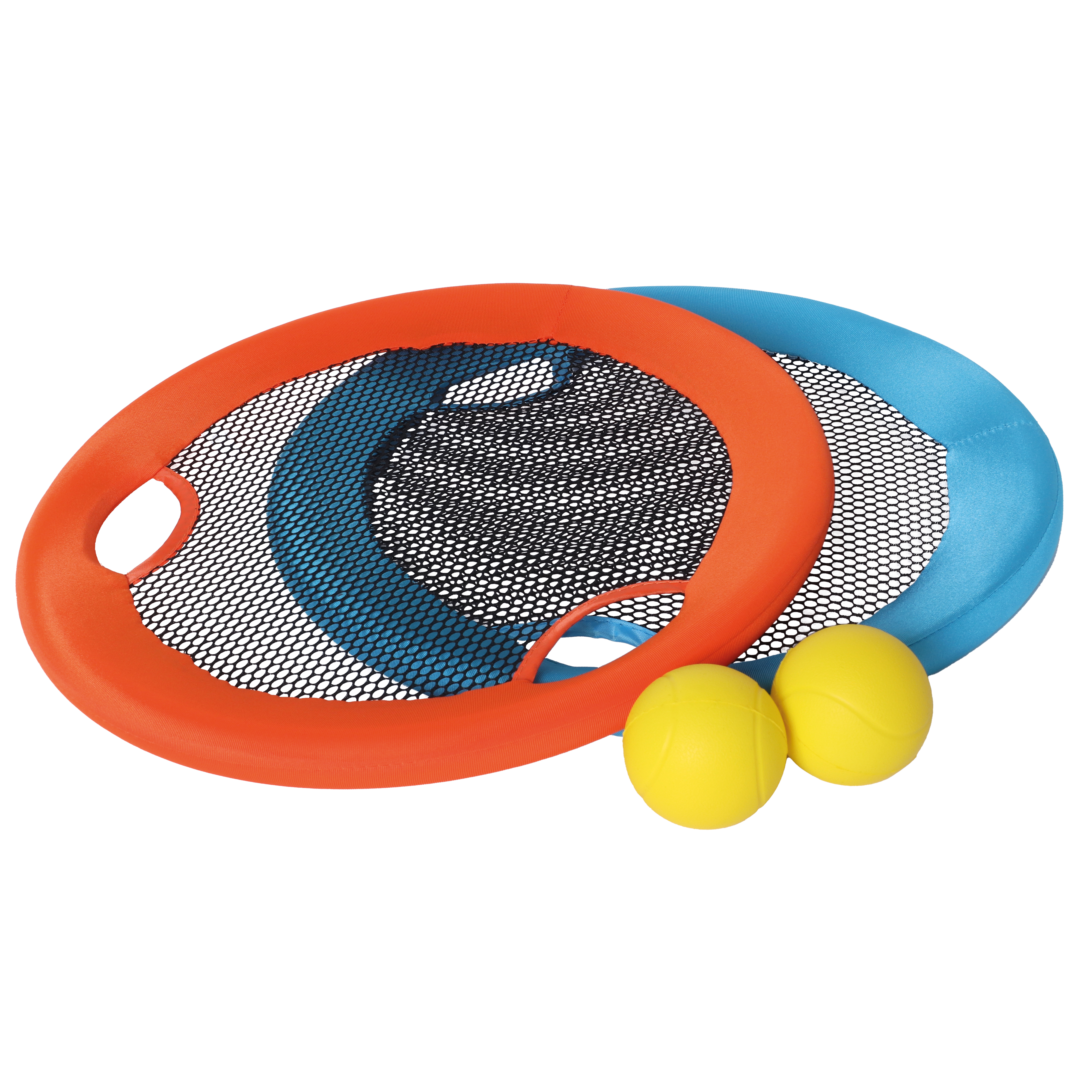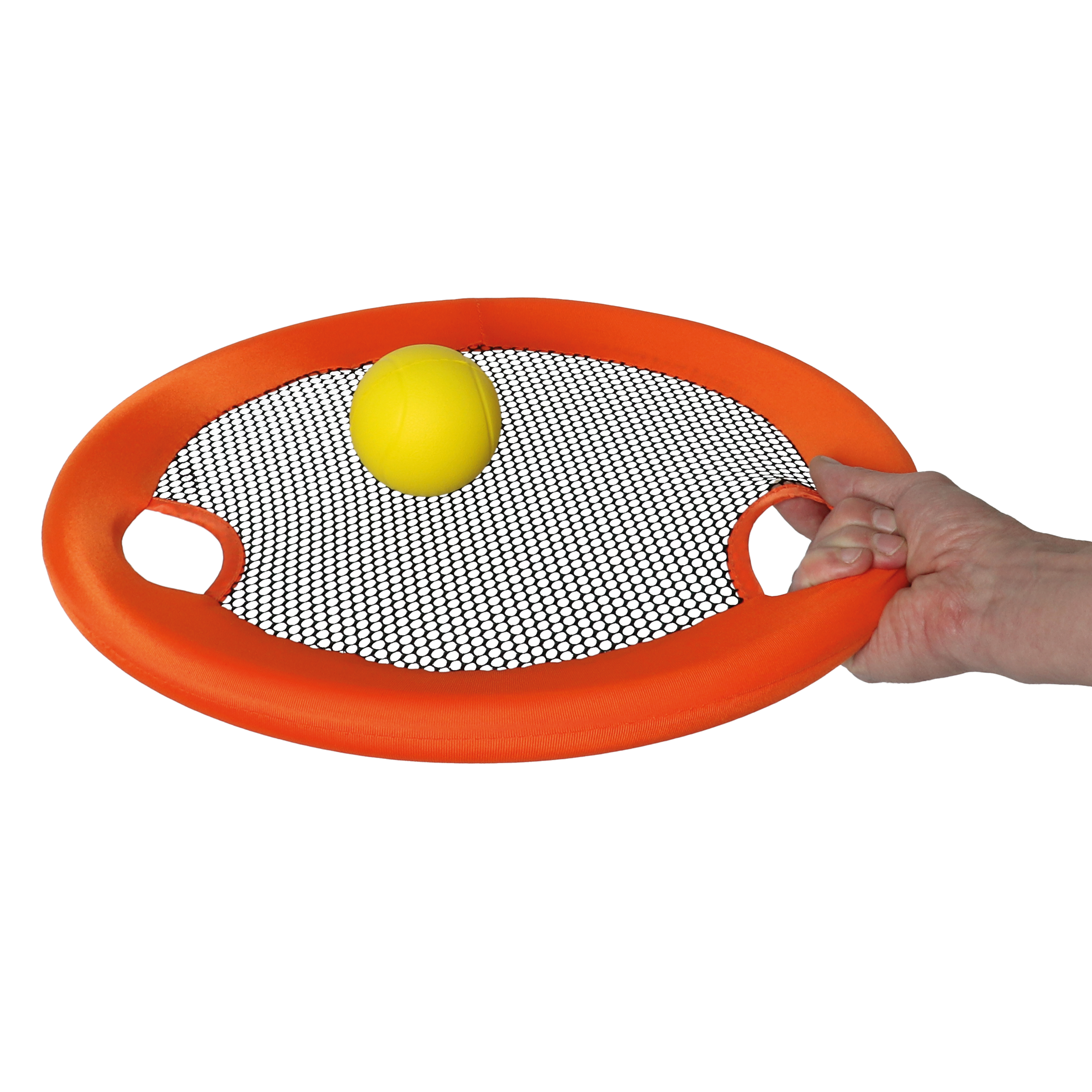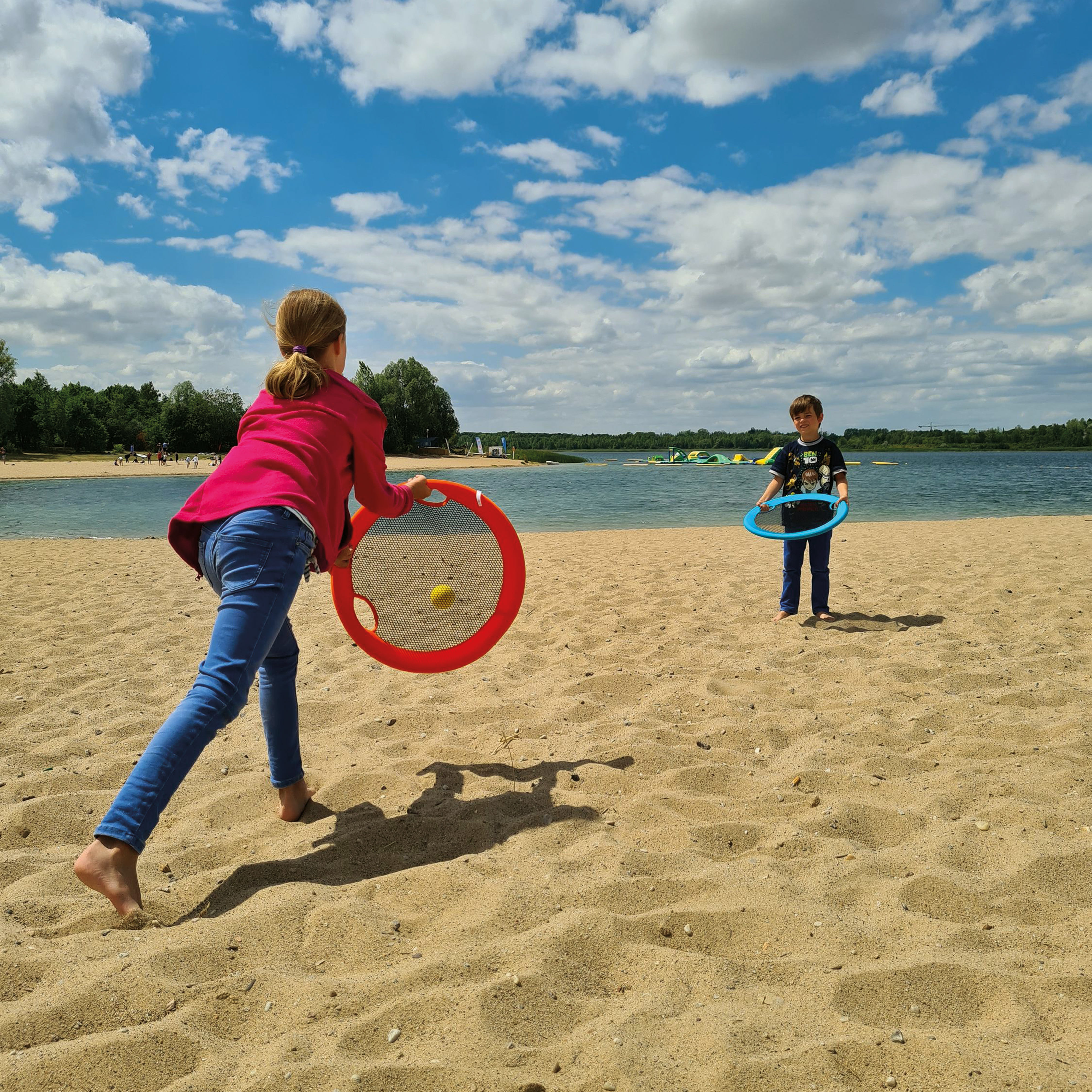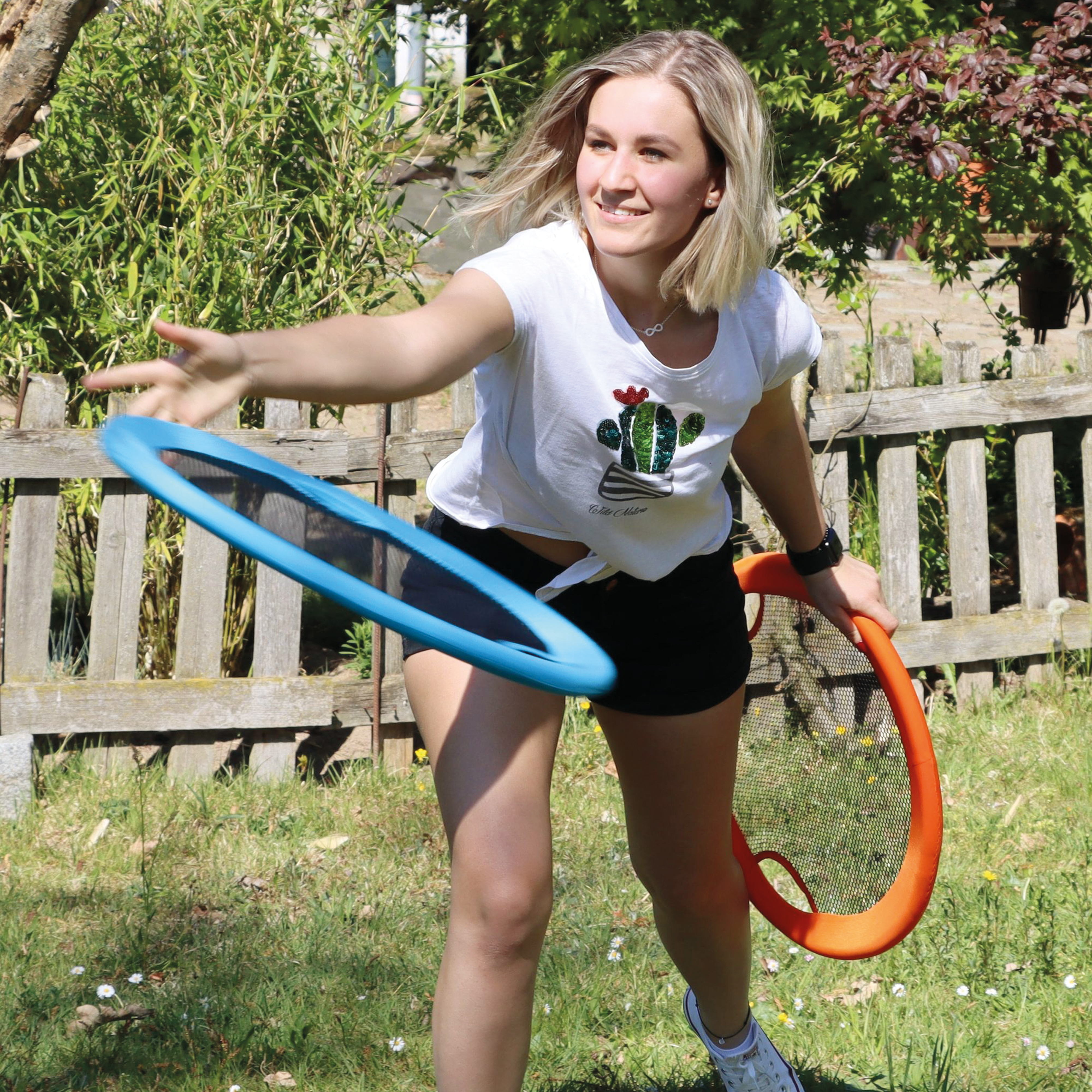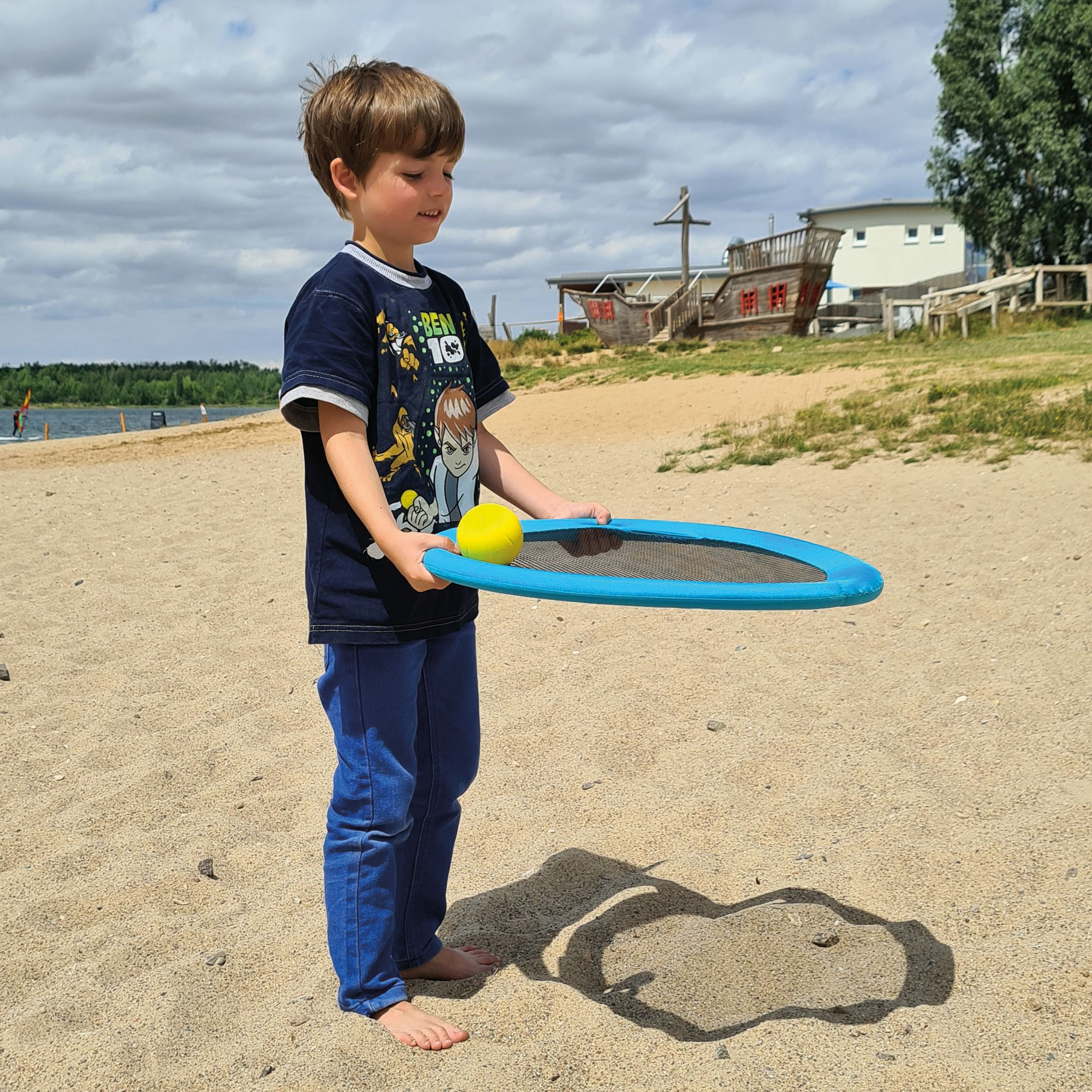 Dieses praktische Strandspiel lässt sich auf verschiedene Arten nutzen. Beim Beach-Volleyball benützt man die Netz-Scheiben als Schläger für die mitgelieferten gelben Softbälle. die zweite Möglichkeit ist, die Netz-Schläger als Wurfscheibe zu verwenden.
