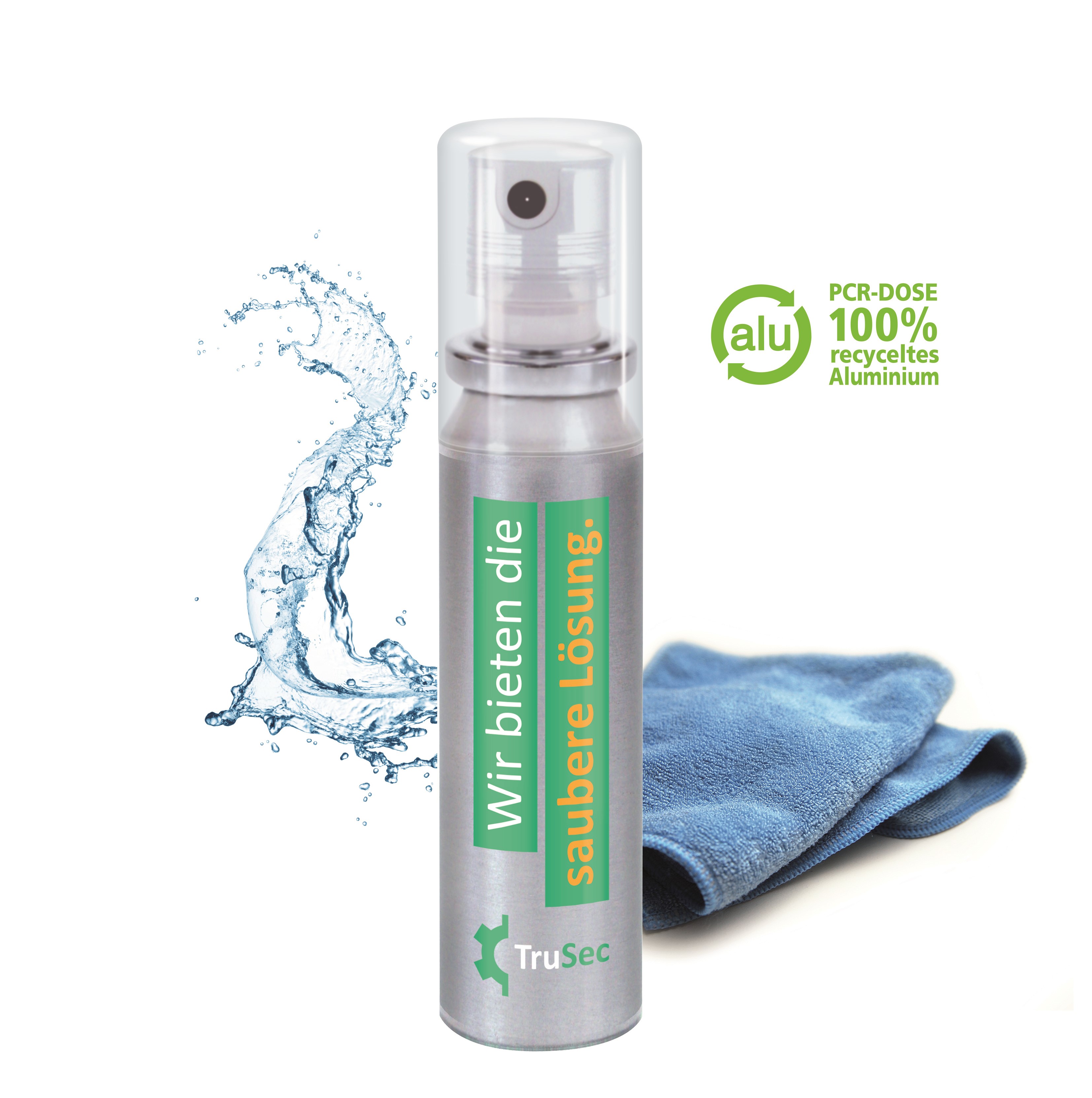20 ml Aluminium Dose aus 100% recyceltem Aluminium, gebürstet, mit transparentem Sprühkopf und transparenter Schutzkappe. Bei der Herstellung der Sprays verwenden wir für die Dosen und Kappen ausschließlich recyceltes Aluminium und PP. Beide Materialien wurden durch die "Gelbe Tonne" in Privathaushalten gesammelt und recycelt. Das Reinigungsspray entfernt materialschonend Verschmutzungen von Smartphone und Tablet sowie allen anderen Oberflächen am Arbeitsplatz. Es ist bestens geeignet für die schnelle und unkomplizierte Reinigung von Maus, Tastatur, Telefon, Laptop und Tischplatte. Anwendung ohne Wasser: Aufsprühen, kurz einwirken lassen und mit einem Tuch abwischen. Der Reiniger hinterlässt einen angenehmen, frischen Zitronenduft und einen matten Glanz. • Lösemittelfrei • Native Rohstoffe • Biologisch abbaubar • Vegan • Hergestellt in Deutschland Dekoration: Label (PE weiß, 4c CMYK + weiß