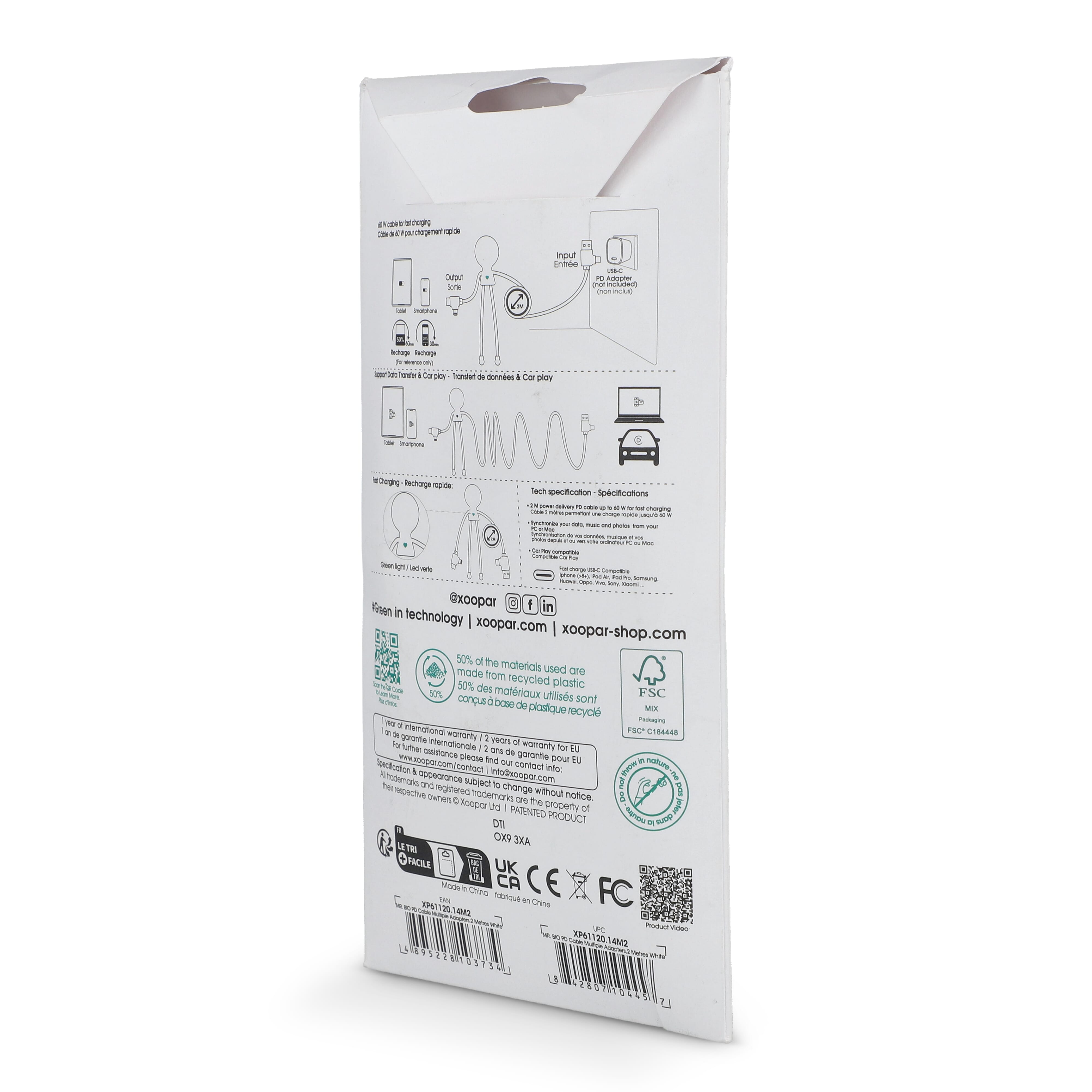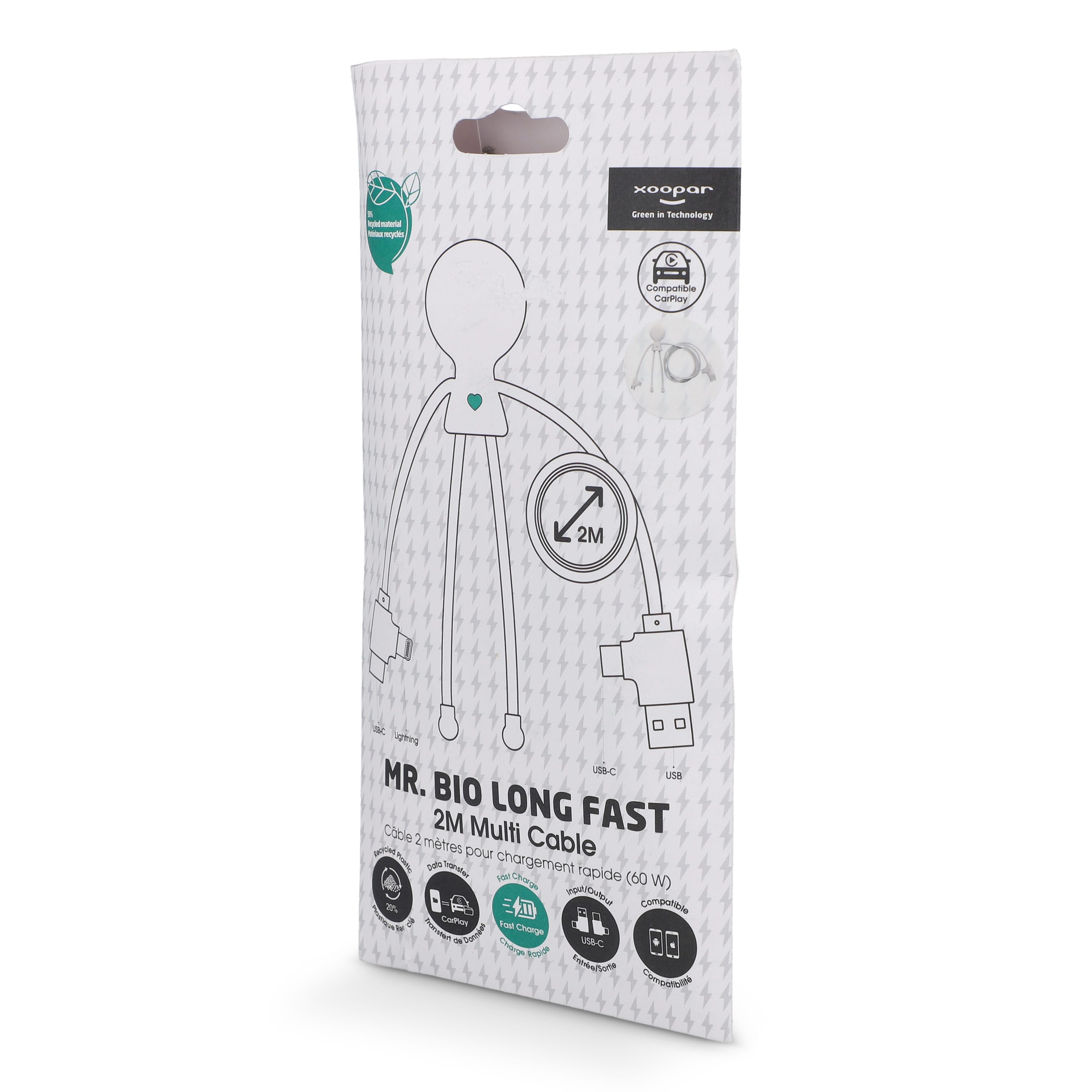 Xoopar Mr. Bio Long PD ist ein 2 Meter langes Multiladekabel mit USB-A, USB-C, Lightning und 60 W Schnellladung. Hergestellt aus 53% recyceltem Kunststoff.