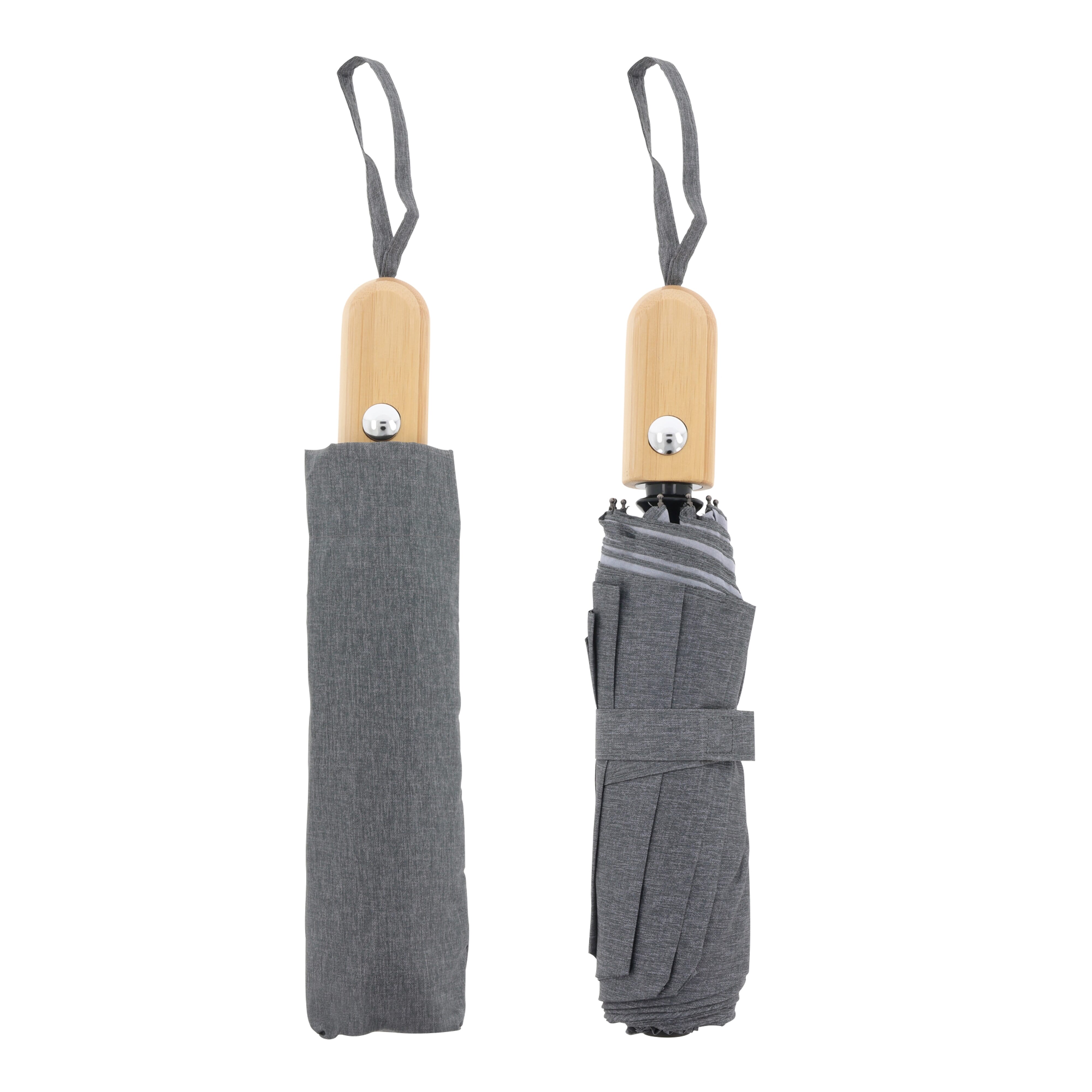 Regenschirm aus R-PET-Material mit einem stilvollen Echtholzgriff. Durch das Fiberglas-Gestänge ist der Regenschirm winddicht und er lässt sich mit einem Knopfdruck automatisch öffnen. Das melierte Material verleiht dem Modell einen luxuriösen Look. (Volltonfarbe schwarz).