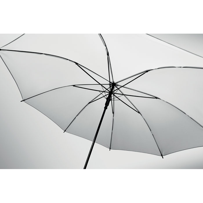 23'' Regenschirm aus 190T Pongee. Stock aus schwarz überzogenem Metall und Stangen aus Fiberglas. Krone und Spitzen aus Kunststoff. Gebogener Griff aus gummiertem PP. Automatische Öffnung, manuelle Schließung.