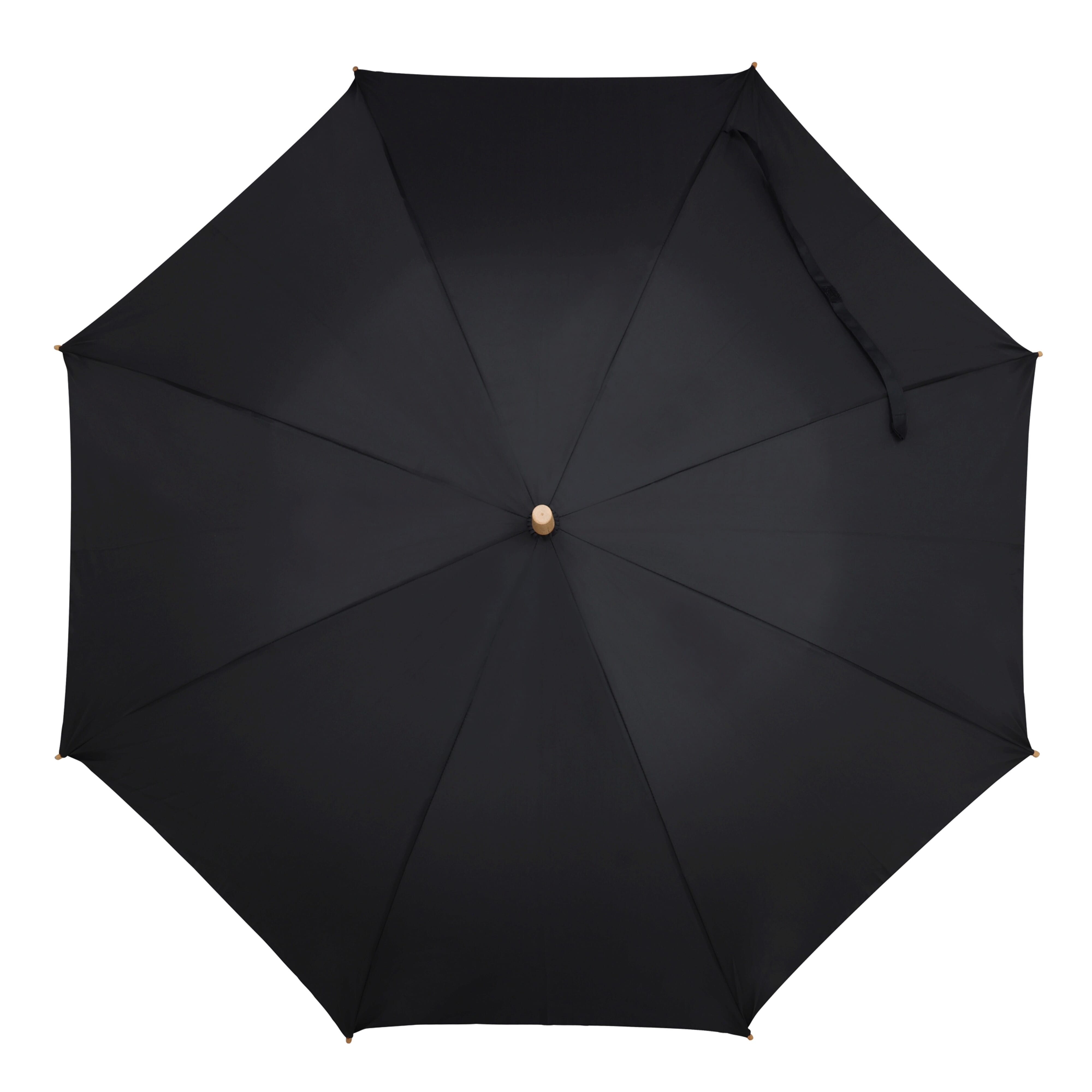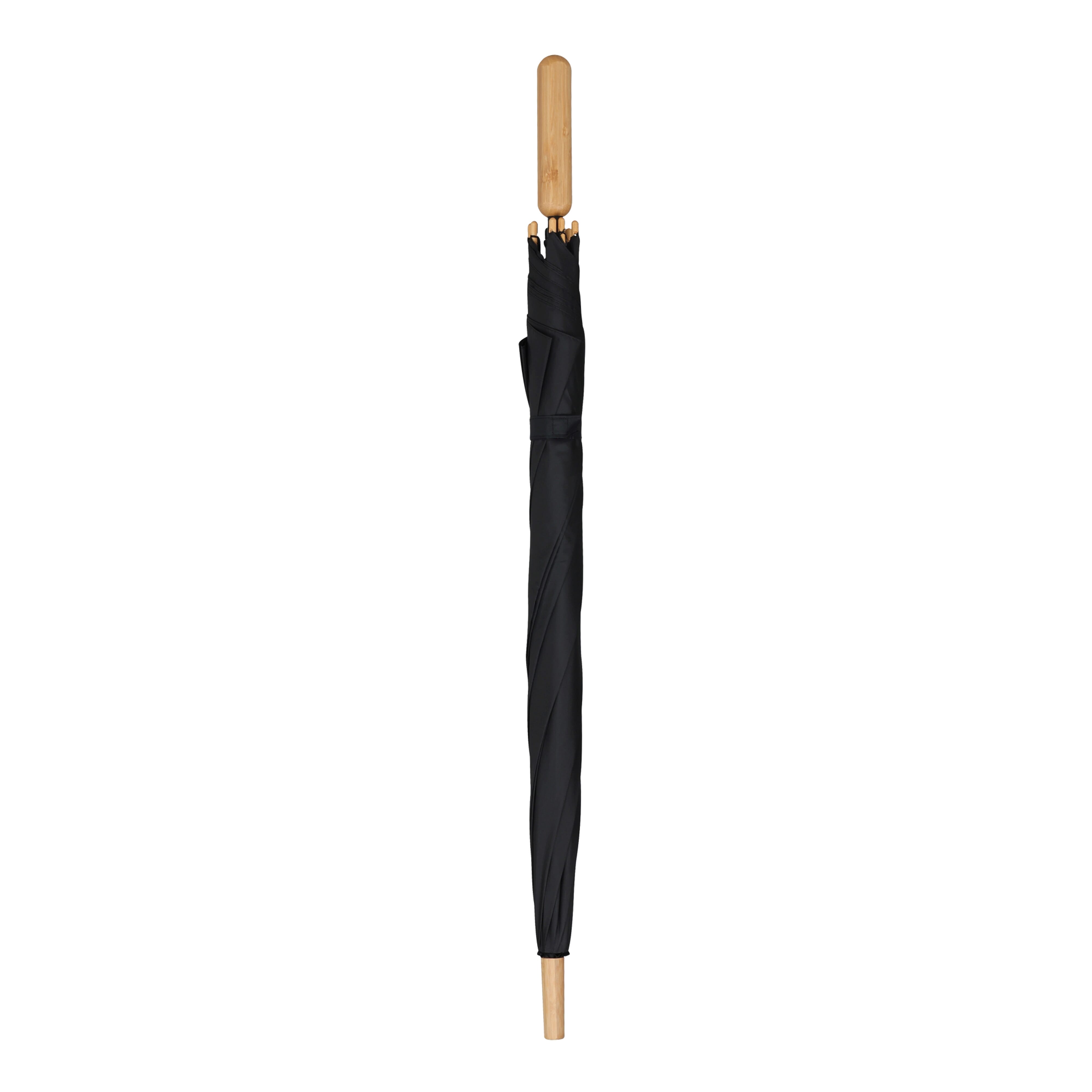 Stockschirm aus R-PET-Material mit einem eleganten Holzgriff. Durch den stabilen Fiberglasrahmen ist der Schirm sturmsicher. Die Spitzen sind aus Bambus und der Schaft aus Metall, somit können alle Elemente recycelt werden. Das melierte Material verleiht dem Modell einen luxuriösen Look.