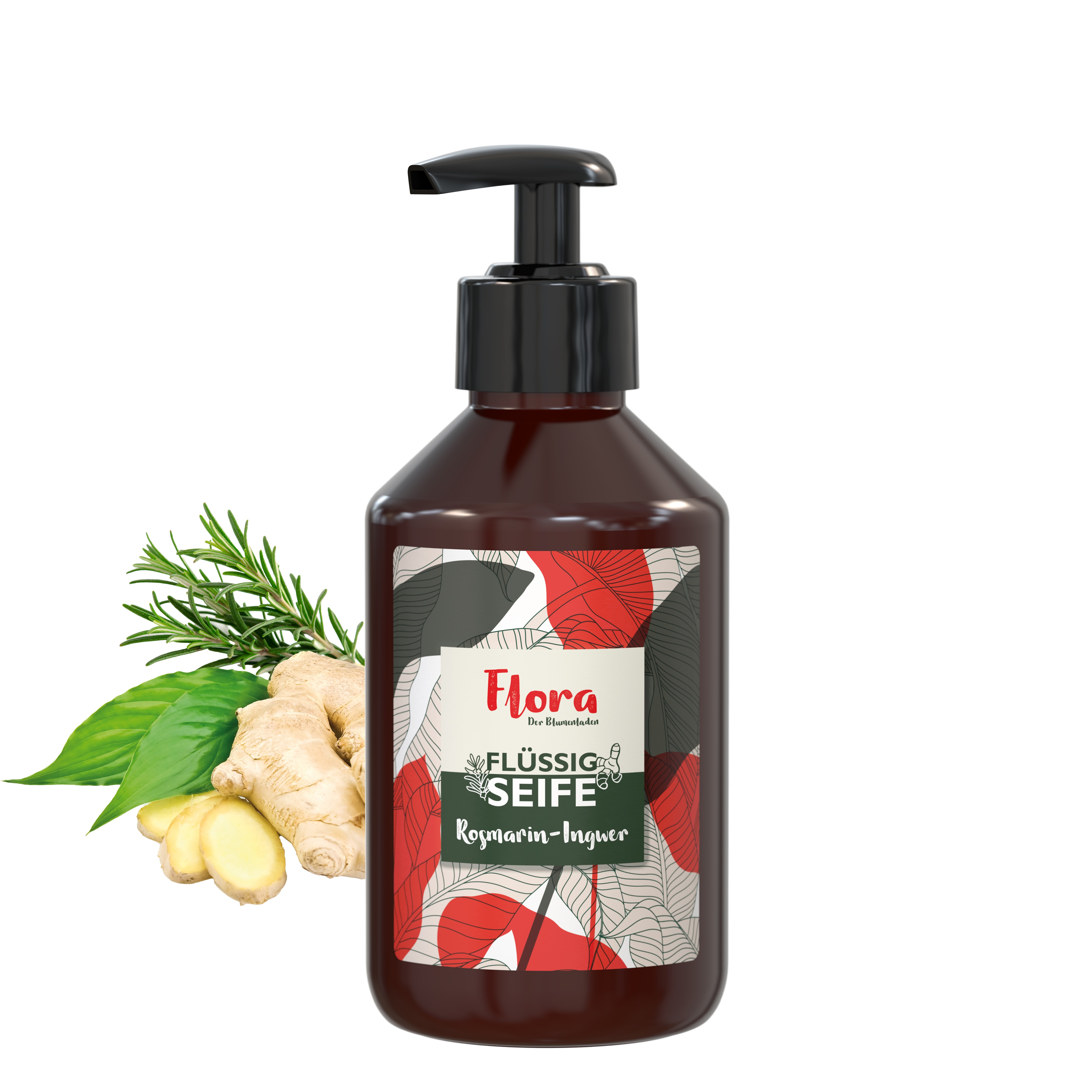 Flüssigseife "Rosmarin-Ingwer", 250 ml Pumpspender Braune Flasche, hergestellt aus 100% recyceltem PET, mit schwarzer Pumpe. Nachfüllbar. Der Mix aus Rosmarin und Ingwer regt mit seinem umwerfend würzig-frischen Duft die Sinne an und macht das Händewaschen zum Erlebnis! Es entsteht ein angenehmer Schaum, der die Hände schonend reinigt und zugleich pflegt. Die Flüssigseife macht sich auch in der Dusche hervorragend: Durch den Spender aus recyceltem PET besteht keine Bruchgefahr und man kann die Seife auch prima als Duschgel verwenden. • Vegan • pH-hautneutral • Ohne Parabene • Dermatologisch getestet "Sehr gut hautverträglich" • Hergestellt in Deutschland Dekoration: Body Label: Mattes Etikett (weiß) auf Vorder- und Rückseite, Druck 4c CMYK. Füllung: 250 ml