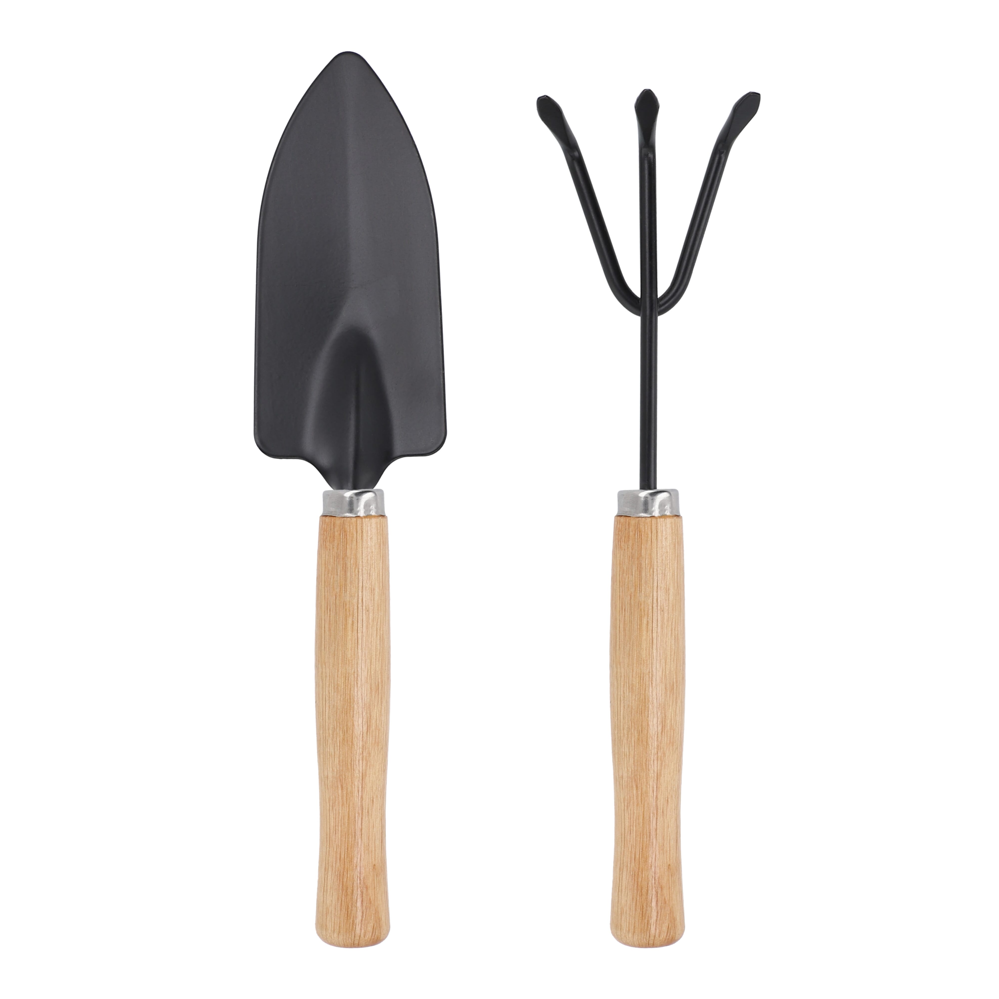 Tragbare Gartenharke und Spaten aus A3-Stahl und Eukalyptusholz, ideal für kleine Gärten und Zimmerpflanzen.