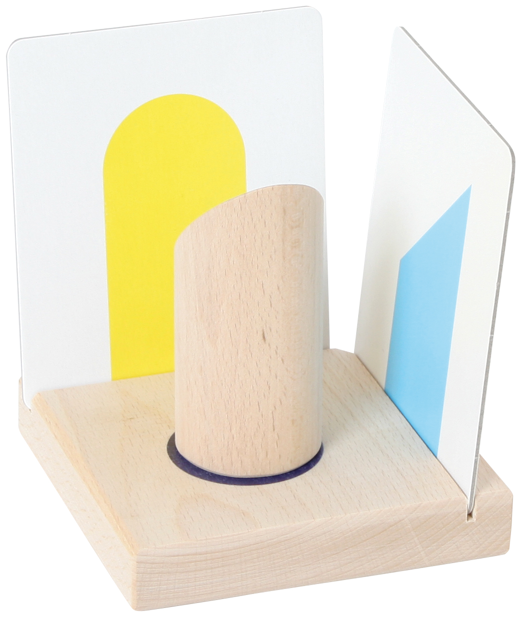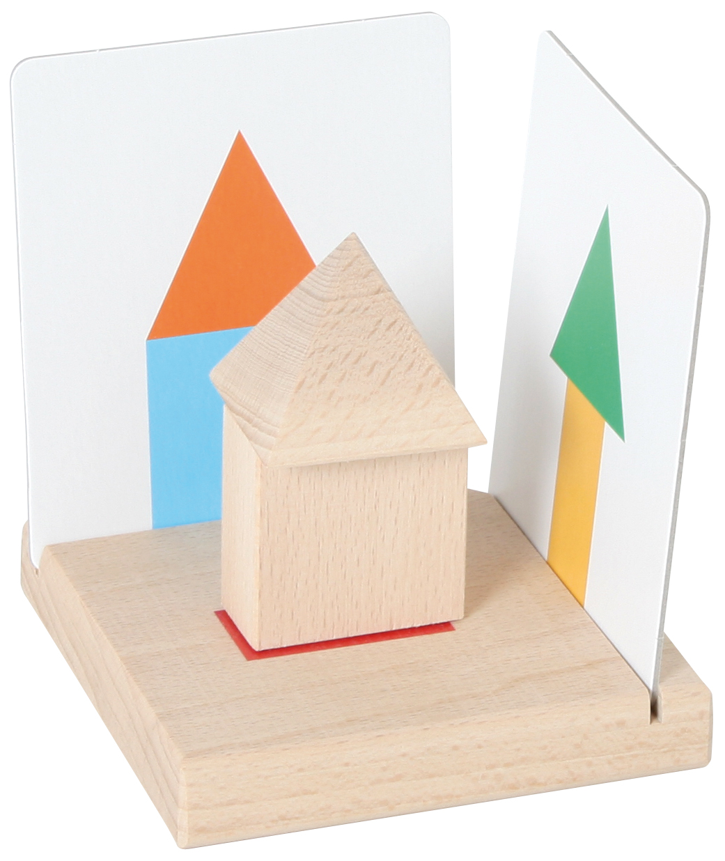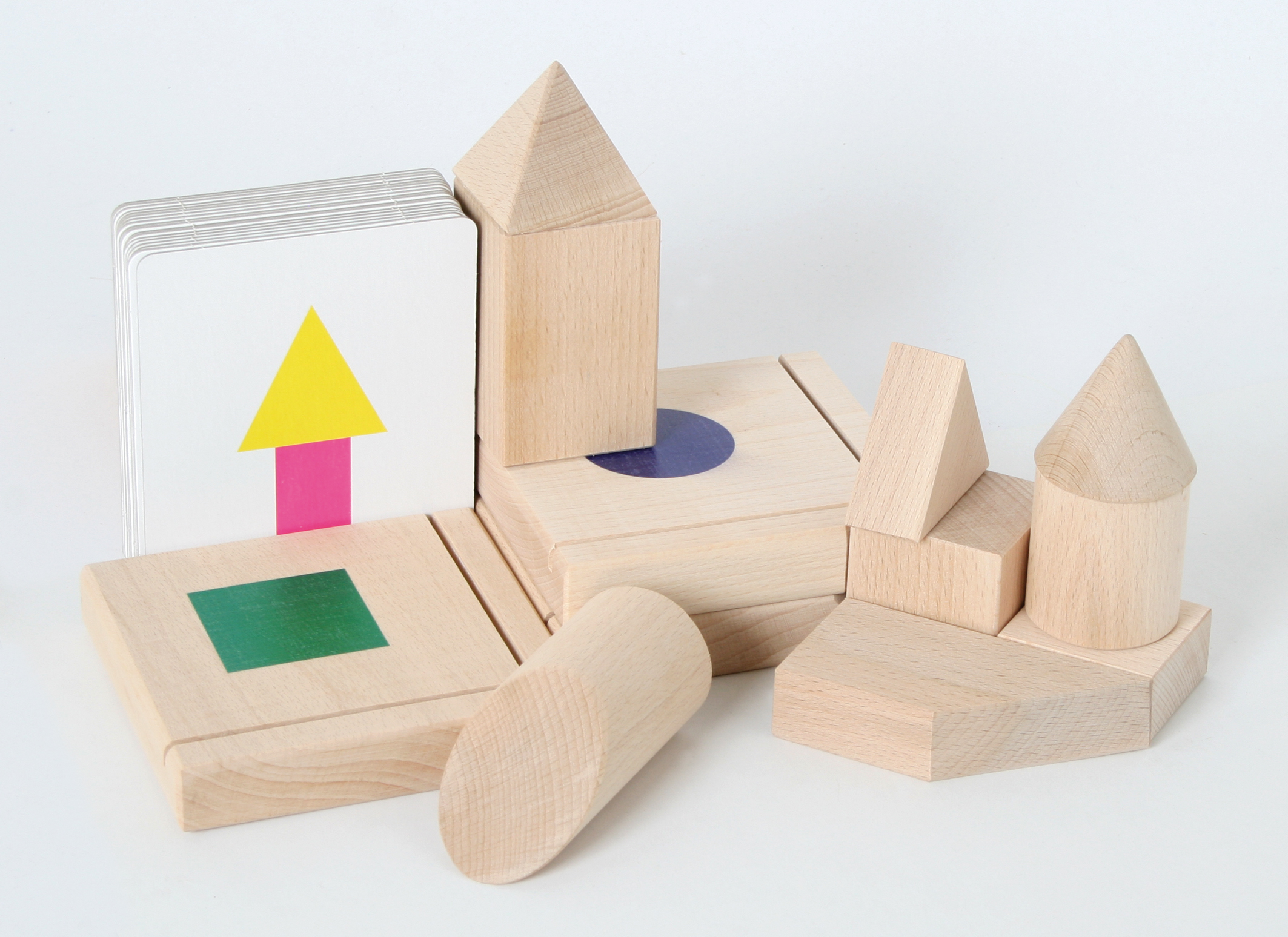 Das Material besteht aus drei hölzernen Grundplatten, neun geometrischen Körpern aus Holz und 18 Bildkarten aus Karton. Damit lernt man verschiedene geometrische Körper kennen. Man betrachtet sie einzeln, stellt zwei aufeinander, etc. Zu jedem Körper gilt es dann, die passende Grundfläche zu finden. Ihren beiden Seitenflächen muss man je eine Karte mit dem entsprechenden Schattenbild zuordnen. Ab 5 Jahren. Größe einer Grundplatte: 11 x 11 x 2 cm.