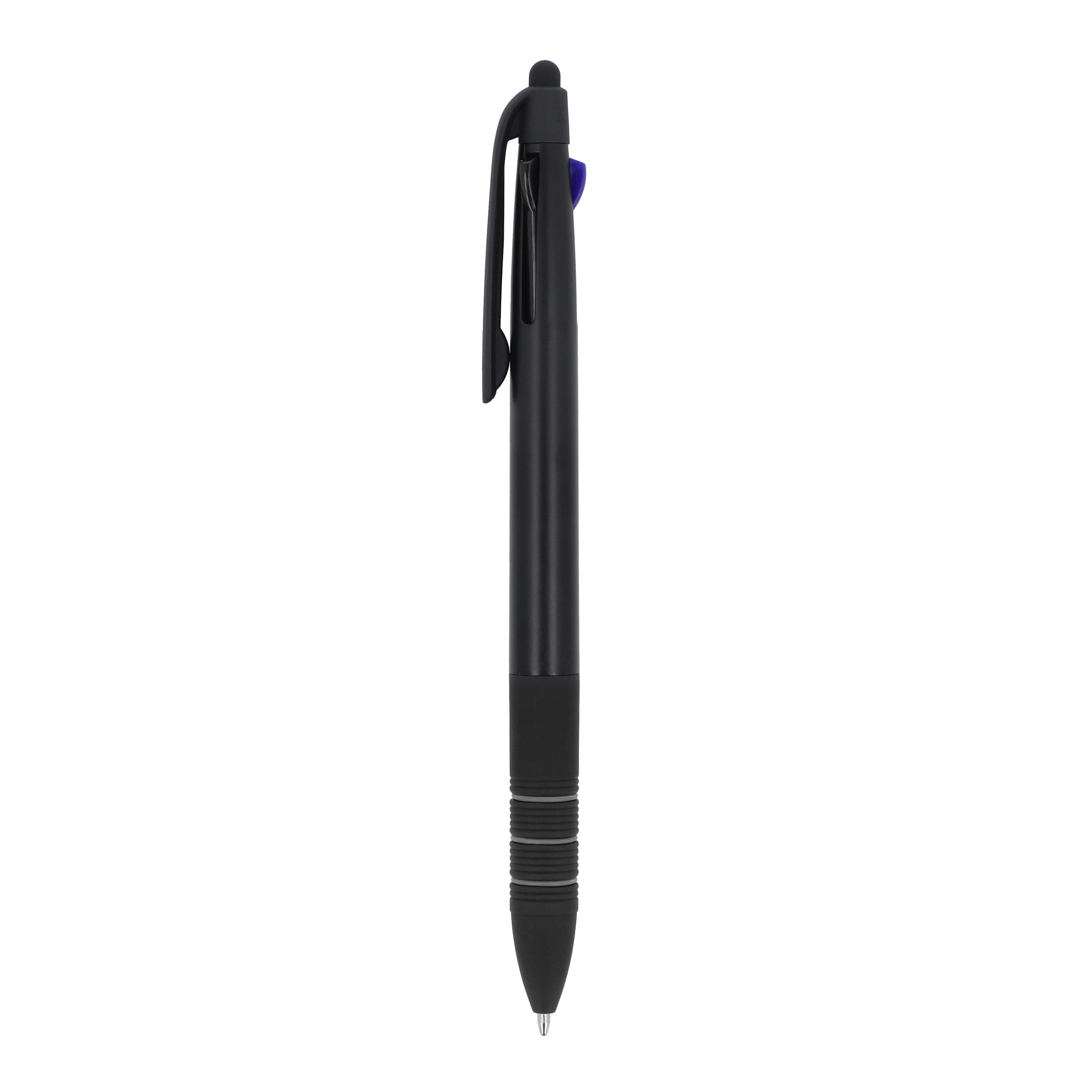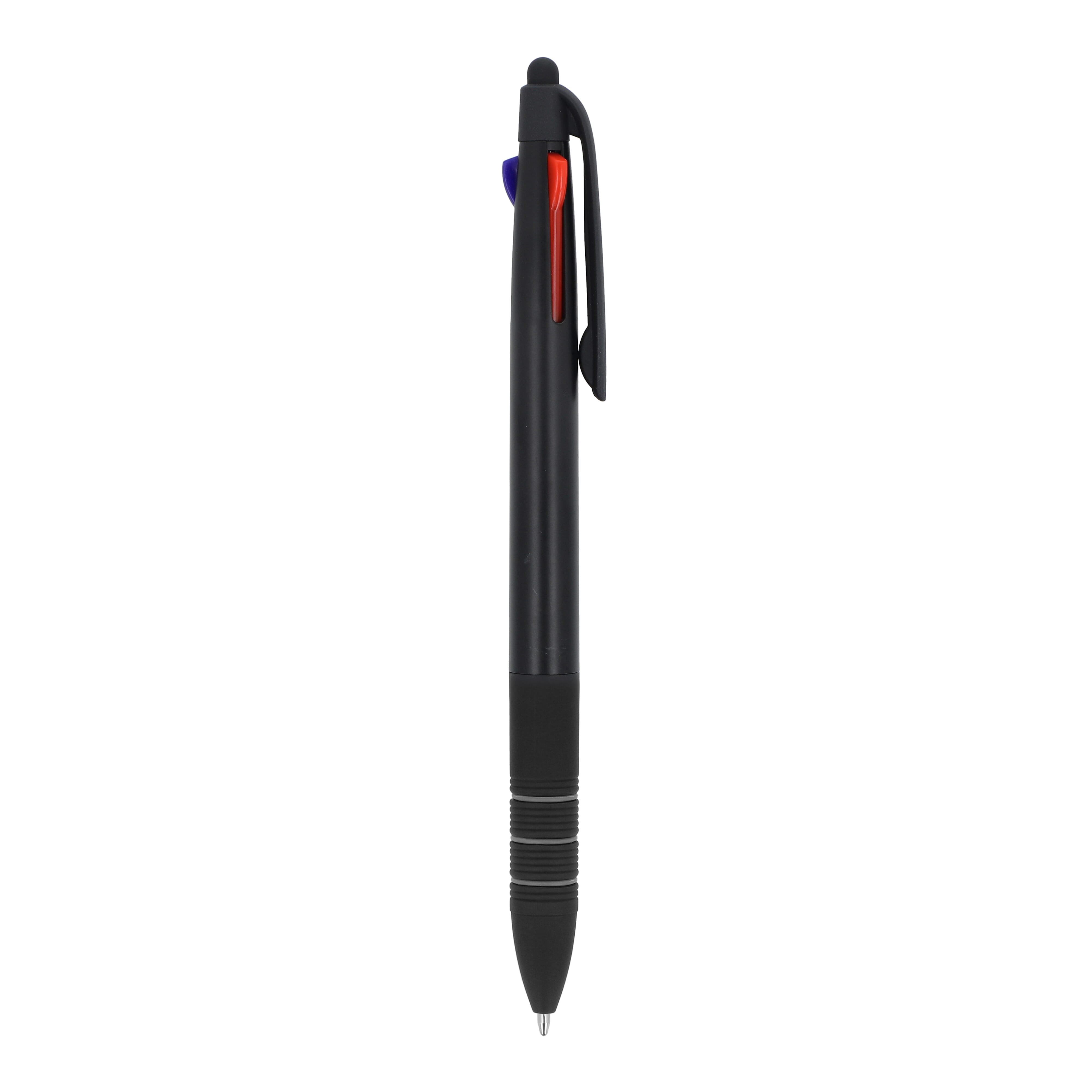 3-farbiger Metallic-Kugelschreiber mit Stylus und weichem Ergogriff. Die Schreibfarben sind Schwarz, Blau und Rot.
