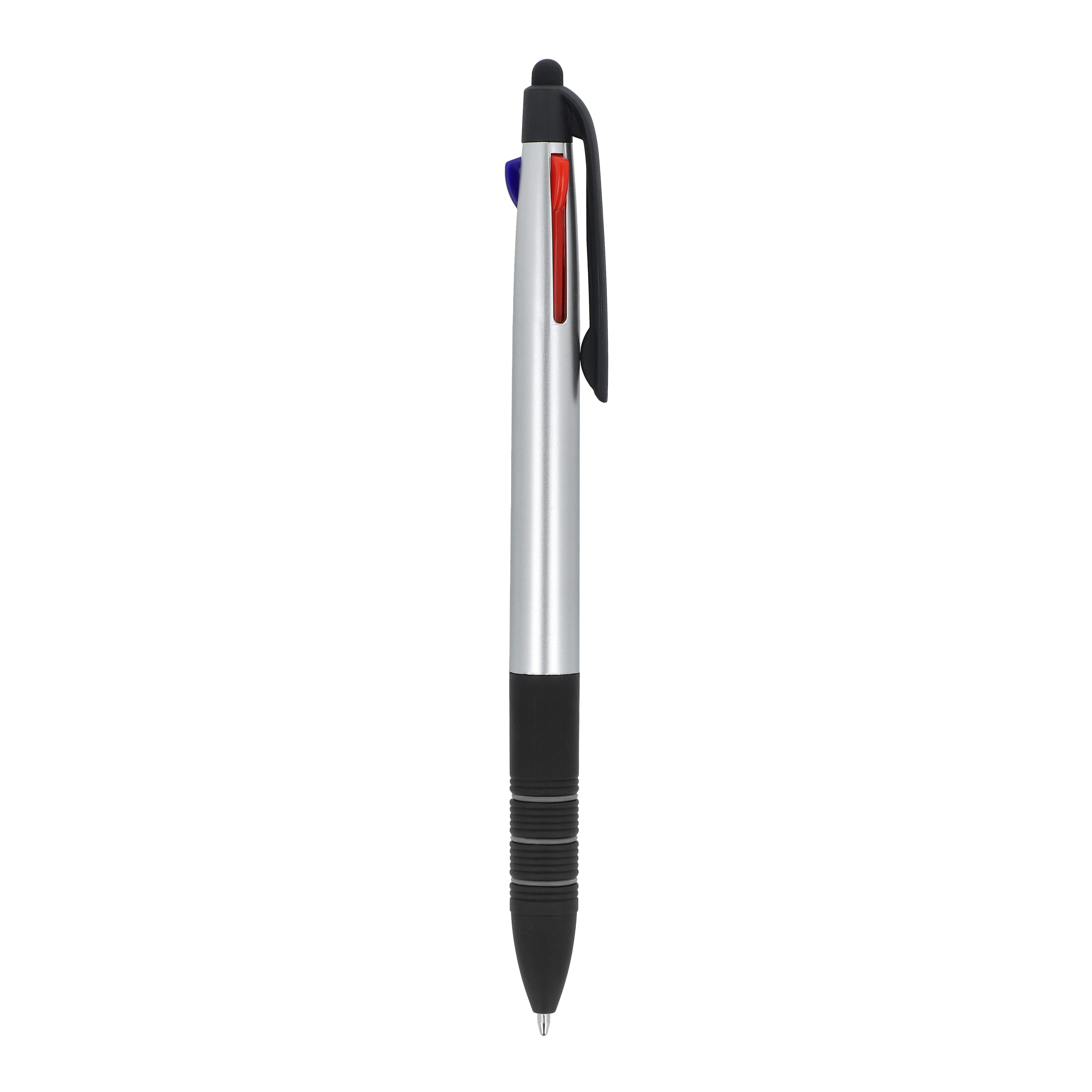 3-farbiger Metallic-Kugelschreiber mit Stylus und weichem Ergogriff. Die Schreibfarben sind Schwarz, Blau und Rot.