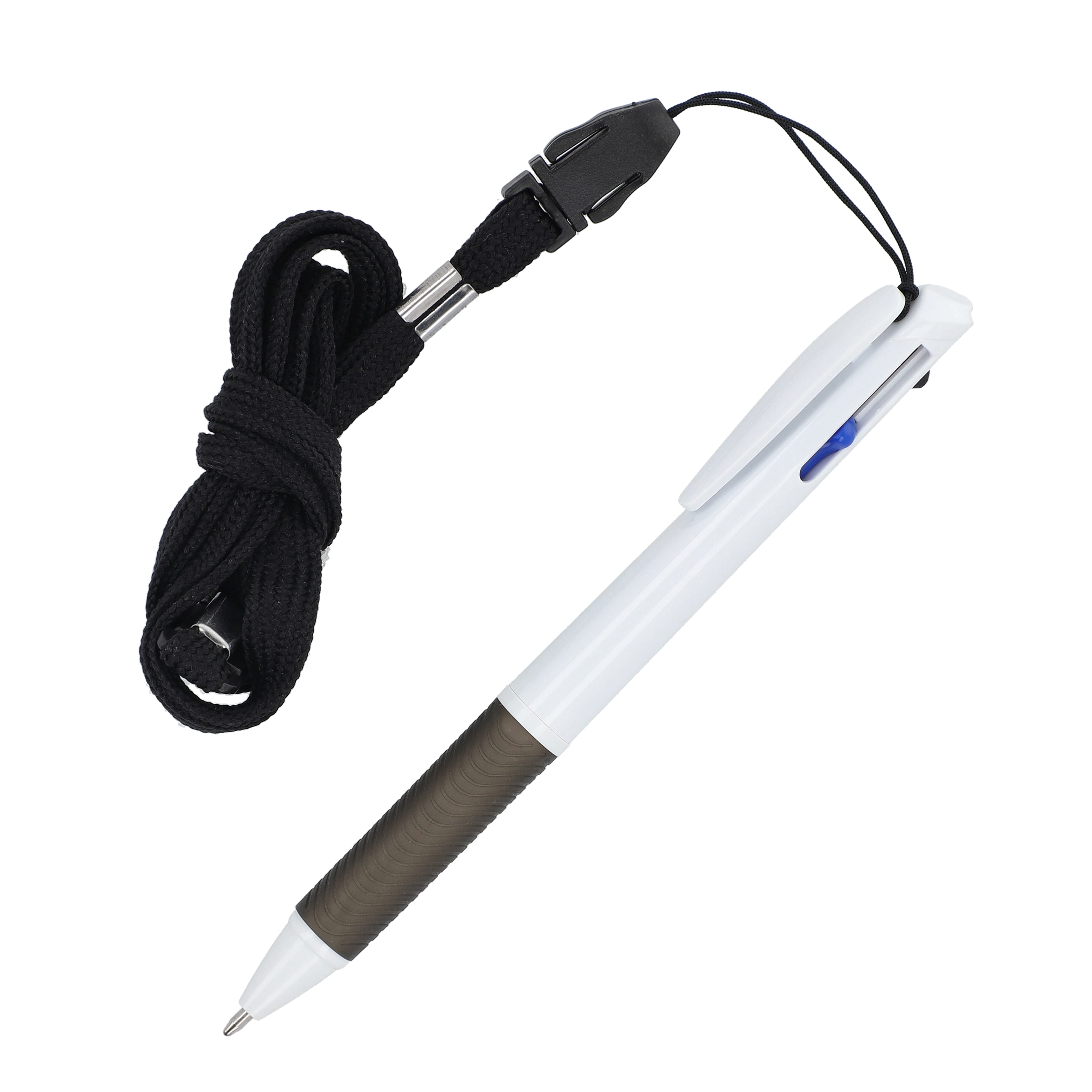 3-farbiger Kugelschreiber mit Griffzone und Schlüsselband. Die Schreibfarben sind Blau, Schwarz und Rot.