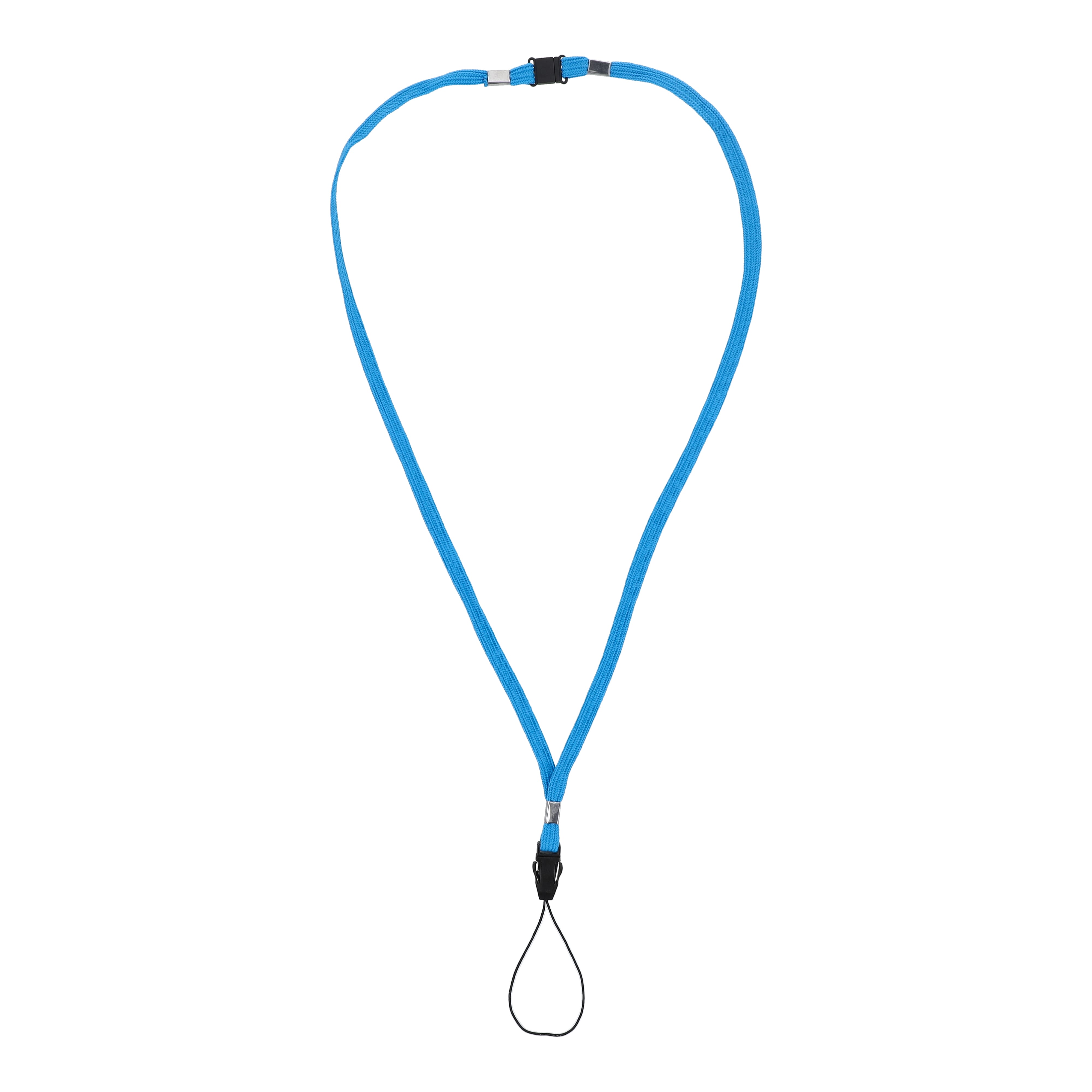 3-farbiger Kugelschreiber mit Griffzone und Schlüsselband. Die Schreibfarben sind Blau, Schwarz und Rot.