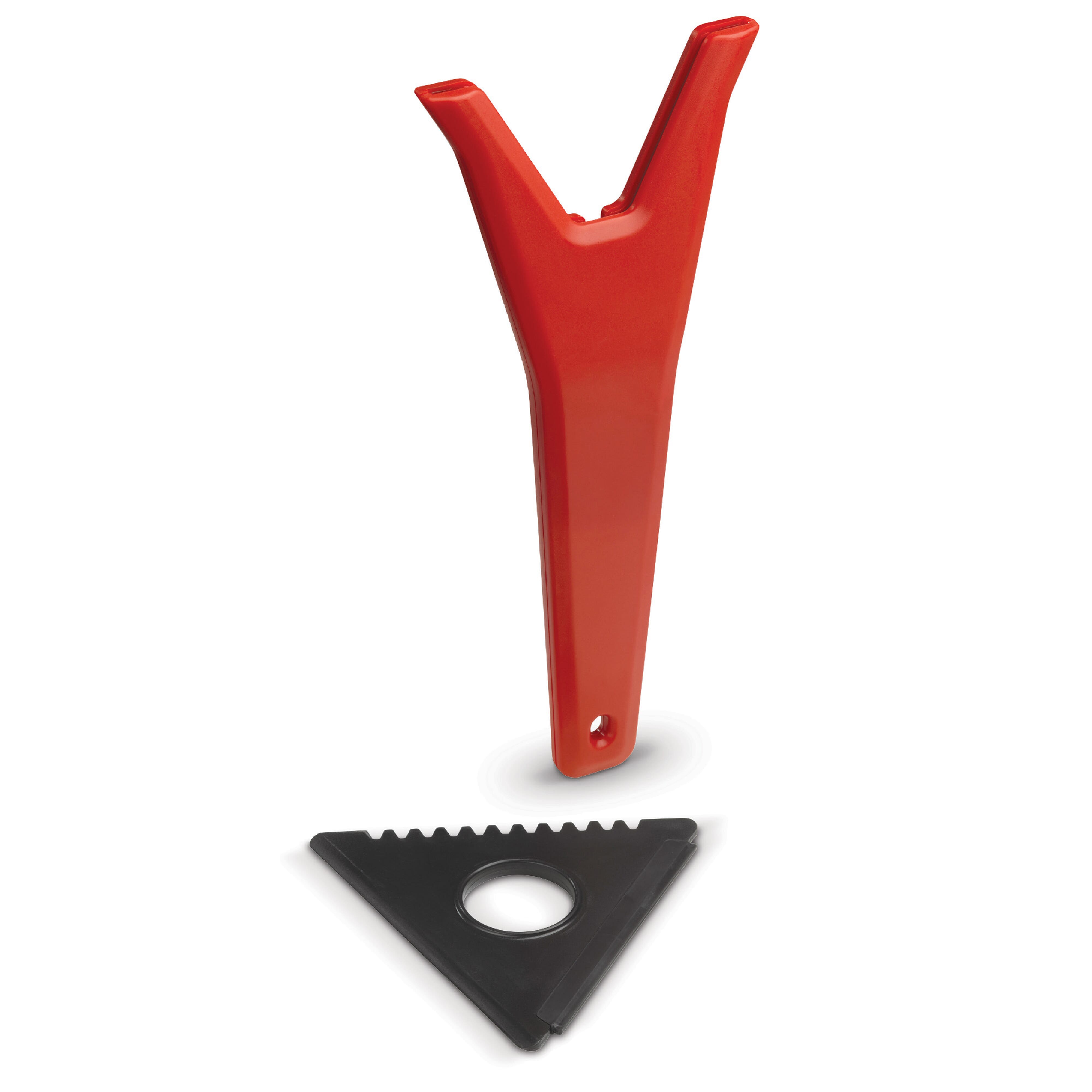 Handlicher Eiskratzer mit austauschbarem Dreieck zum Entfernen von Schnee, Eis und Kondenswasser. Der Griff hat eine große Druckfläche für ein Logo.