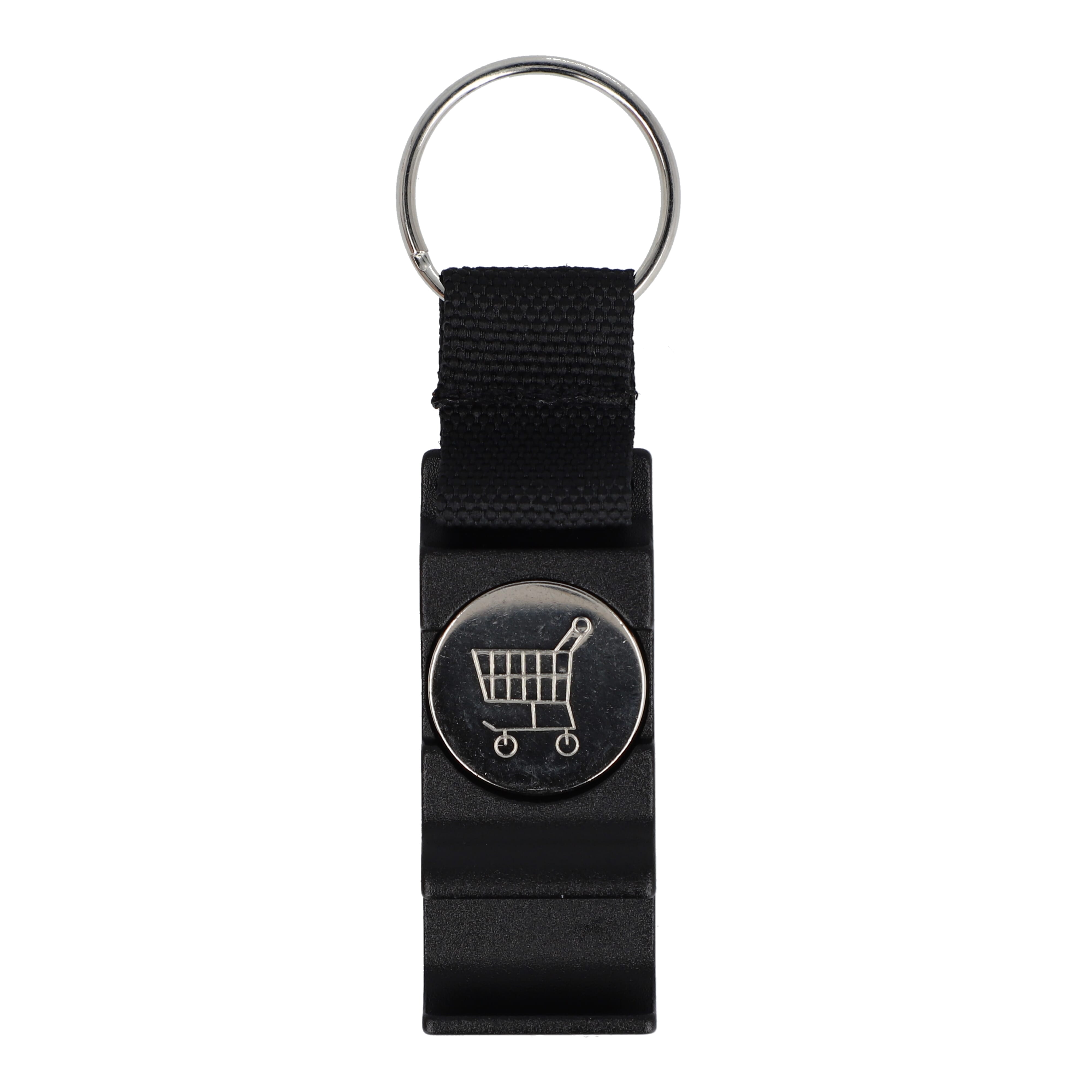 3-in-1-Schlüsselanhänger aus Aluminium mit Flaschenöffner, Handyhalter und abnehmbarer Einkaufswagenchip, kompatibel mit den meisten westeuropäischen Einkaufswagen. Ein kompaktes und praktisches Werbegeschenk.
