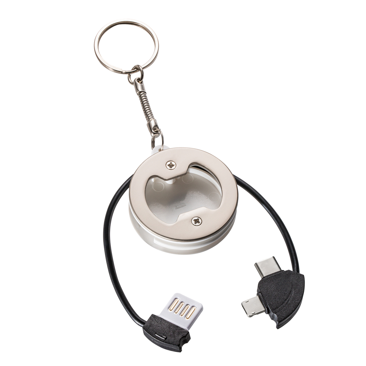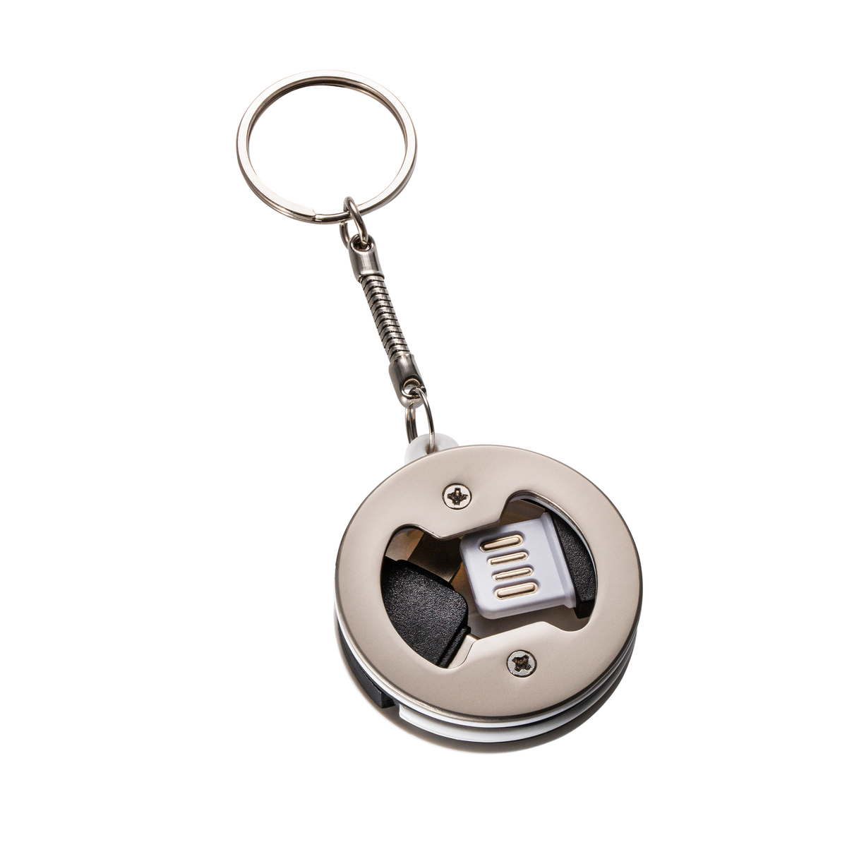 Ein praktisches 3-in-1 Ladekabel, direkt am Schlüsselbund. Dezent verbirgt sich in diesem Schlüsselanhänger ein Ladekabel, welches das Laden von USB auf Micro-USB oder für 5 Pin für Apple und USB-C erlaubt. Zusätzlich ist auch ein Flaschenöffner enthalten. Dank der großen Veredelungsfläche auf der Vorderseite, können Sie diesen Schlüsselanhänger komplett und vierfarbig mit Ihrem Logo / Motiv bedrucken.