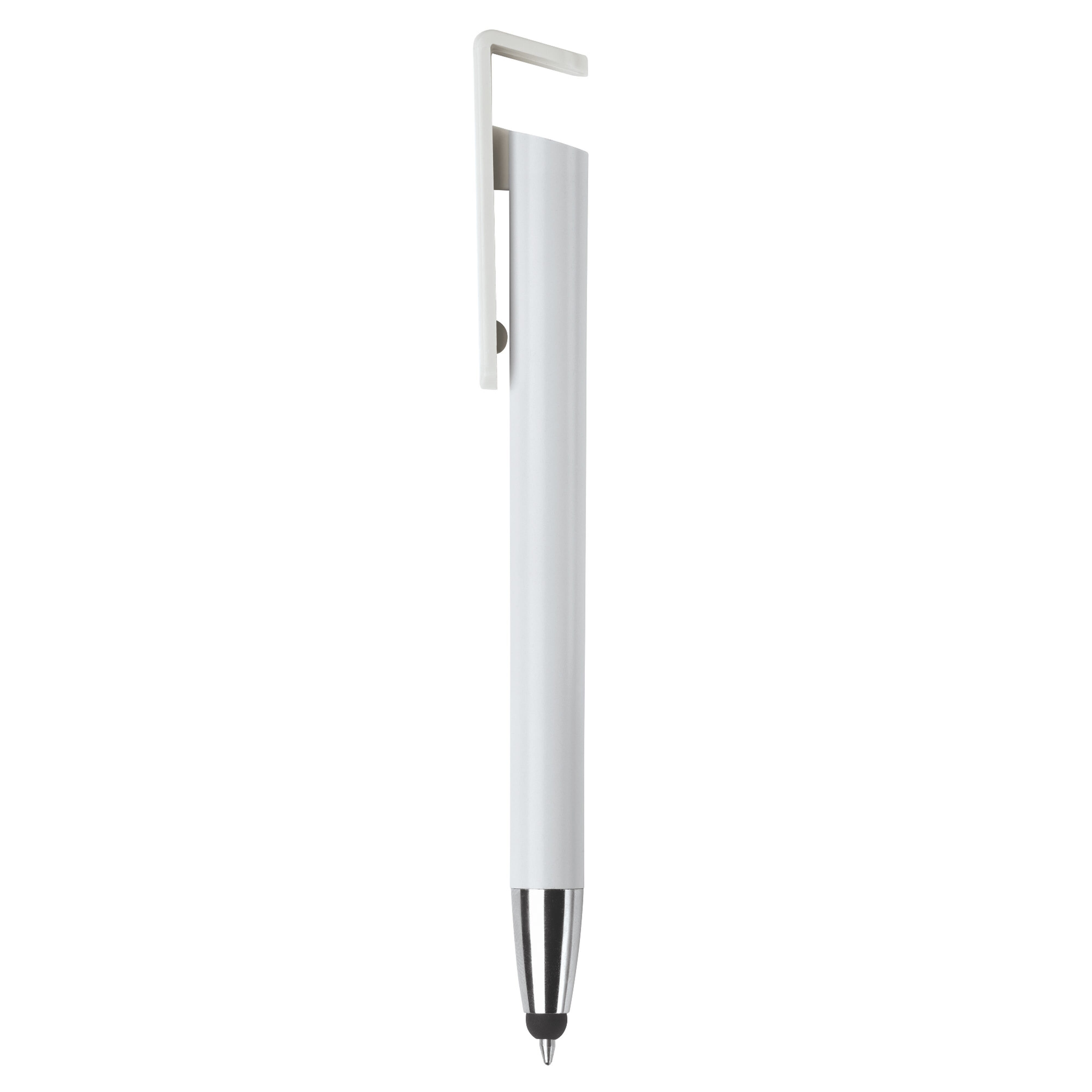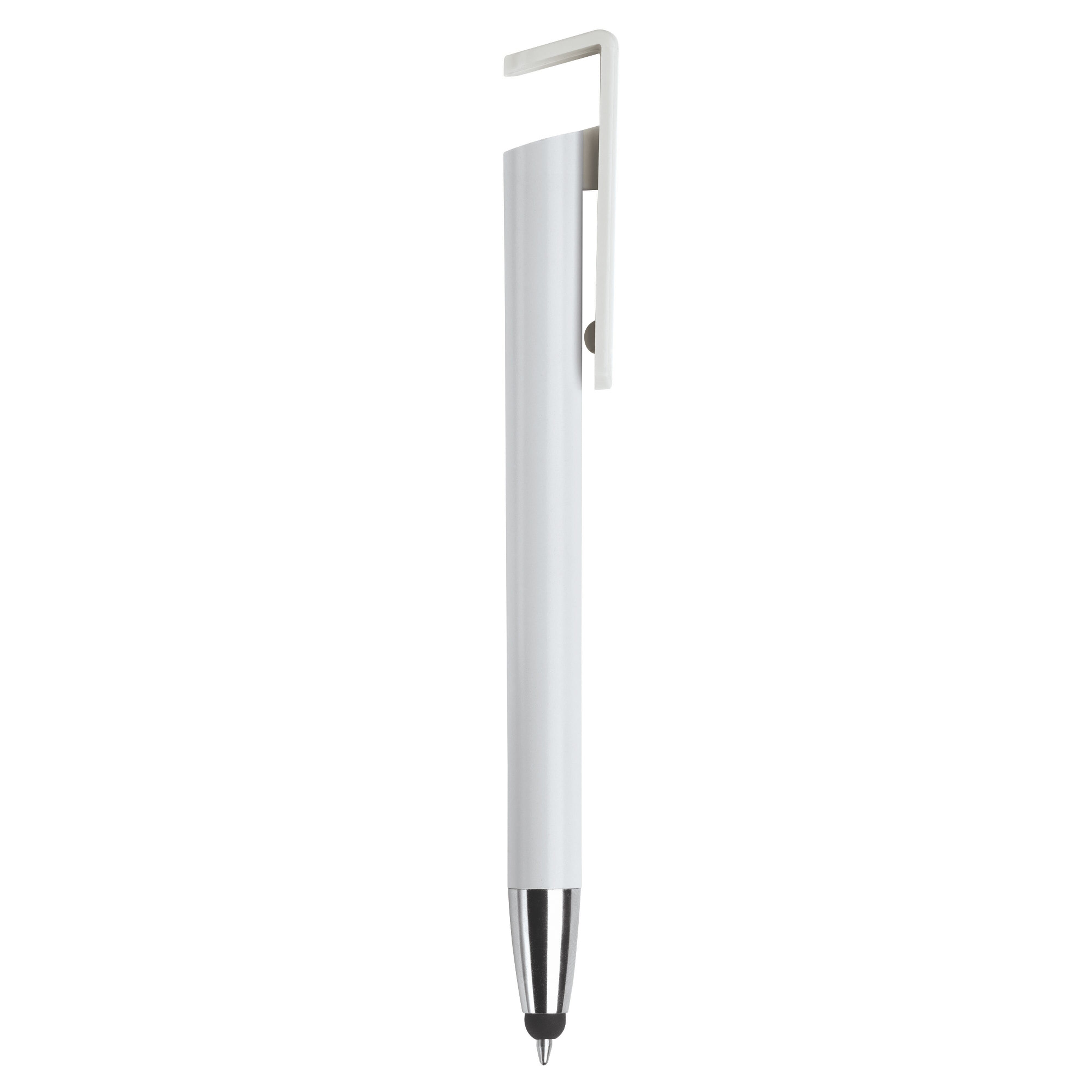 Ein moderner 3-in-1-Kugelschreiber mit Stylus und Telefonhalter. Ein sehr schönes Give Away in einem glatten Design. Blauschreibend.