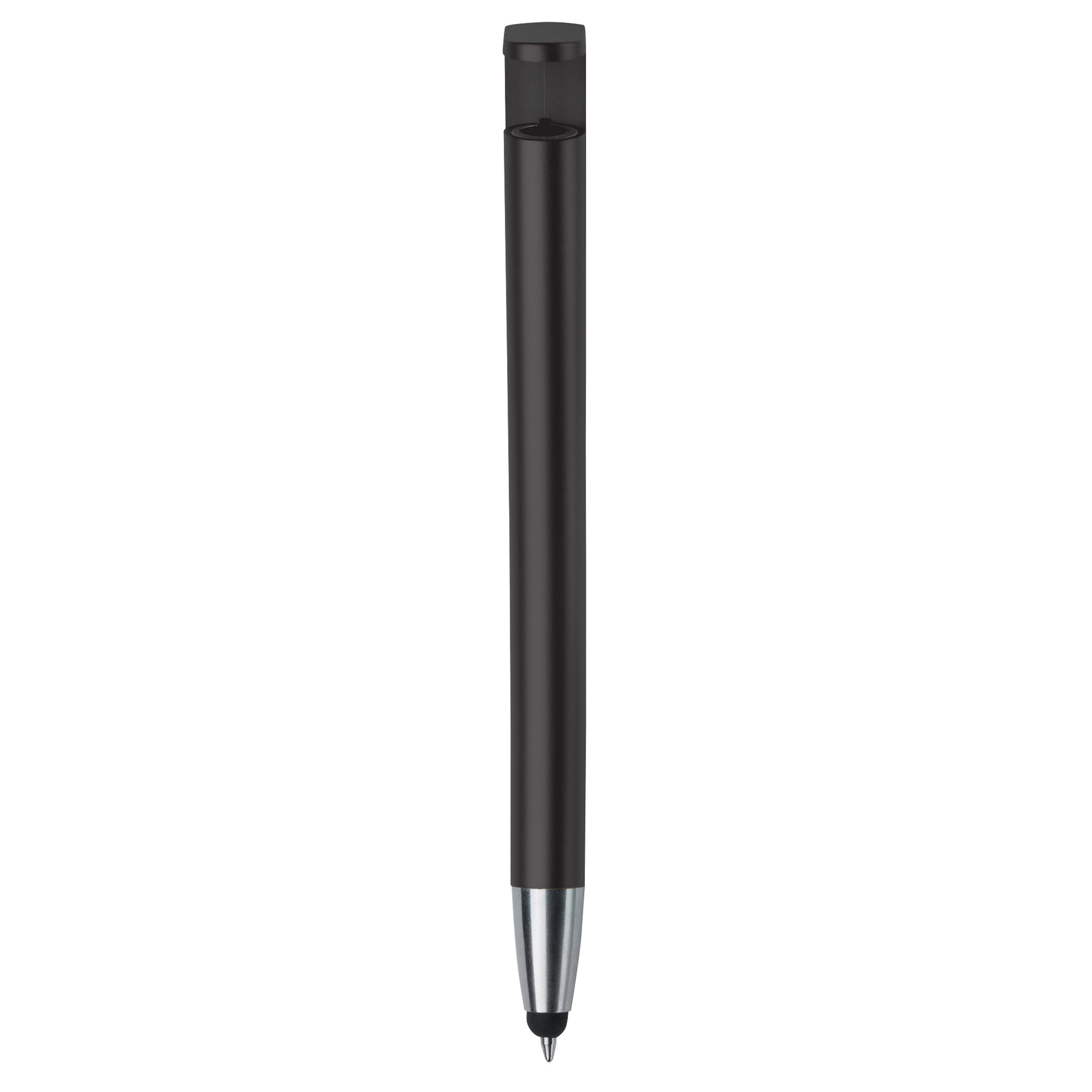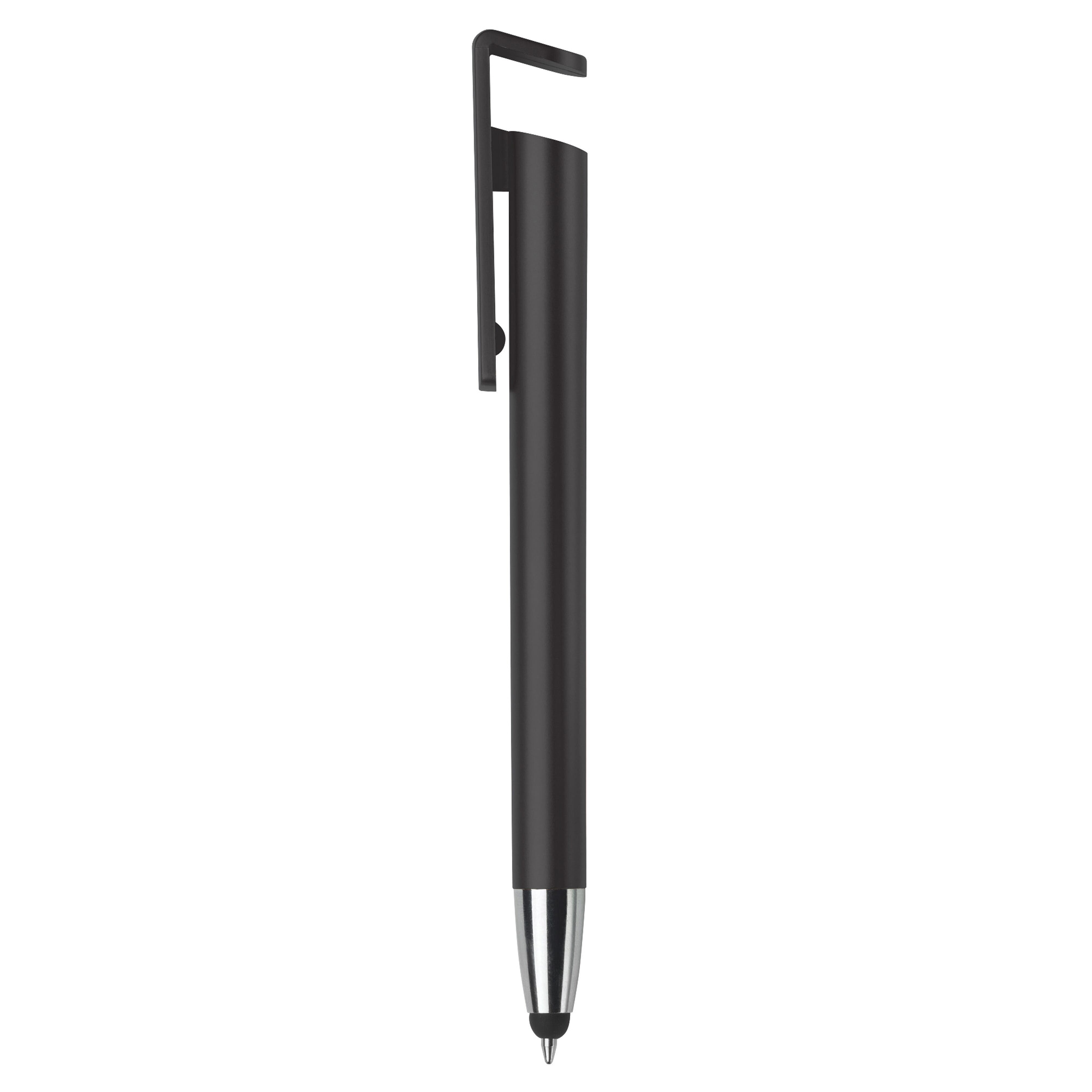 Ein moderner 3-in-1-Kugelschreiber mit Stylus und Telefonhalter. Ein sehr schönes Give Away in einem glatten Design. Blauschreibend.
