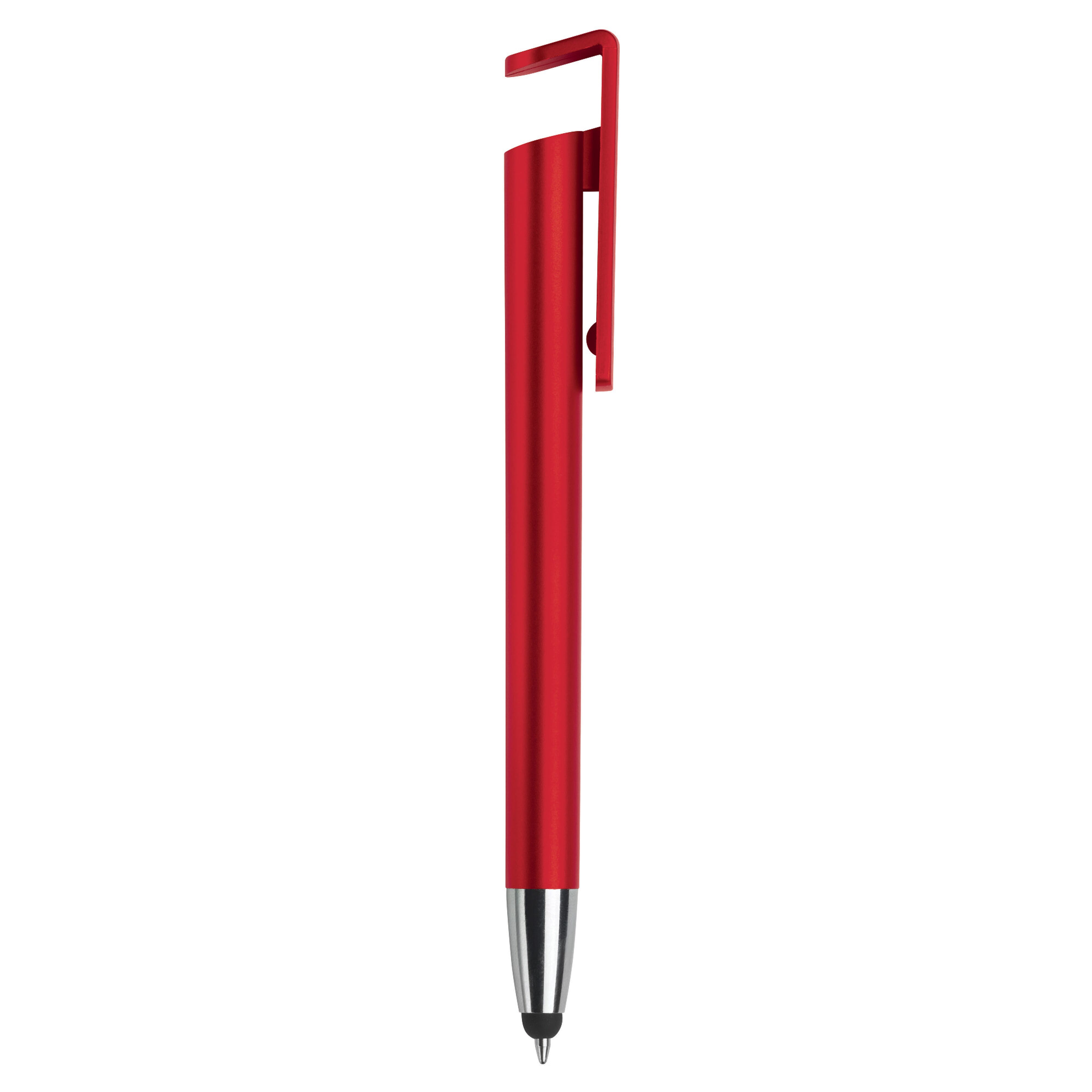 Ein moderner 3-in-1-Kugelschreiber mit Stylus und Telefonhalter. Ein sehr schönes Give Away in einem glatten Design. Blauschreibend.