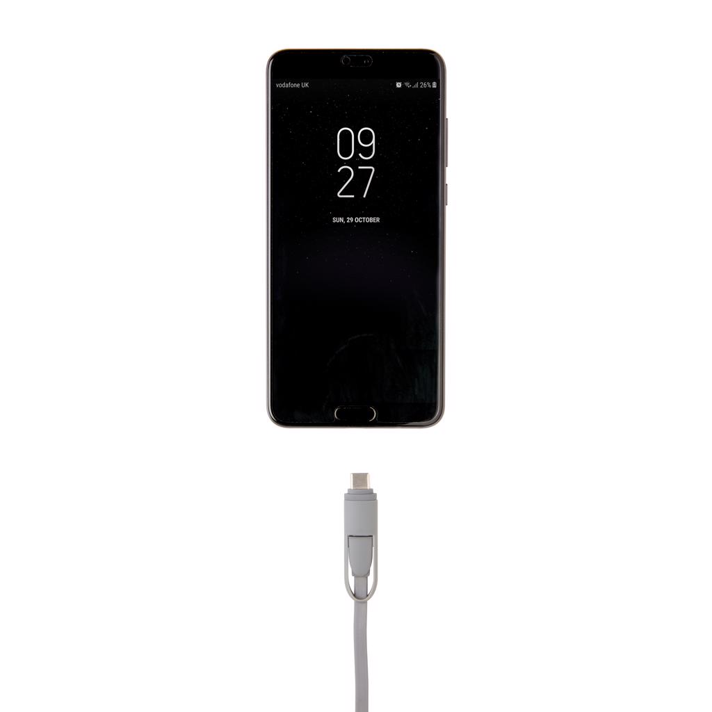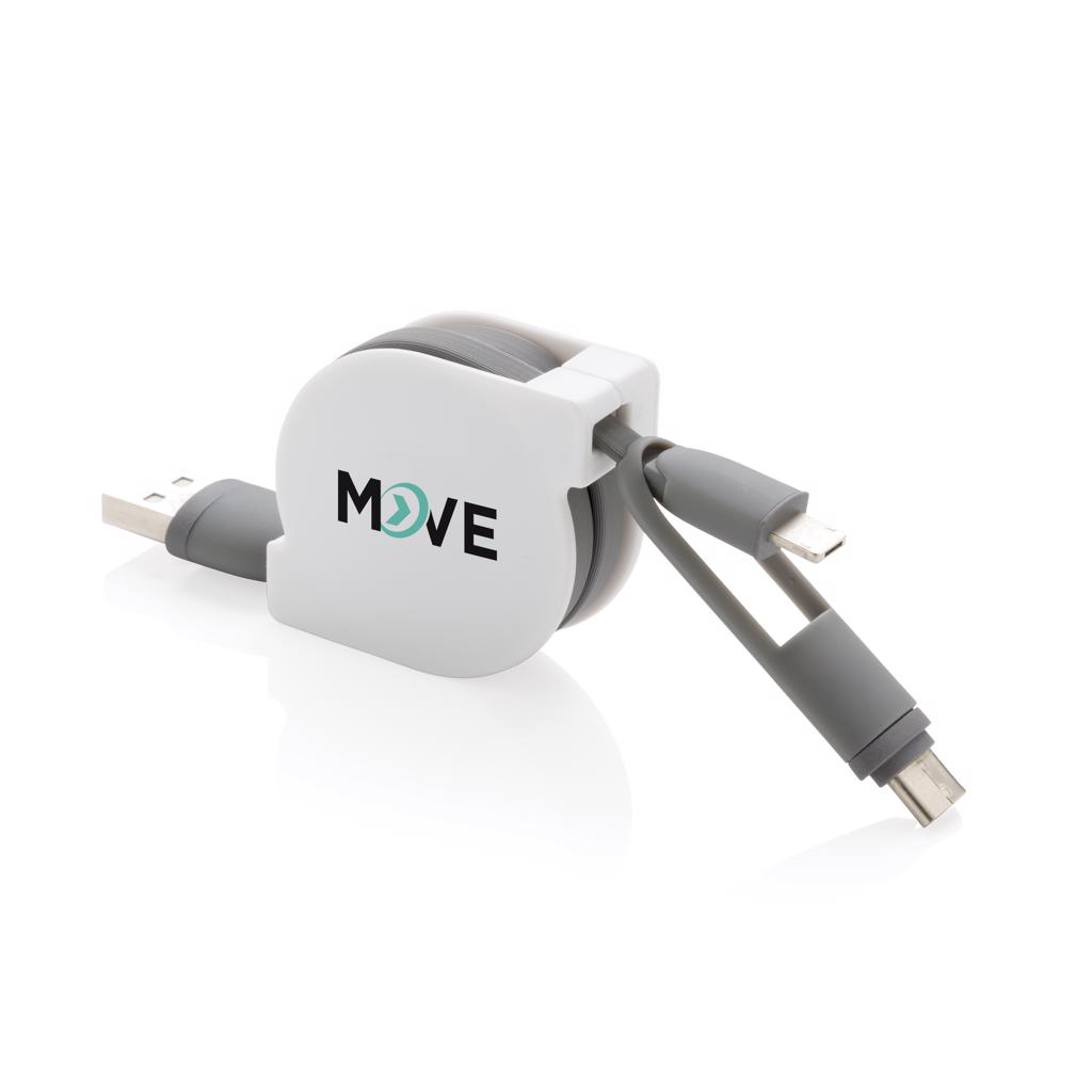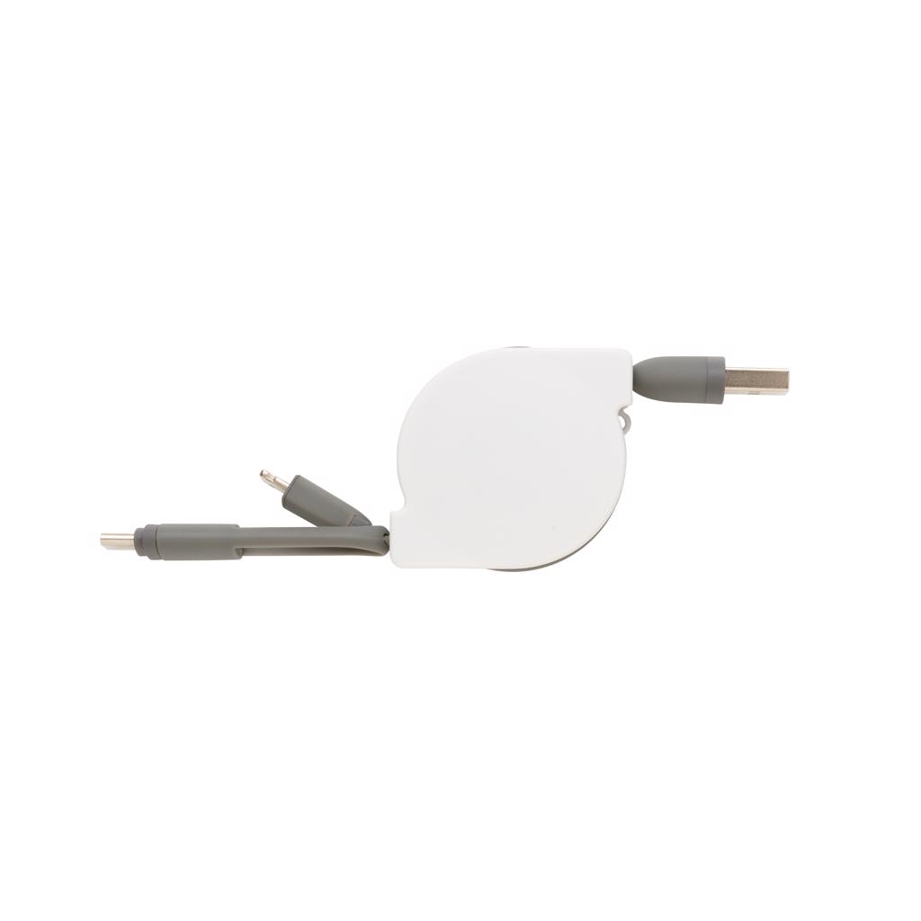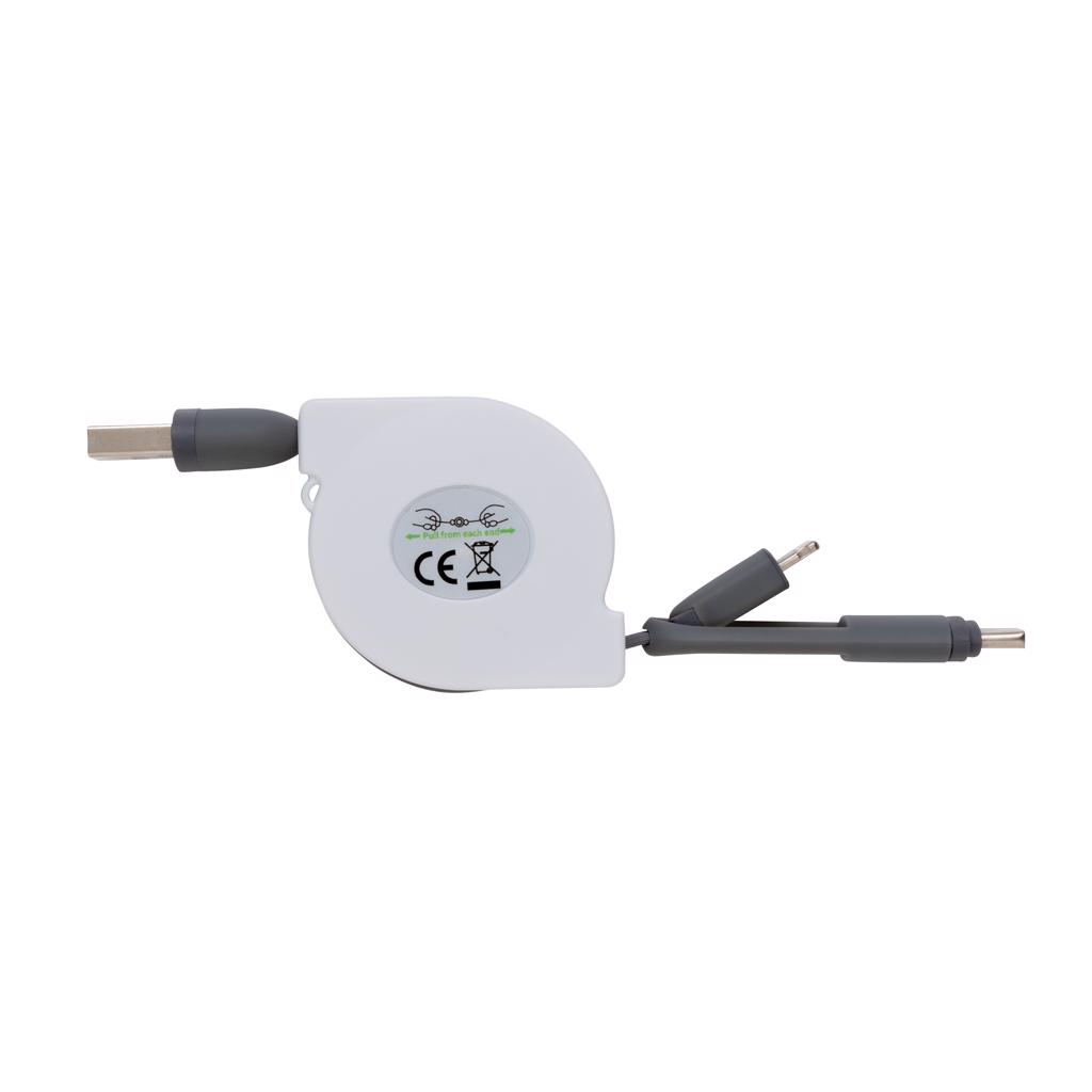 Kompaktes und ausziehbares 3-in-1 Ladekabel mit Type-C USB und zweiseitigem Anschlußstecker für iOS und Android Geräte, die einen Micro-USB Anschluß benötigen. Durch den Aufrollmechanismus kann das 100 cm Kabel, das auch zur Synchronisation Ihrer Daten verwendet werden kann, ohne jeglichen Kabelsalat überall hin mitgenommen werden. ABS-Gehäuse und TPU-Kabel.