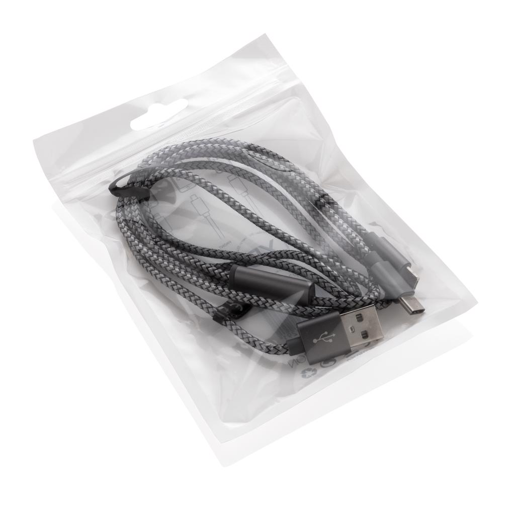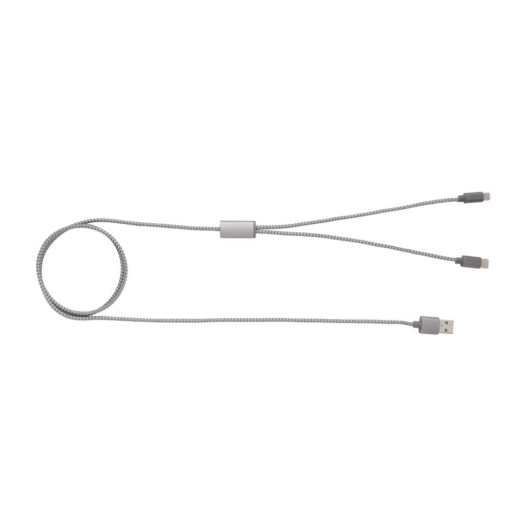Mit Nylon-Material umwobenes 3-in-1 Ladekabel mit Type-C USB und zweiseitigem Anschlußstecker für iOS und Android Geräte, die einen Micro-USB Anschluß benötigen. 120 cm lang.