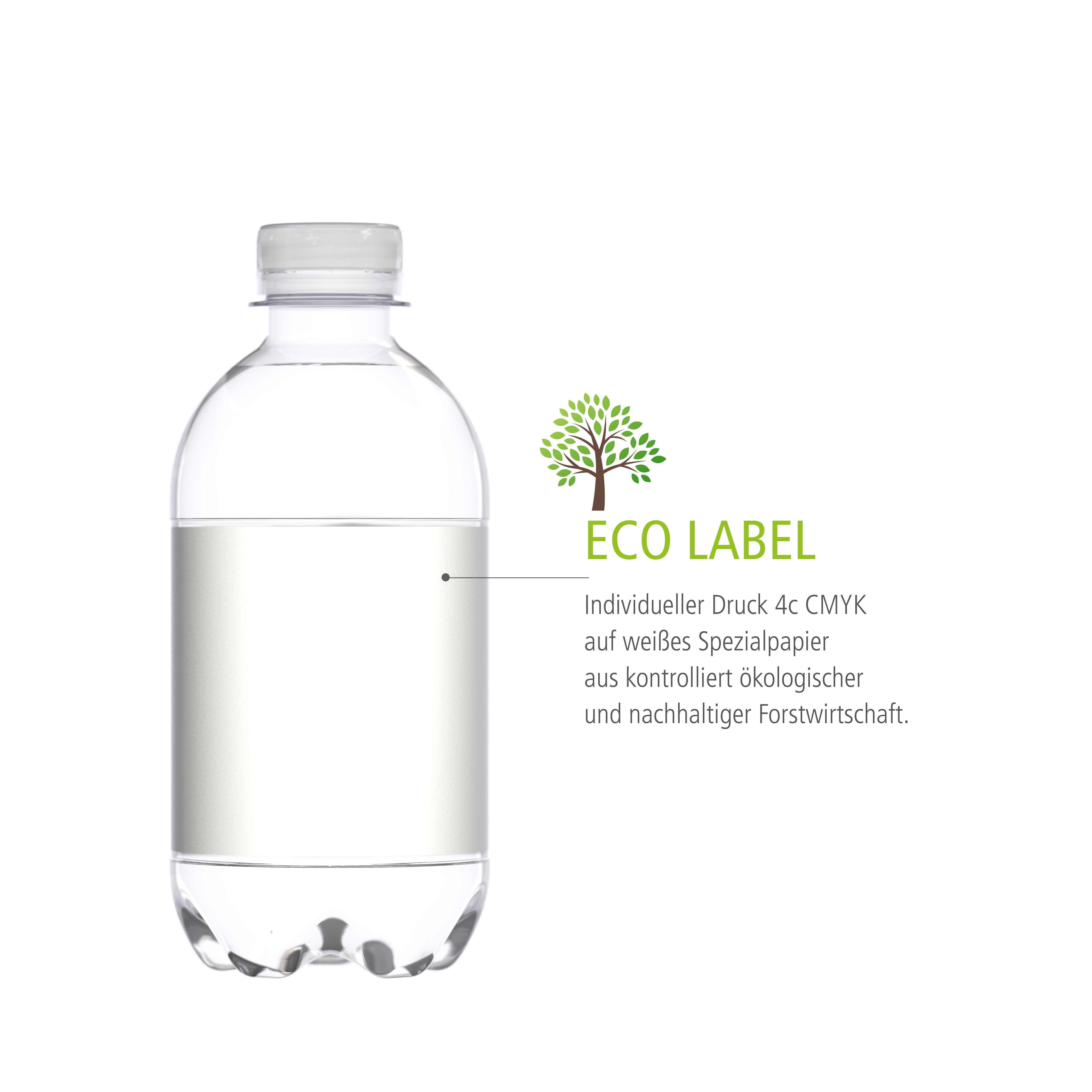 Wasser 330 ml PET Flasche aus 100% recyceltem PET (Recyclat) mit Schraubverschluss. Wasser mit Werbewasser - der Allrounder für erfrischendes Marketing! Durch seine einmalige Zusammensetzung ist es ideal für einen erfrischenden Werbeauftritt auf Messen, Incentives, Tagungen oder Outdoor-Events. • Regionale Abfüllung • Naturfrisches Wasser • Ausgewogene Zusammensetzung • Geschmacksneutral Dekoration: Eco Label: Etikettierung rundum. Weißes, holzfreies, ungestrichenes Papieretikett, hergestellt zu 100% aus zertifizierten Recyclingfasern (PCR) mit offener und natürlicher Oberflächenstruktur. Matt-stumpf ohne Glanz für ein besonders natürliches Aussehen. Umweltfreundlich ohne Lack. Feuchtigkeitsfest. Druck: 4c (CMYK) Bei Einsatz innerhalb Deutschlands und Österreich zzgl. 0,25 EUR Pfand pro Flasche. Deutschlandweite und österreichweite Erstattung durch Rückgabe am Pfandautomaten. Füllung: 330ml