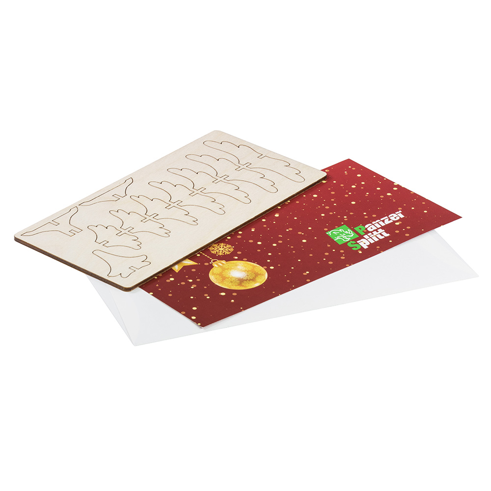 Vom Kunden zusammengesetzt, entstehen kleine, dreidimensionale Kunstwerke für jeden Lieblingsplatz. Das Gesamtprodukt umfasst die gelaserte Echtholzplatte mit eingelegten Filzteilen und die individuell gestaltete DIN lang Weihnachtskarte. Versandfertig verpackt im mitgelieferten weißen Briefumschlag wird das 3D Holzpuzzle zum optimalen Printmailing für die Weihnachtsgrüße. Zur Auswahl stehen die Motive Tannenbaum und Schneemann sowie die Holz-Filz Tanne. Eine zusätzliche Lasergravur auf der Holzkarte ist möglich.