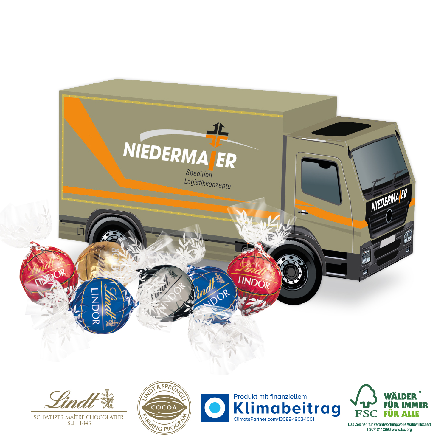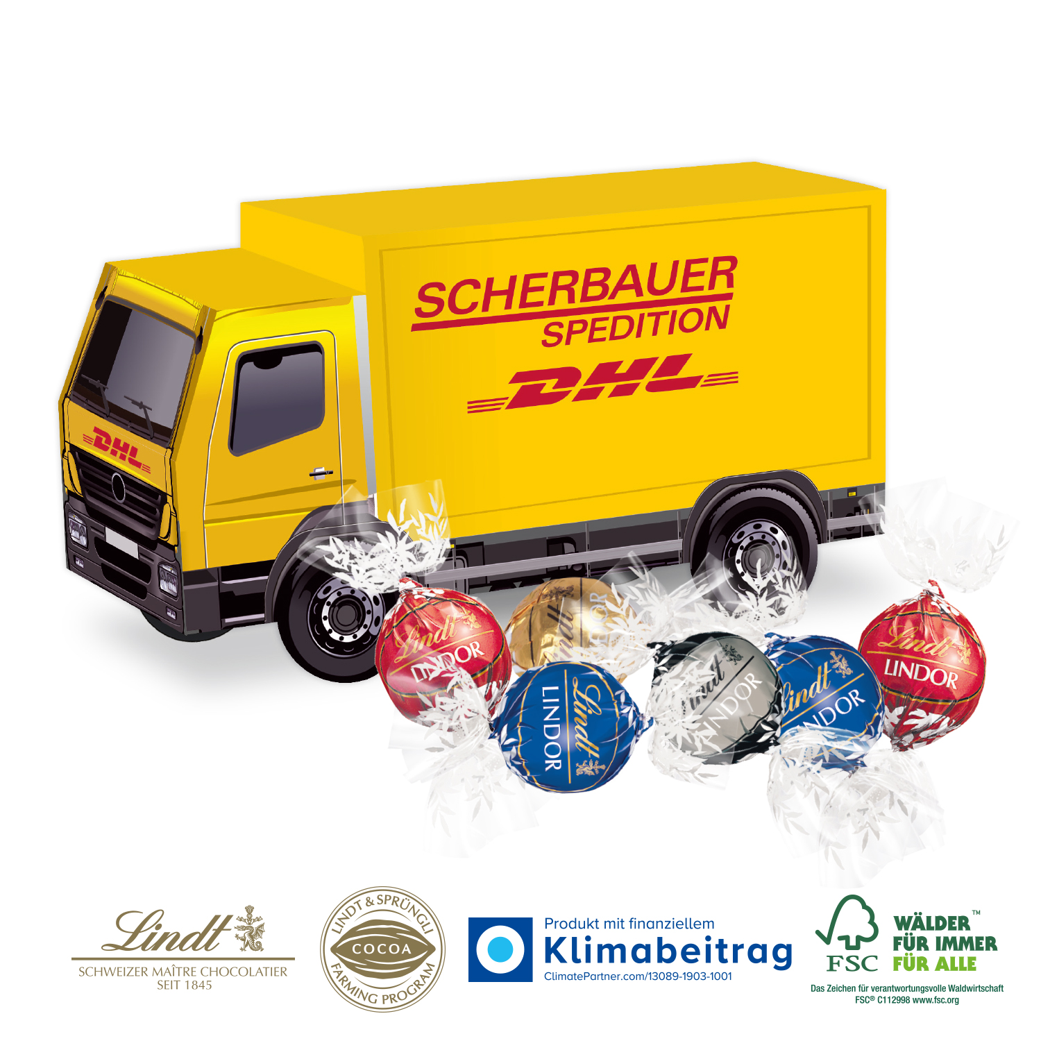 Perfekt für die Logistik! Individuell bedruckbares Präsent als "LKW" mit vielen Gestaltungsmöglichkeiten. Wählen Sie aus verschiedenen Varianten feinster Markenfüllungen.