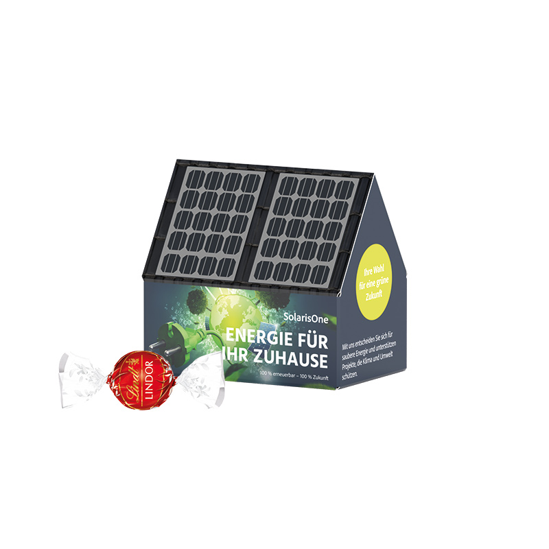 Haus Verpackung aus weißem Karton, individuell bedruckt. Inhalt: 1 transparenter Beutel mit 3 Lindt LINDOR Milchkugeln von Lindt.