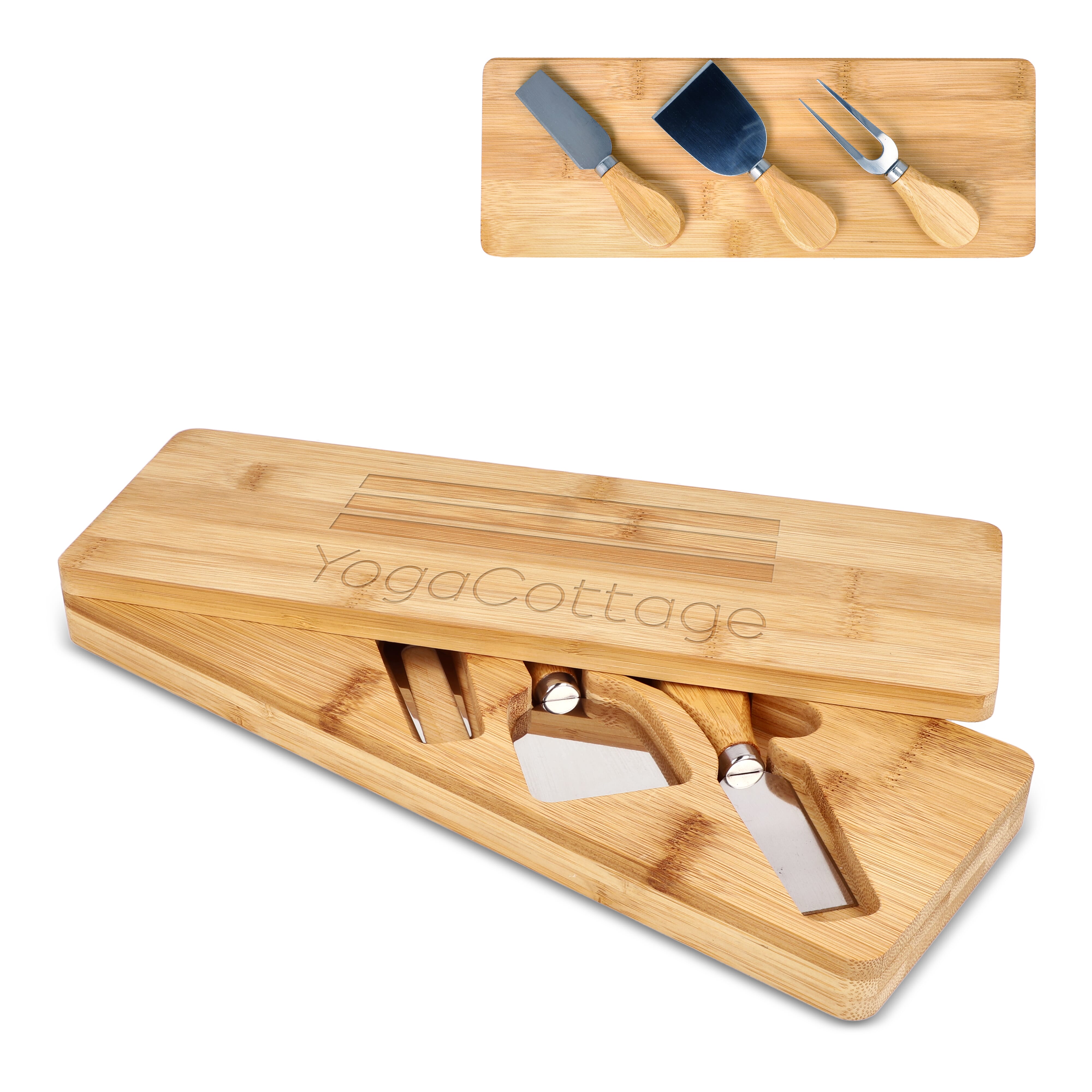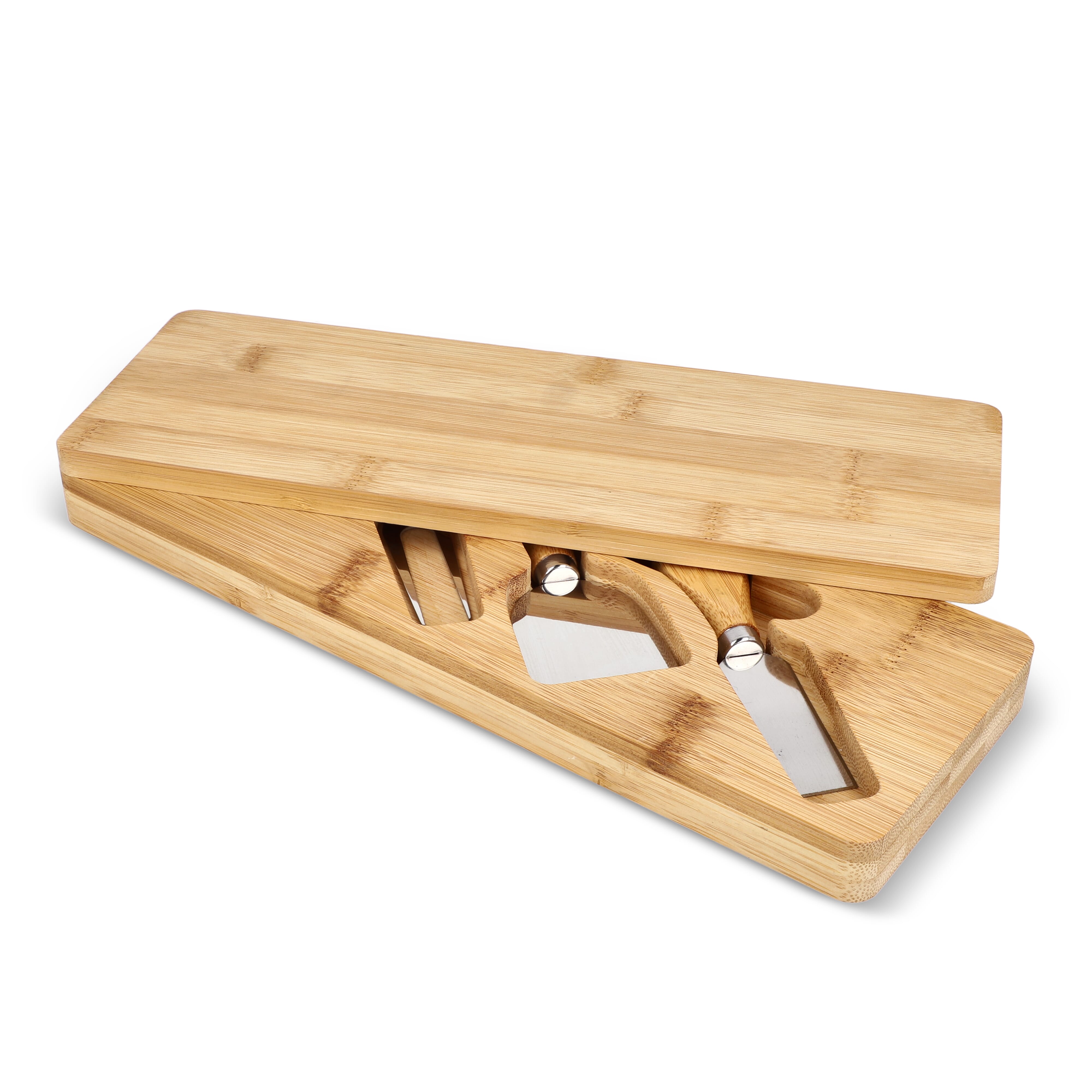 Dieses Käsemesserset wird in einer Bambusbox geliefert, die gleichzeitig als Servierbrett dient. Das Set besteht aus drei Messern, die für verschiedene Käsesorten geeignet sind und eine praktische Handhabung mit einer eleganten Präsentation verbinden.