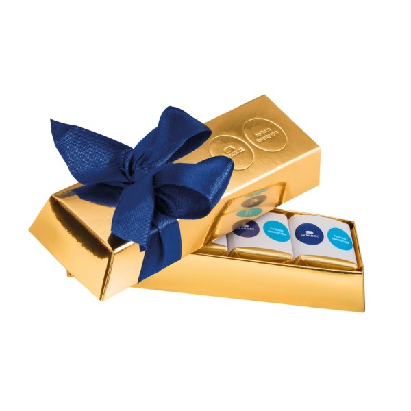 Geprägte silberne oder goldene Karton-Geschenkbox befüllt mit leckeren Schokoladenwürfeln, verpackt in silbernem oder goldenem Papier.