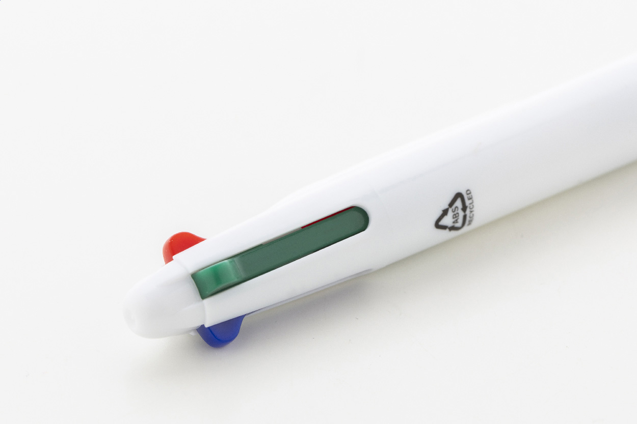 Vierfarbkugelschreiber aus recyceltem ABS mit Gummigriffzone. Minen schwarz-, blau-, rot- und grünschreibend.