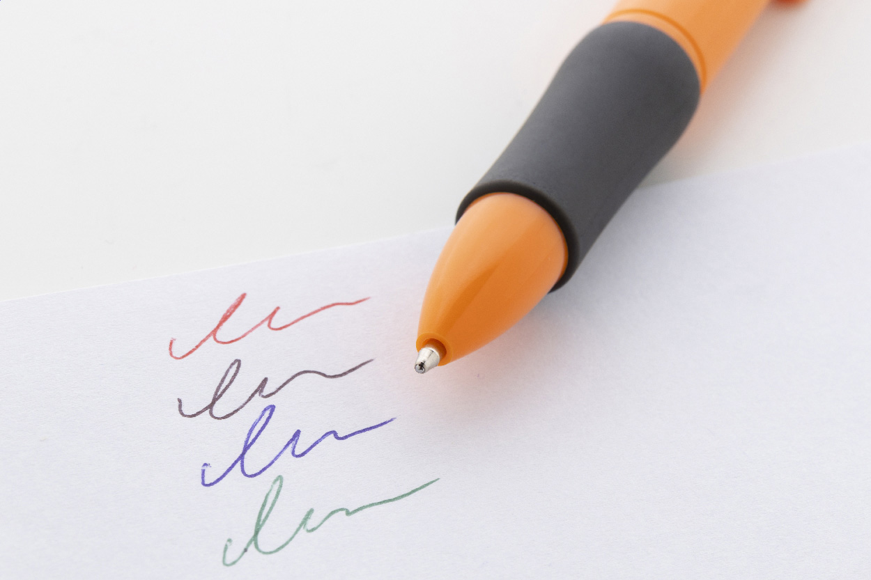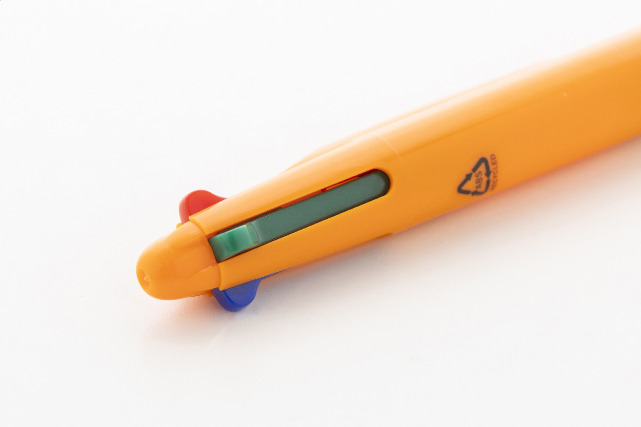 Vierfarbkugelschreiber aus recyceltem ABS mit Gummigriffzone. Minen schwarz-, blau-, rot- und grünschreibend.