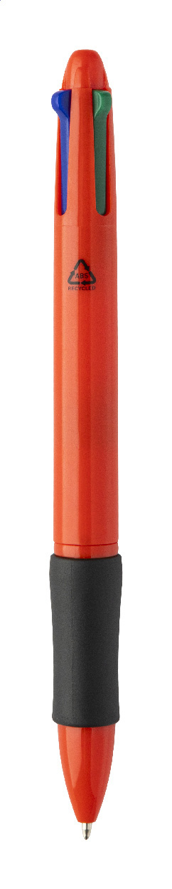 Vierfarbkugelschreiber aus recyceltem ABS mit Gummigriffzone. Minen schwarz-, blau-, rot- und grünschreibend.