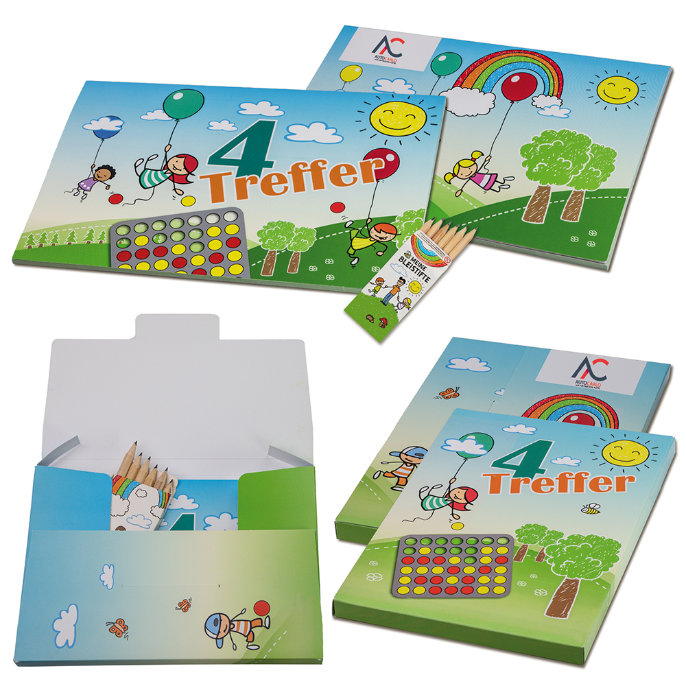 Unser 4 Treffer-Block sorgt für spannende Spielrunden und fördert strategisches Denken. Der Block enthält 25 Blätter des beliebten Spiels "4 Treffer / 4 Gewinnt" im DIN A5-Format. Zwei Varianten stehen zur Auswahl: • Block einzeln. • Set: Enthält zusätzlich eine praktische 6er-Buntstiftbox (Standardgestaltung), geliefert in einer hochwertigen, bedruckten Mappe. Veredelungsmöglichkeiten: • Standardausführung: Ab Lager lieferbar, optional mit zusätzlichem Logoeindruck. • Individuelle Gestaltung: Ab 500 Stück mit personalisierten Außenseiten für ein einzigartiges Design.