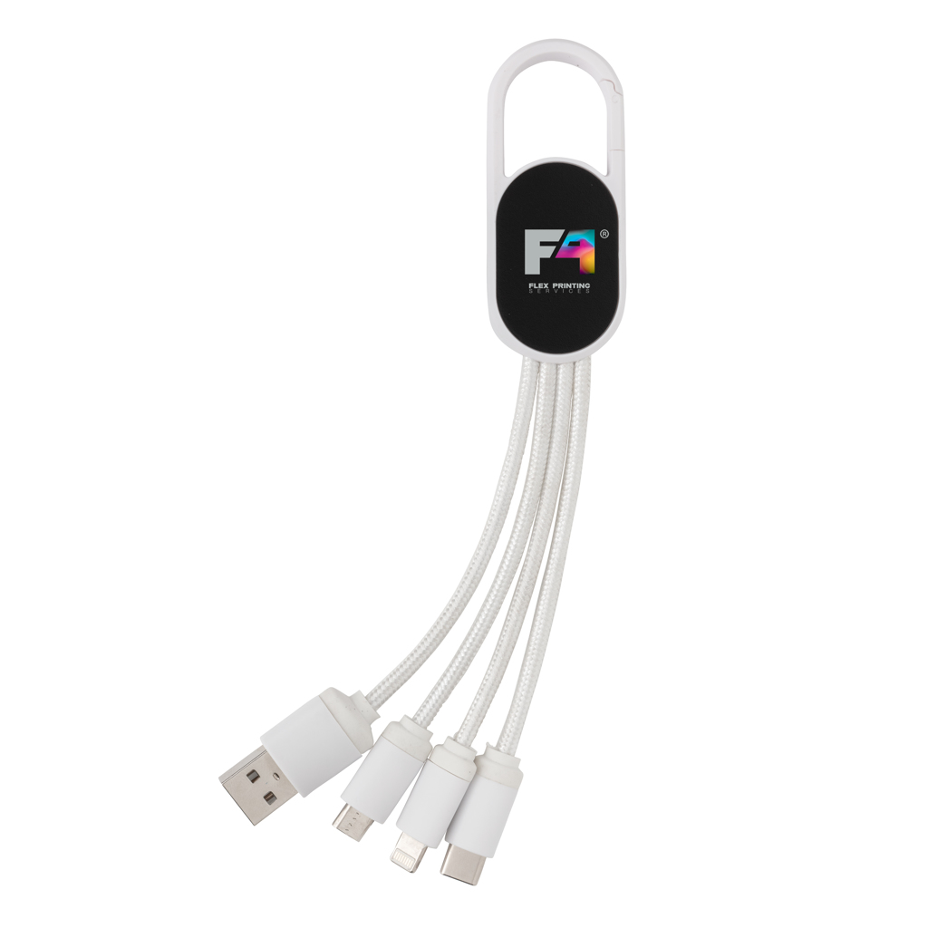 Dieses 4-in-1 Ladekabel mit Karabiner hat einen USB-Input, einen doppelseitigen Output für iOS und Mircro-USB für Android-Geräte sowie einen Type-C-Output um so alle gängingen Geräte laden zu können. Das Case aus ABS und das 10cm Kabel mit Nylon umwoben. Unterstützt das Laden bis zu 2.1A.