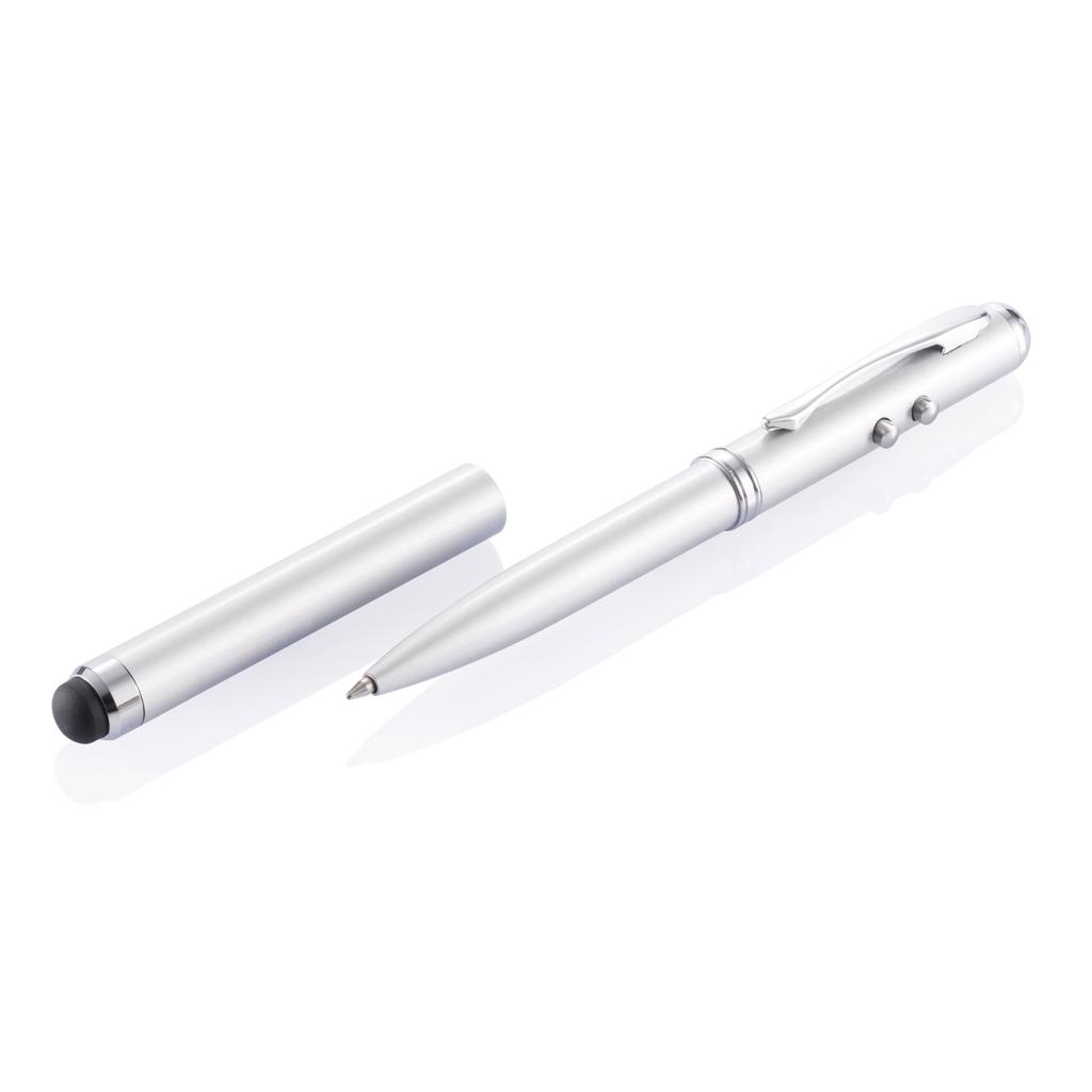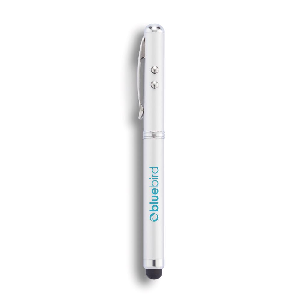 Schwarzschreibender Kugelschreiber mit Stylus-Funktion und integriertem Laserpointer sowie kleiner Leuchte.