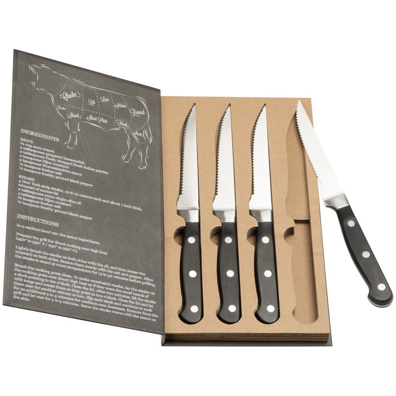 Steakmesserset bestehend aus vier hochwertigen Steakmessern aus Edelstahl, verpackt in einer hübschen Geschenkbox im Buchdesign. Ihre Werbung drucken wir auf die Vorderseite des Buchkartons.