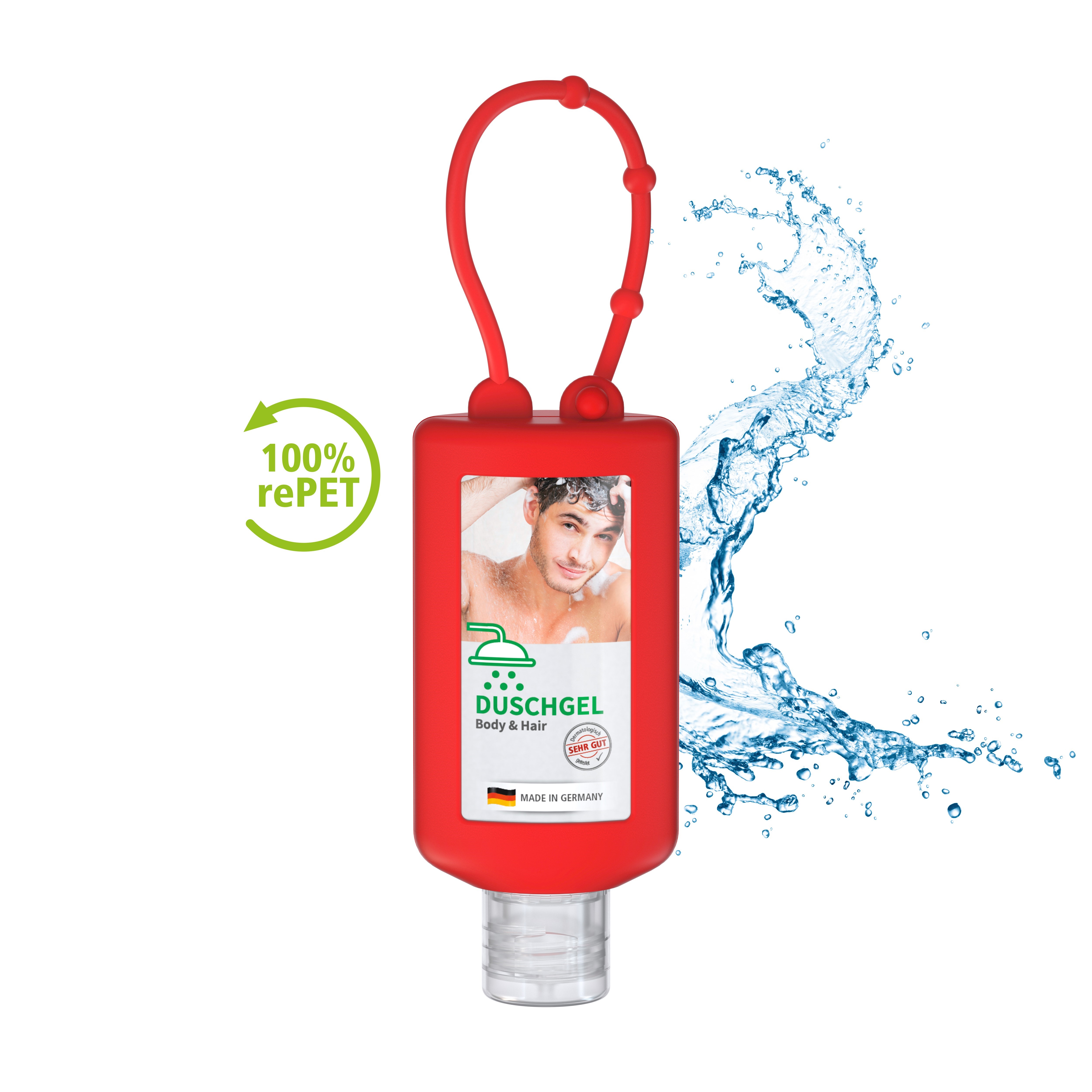 Praktische Kosmetikflasche zum Anhängen! Das Fläschchen mit Silikonhülle ist nicht nur optisch ein echter Hingucker! Raffiniert mit Schlaufe zum Anhängen an den Rucksack, an die Sporttasche, an den Kinderwagen oder natürlich im Bad unter der Dusche. 50 ml Flasche aus 100% recyceltem PET, transparent mit leichter R-PET-Färbung. Mit Klappdeckel "weiß" aus recyceltem PP, zufällig ausgerichtet; Silikonhülle und Schlaufe in Nachfüllbar. Das Body & Hair Duschgel mit dem Mix aus Ingwer und Limette sorgt mit seinem spritzigen Duft für Frische über den ganzen Tag und macht das Duschen zum Erlebnis! Es entsteht ein angenehmer Schaum, der Haut und Haare reinigt und zugleich pflegt. • Vegan • pH-hautneutral • Ohne Parabene • Ohne Konservierungsstoffe • Dermatologisch getestet "Sehr gut hautverträglich" • Hergestellt in Deutschland Dekoration: Body Label: Etikett PE (weiß) auf Vorder- und Rückseite, Druck 4c CMYK. Wahlweise glänzend oder matt. Füllung: 50ml