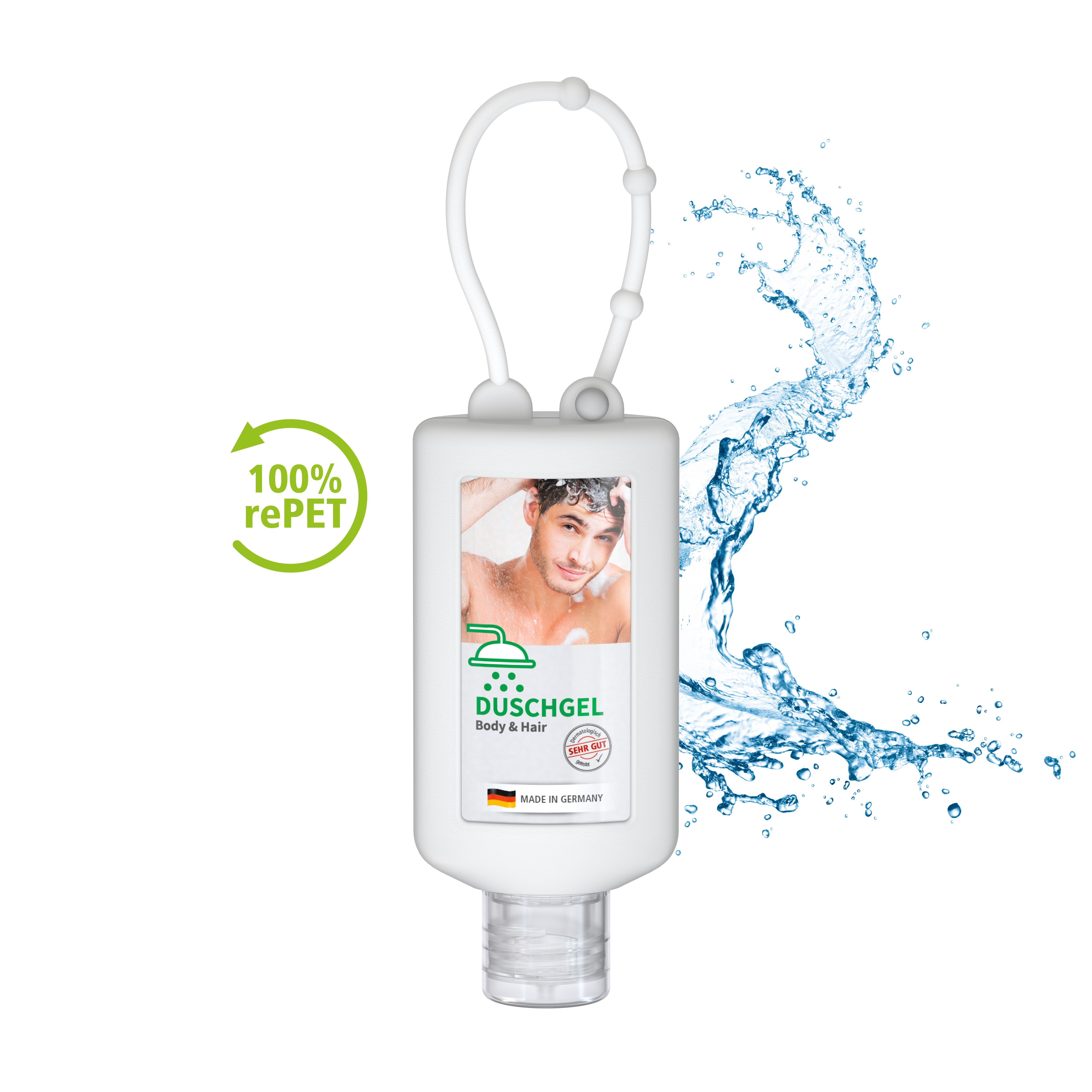 Praktische Kosmetikflasche zum Anhängen! Das Fläschchen mit Silikonhülle ist nicht nur optisch ein echter Hingucker! Raffiniert mit Schlaufe zum Anhängen an den Rucksack, an die Sporttasche, an den Kinderwagen oder natürlich im Bad unter der Dusche. 50 ml Flasche aus 100% recyceltem PET, transparent mit leichter R-PET-Färbung. Mit Klappdeckel "weiß" aus recyceltem PP, zufällig ausgerichtet; Silikonhülle und Schlaufe in Nachfüllbar. Das Body & Hair Duschgel mit dem Mix aus Ingwer und Limette sorgt mit seinem spritzigen Duft für Frische über den ganzen Tag und macht das Duschen zum Erlebnis! Es entsteht ein angenehmer Schaum, der Haut und Haare reinigt und zugleich pflegt. • Vegan • pH-hautneutral • Ohne Parabene • Ohne Konservierungsstoffe • Dermatologisch getestet "Sehr gut hautverträglich" • Hergestellt in Deutschland Dekoration: Body Label: Etikett PE (weiß) auf Vorder- und Rückseite, Druck 4c CMYK. Wahlweise glänzend oder matt. Füllung: 50ml