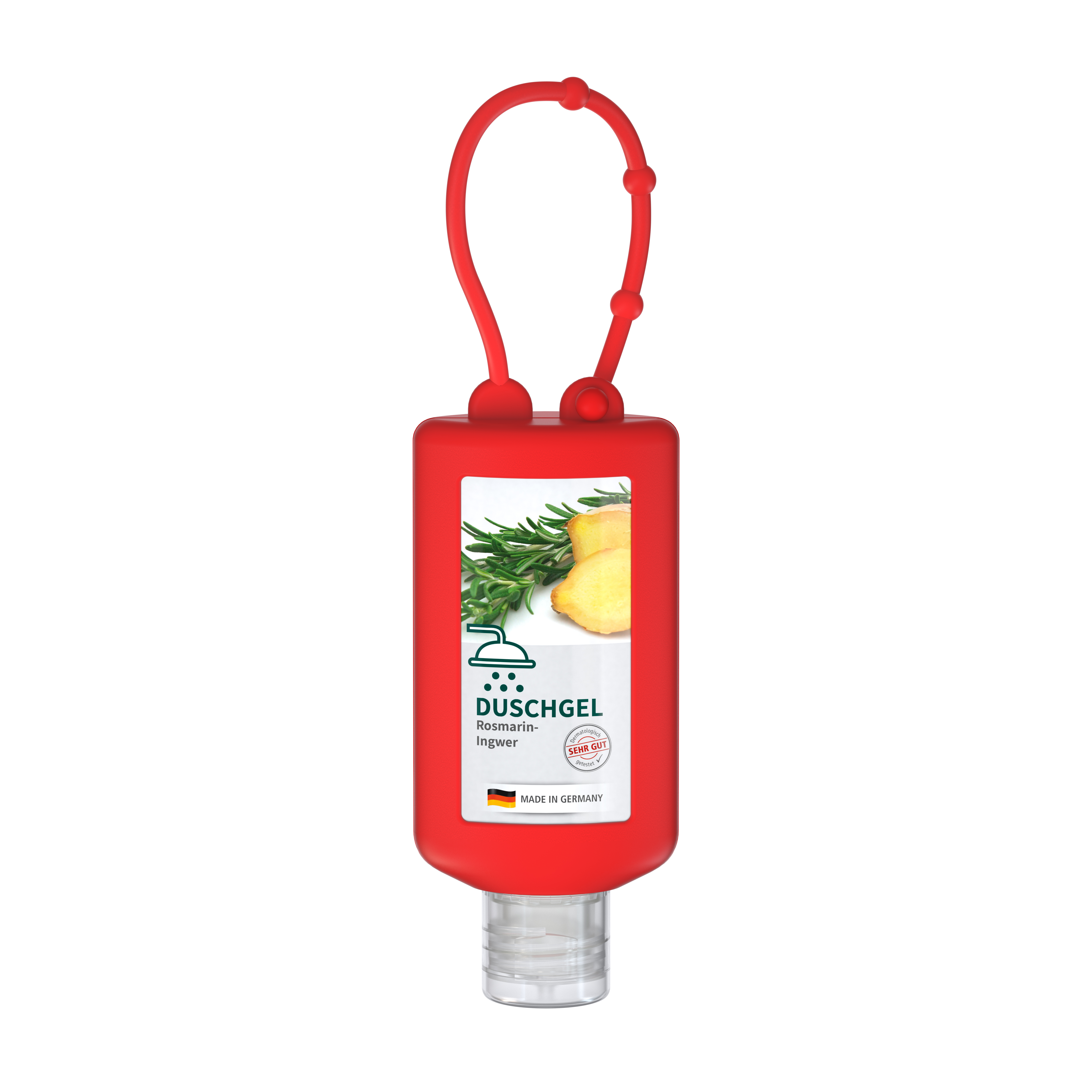 Praktische Kosmetikflasche zum Anhängen! Das Fläschchen mit Silikonhülle ist nicht nur optisch ein echter Hingucker! Raffiniert mit Schlaufe zum Anhängen an den Rucksack, an die Sporttasche, an den Kinderwagen oder natürlich im Bad unter der Dusche. 50 ml Flasche aus 100% recyceltem PET, transparent mit leichter R-PET-Färbung. Mit Klappdeckel "weiß" aus recyceltem PP, zufällig ausgerichtet; Silikonhülle und Schlaufe in Nachfüllbar. Das Body & Hair Duschgel mit dem Mix aus Rosmarin und Ingwer regt mit seinem umwerfend würzig-frischen Duft die Sinne an und macht das Duschen zum Erlebnis! Es entsteht ein angenehmer Schaum, der Haut und Haare reinigt und zugleich pflegt. • Vegan • pH-hautneutral • Ohne Parabene • Ohne Konservierungsstoffe • Dermatologisch getestet "Sehr gut hautverträglich" • Hergestellt in Deutschland Dekoration: Body Label: Etikett PE (weiß) auf Vorder- und Rückseite, Druck 4c CMYK. Wahlweise glänzend oder matt. Füllung: 50ml