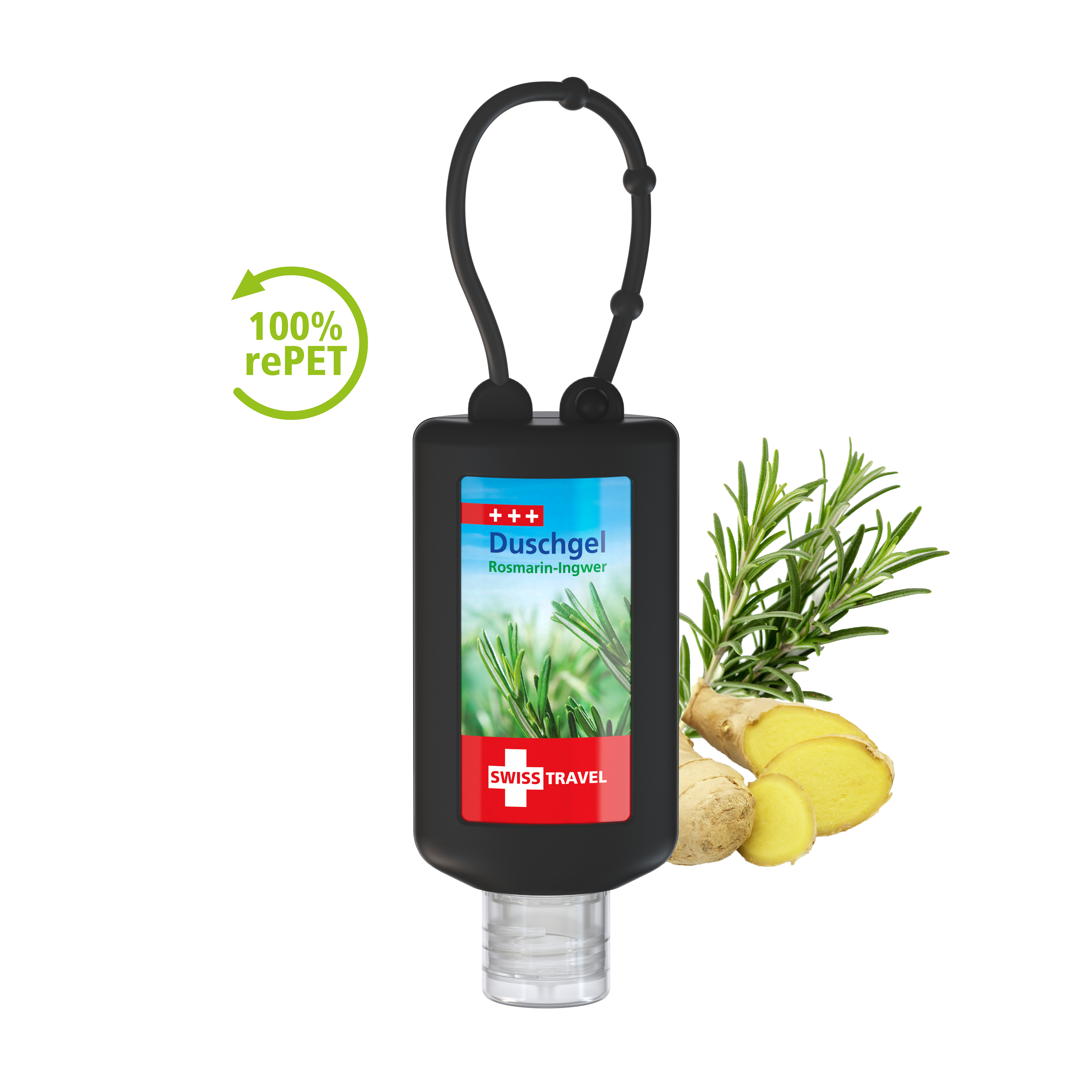 Praktische Kosmetikflasche zum Anhängen! Das Fläschchen mit Silikonhülle ist nicht nur optisch ein echter Hingucker! Raffiniert mit Schlaufe zum Anhängen an den Rucksack, an die Sporttasche, an den Kinderwagen oder natürlich im Bad unter der Dusche. 50 ml Flasche aus 100% recyceltem PET, transparent mit leichter R-PET-Färbung. Mit Klappdeckel "weiß" aus recyceltem PP, zufällig ausgerichtet; Silikonhülle und Schlaufe in Nachfüllbar. Das Body & Hair Duschgel mit dem Mix aus Rosmarin und Ingwer regt mit seinem umwerfend würzig-frischen Duft die Sinne an und macht das Duschen zum Erlebnis! Es entsteht ein angenehmer Schaum, der Haut und Haare reinigt und zugleich pflegt. • Vegan • pH-hautneutral • Ohne Parabene • Ohne Konservierungsstoffe • Dermatologisch getestet "Sehr gut hautverträglich" • Hergestellt in Deutschland Dekoration: Body Label: Etikett PE (weiß) auf Vorder- und Rückseite, Druck 4c CMYK. Wahlweise glänzend oder matt. Füllung: 50ml
