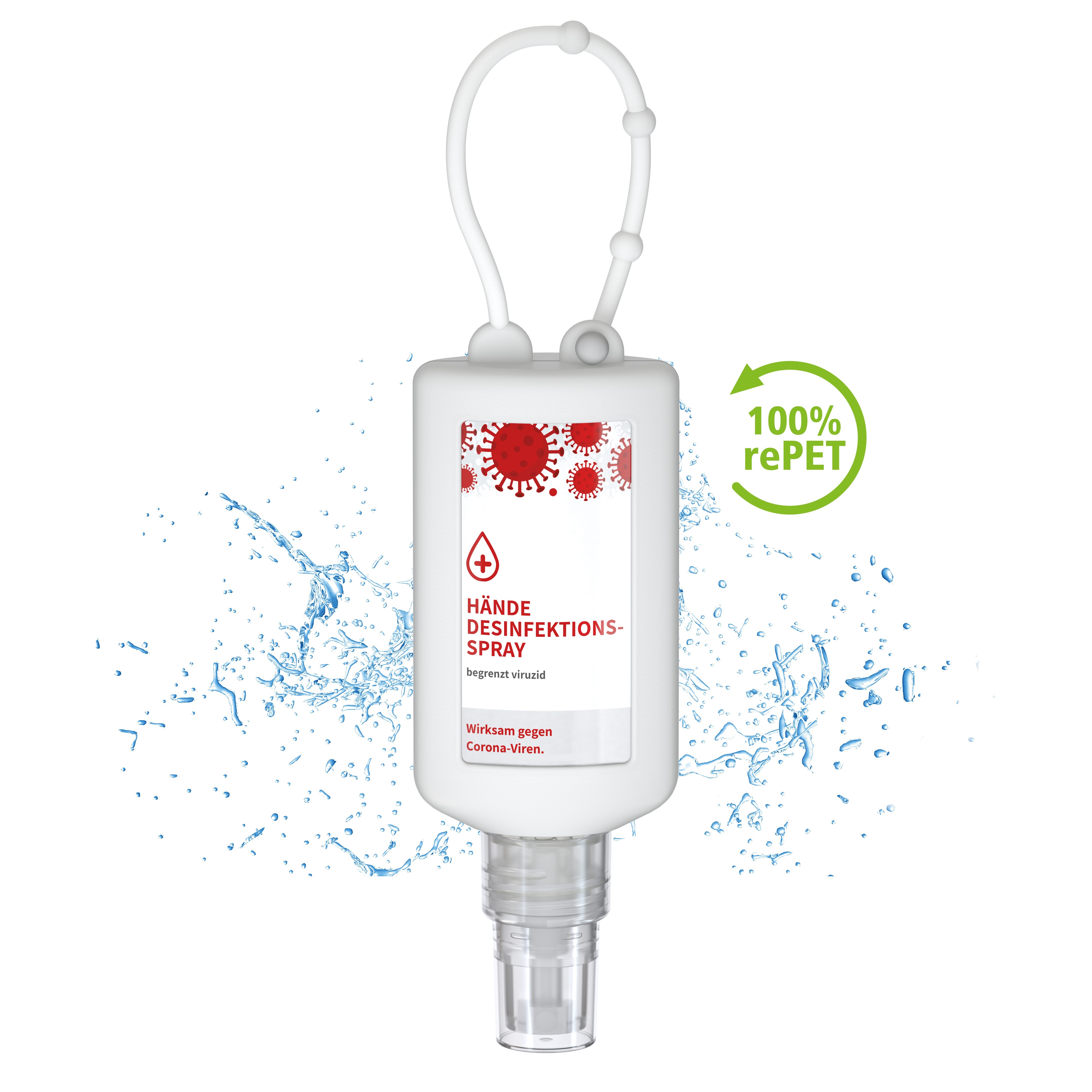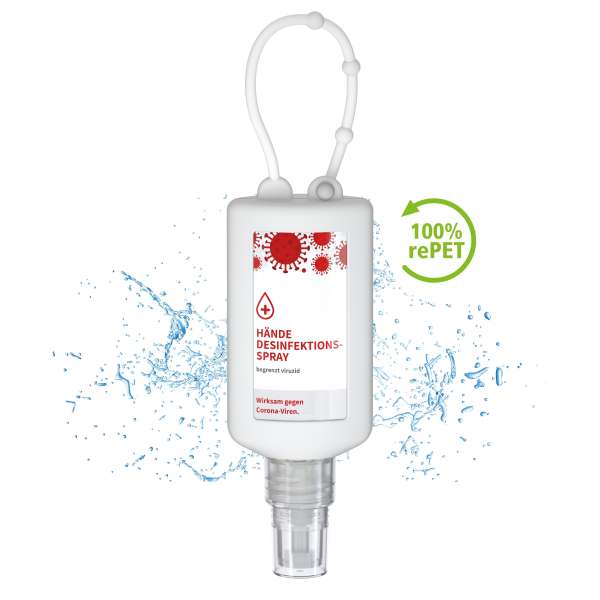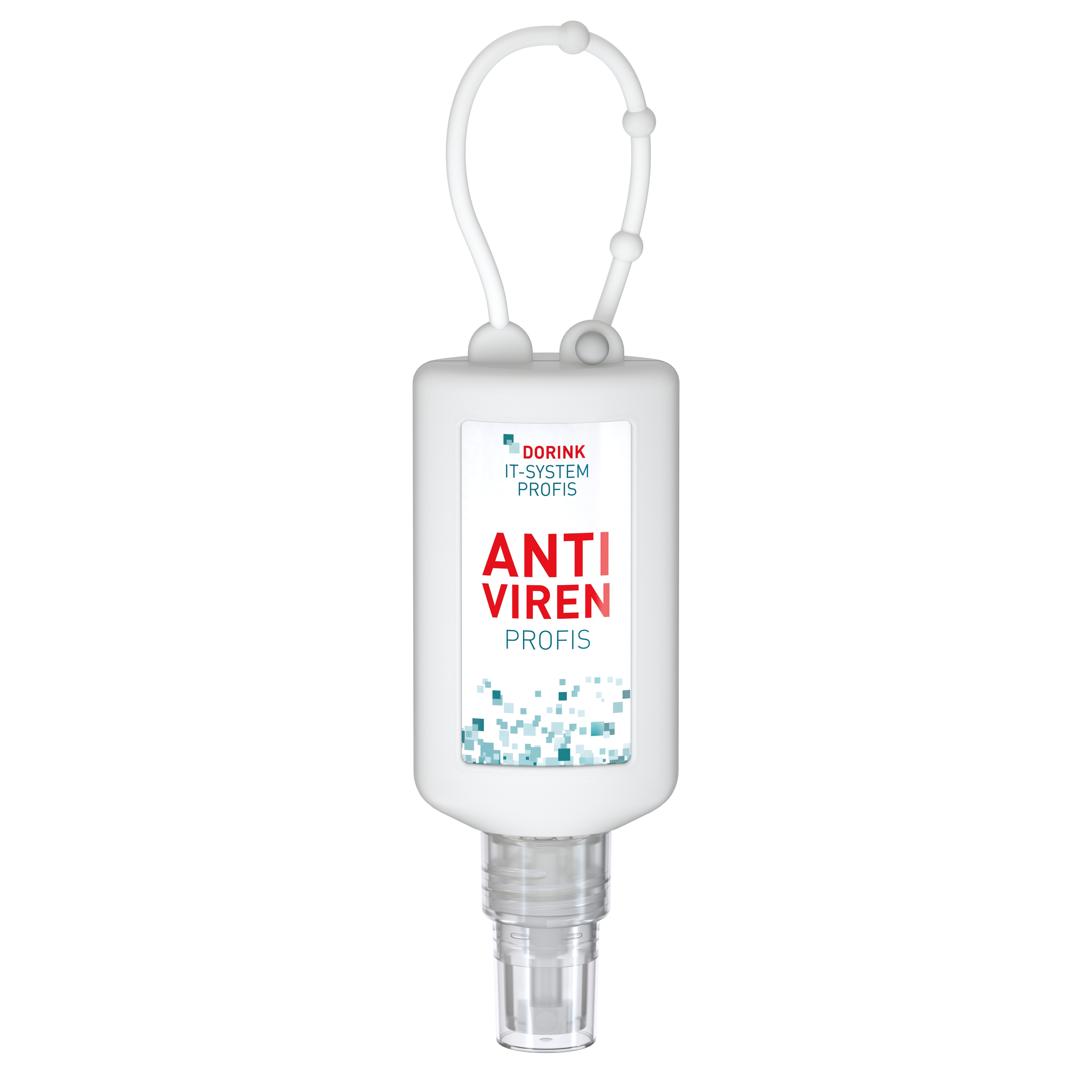Praktische Flasche zum Anhängen! Das Fläschchen mit Silikonhülle ist nicht nur optisch ein echter, Raffiniert mit Schlaufe zum Anhängen ans Handgepäck, an den Rucksack oder an den Kinderwagen. 50 ml Flasche aus 100% recyceltem PET, transparent mit leichter mit Pumpaufsatz "transparent" mit Schutzkappe; Silikonhülle und Schlaufe in Nachfüllbar. Dekoration: Body Label: Etikett PE (weiß) auf Vorder- und Rückseite, Druck 4c CMYK. Wahlweise glänzend oder matt. Das alkoholische Hände-Desinfektionsspmittel verfügt aufgrund seiner Zusammensetzung über ein breites Wirkspektrum gegen Viren, Bakterien und Hefen. Es eignet sich für eine hygienische Händedesinfektion gemäß DIN EN 1500 bei einer Anwendung von nur 30 Sekunden. Spezielle Pflegekomponenten schonen die Haut auch bei häufigerer Anwendung und halten sie geschmeidig. •Schnell wirksam gegen Corona-Viren innerhalb von 30 Sekunden •Tötet 99,99 % aller Bakterien. Begrenzt viruzid, levurozid. •Hautschonend mit Pflegekomponenten •Dermatologisch "Sehr gut hautverträglich" getestet •Inklusive gesetzlich vorgeschriebenem "tastbarem Warnzeichen" •Hergestellt in Deutschland Wirksamkeit bestätigt gemäß DIN EN 1500, 13727, 13624, 14476. Enthält pro 100 g als Wirkstoff: Ethanol (50 g/100 g), Isopropanol (25 g/100 g). Biozide sicher verwenden. Vor Gebrauch Etikett und Produktinformation lesen. Reg. Nr. UFI G600-606D-H00S-5S7W BAuA Reg. Nr.: N-100781