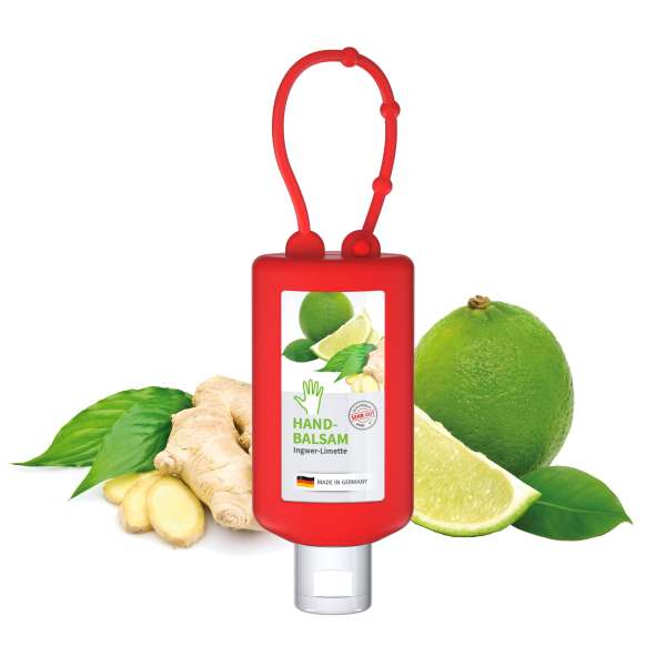 Praktische Kosmetikflasche zum Anhängen! Das Fläschchen mit Silikonhülle ist nicht nur optisch ein echter Hingucker! Raffiniert mit Schlaufe zum an die Handtasche, an den Rucksack oder an den Trolli. 50 ml Flasche und Klappdeckel (zufällig ausgerichtet) weiß; Silikonhülle und Schlaufe in Nachfüllbar. Flasche hergestellt aus 100% recyceltem PET, weiß mit leichter R-PET-Färbung. Handbalsam Ingwer-Limette: Ingwer wird in der traditionellen chinesischen Medizin häufig aufgrund seiner reizlindernden Wirkung eingesetzt. Er enthält Inhaltsstoffe, die freie Radikale abfangen, regt die Mikrozirkulation der Haut an, wirkt anregend und wärmend. In diesem schnell einziehenden Feuchtigkeitsbalsam rundet die Frische von Limetten das natürliche Aroma des Ingwers zu einer stimmigen Duftkomposition ab. Eine frische Handcreme für Sie und Ihn! • Vegan • pH-hautneutral • Ohne Parabene • Dermatologisch getestet "Sehr gut hautverträglich" • Hergestellt in Deutschland Dekoration: Body Label: Etikett PE (weiß) auf Vorder- und Rückseite, Druck 4c CMYK. Wahlweise glänzend oder matt. Füllung: 50ml