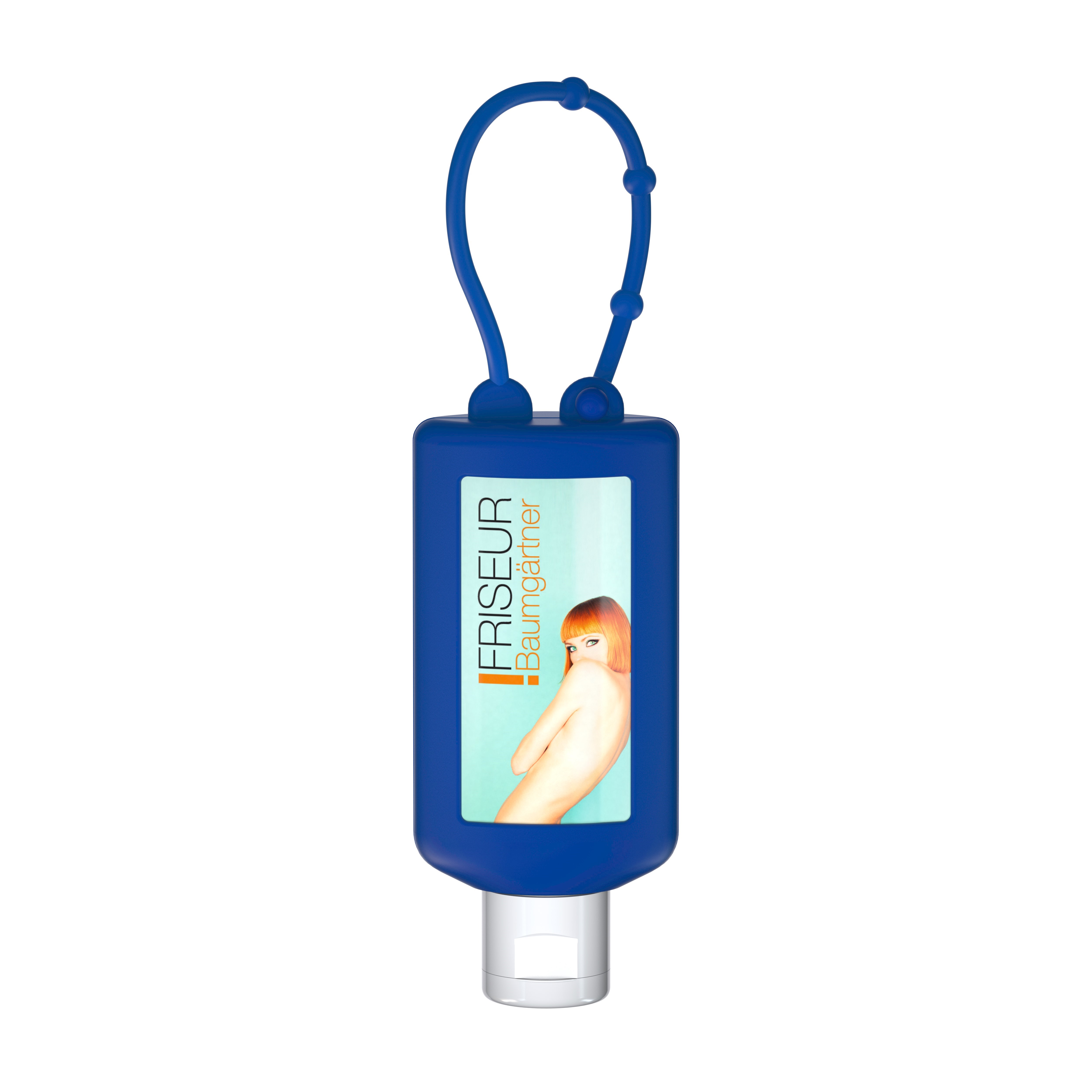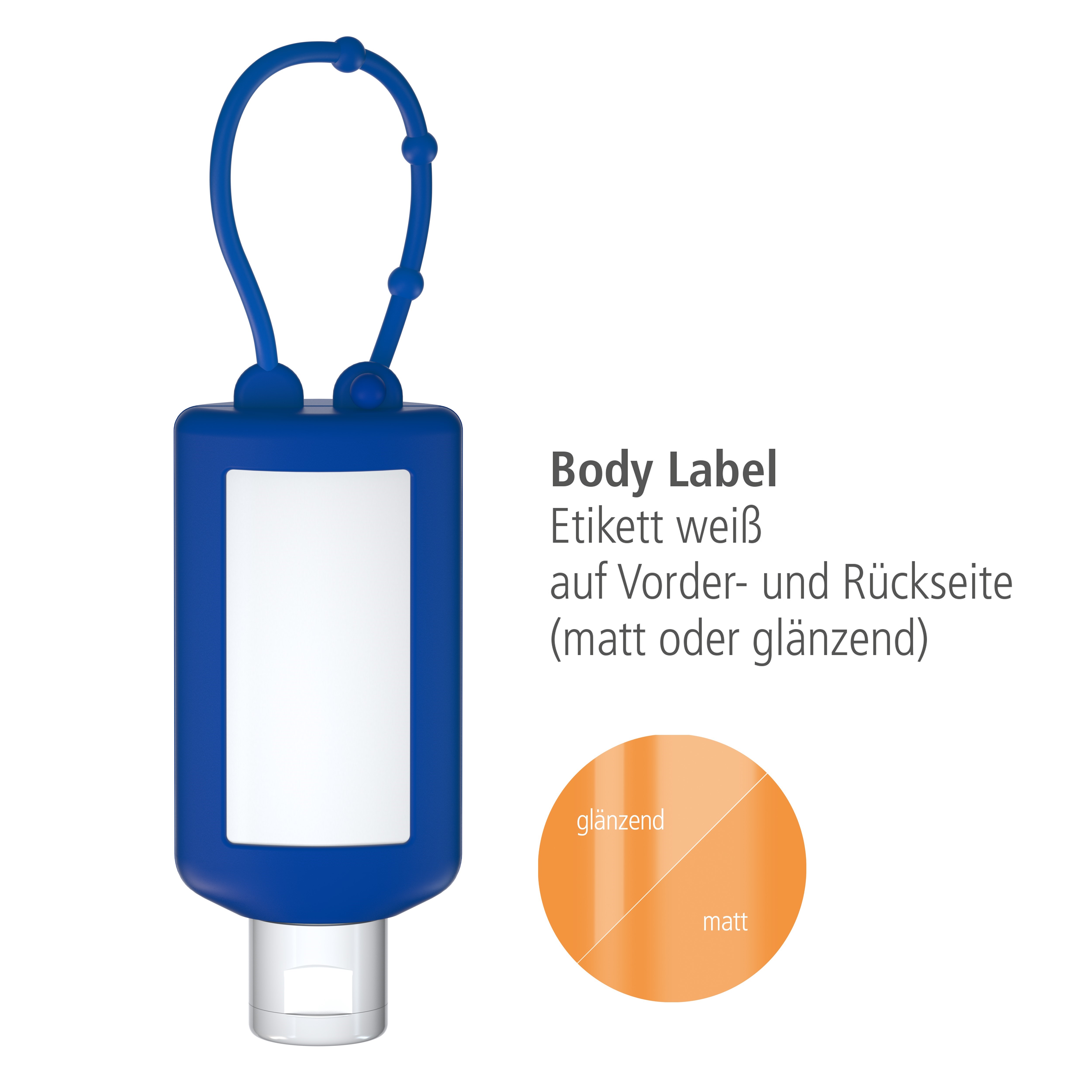 Praktische Kosmetikflasche zum Anhängen! Das Fläschchen mit Silikonhülle ist nicht nur optisch ein echter Hingucker! Raffiniert mit Schlaufe zum Anhängenan die Handtasche, an den Rucksack oder an den Trolli. 50 ml Flasche und Klappdeckel (zufällig ausgerichtet) weiß; Silikonhülle und Schlaufe in Nachfüllbar. Flasche hergestellt aus 100% recyceltem PET, weiß mit leichter R-PET-Färbung. Handbalsam Ringelblume-Aloe Vera: Die Extrakte der Ringelblume enthalten eine Vielzahl natürlicher, entzündungshemmender Substanzen und ätherischer Öle. Aloe Vera wirkt wohltuend kühlend und beruhigend. In dieser hochwertigen Handcreme sind die Vorzüge beider Heilpflanzen stimmig zu einem schnell einziehenden Feuchtigkeitsbalsam vereint. Ideal zur Pflege von trockenen, rauen und strapazierten Händen. • Vegan • pH-hautneutral • Ohne Parabene • Dermatologisch getestet "Sehr gut hautverträglich" • Hergestellt in Deutschland Dekoration: Body Label: Etikett PE (weiß) auf Vorder- und Rückseite, Druck 4c CMYK. Wahlweise glänzend oder matt. Füllung: 50ml