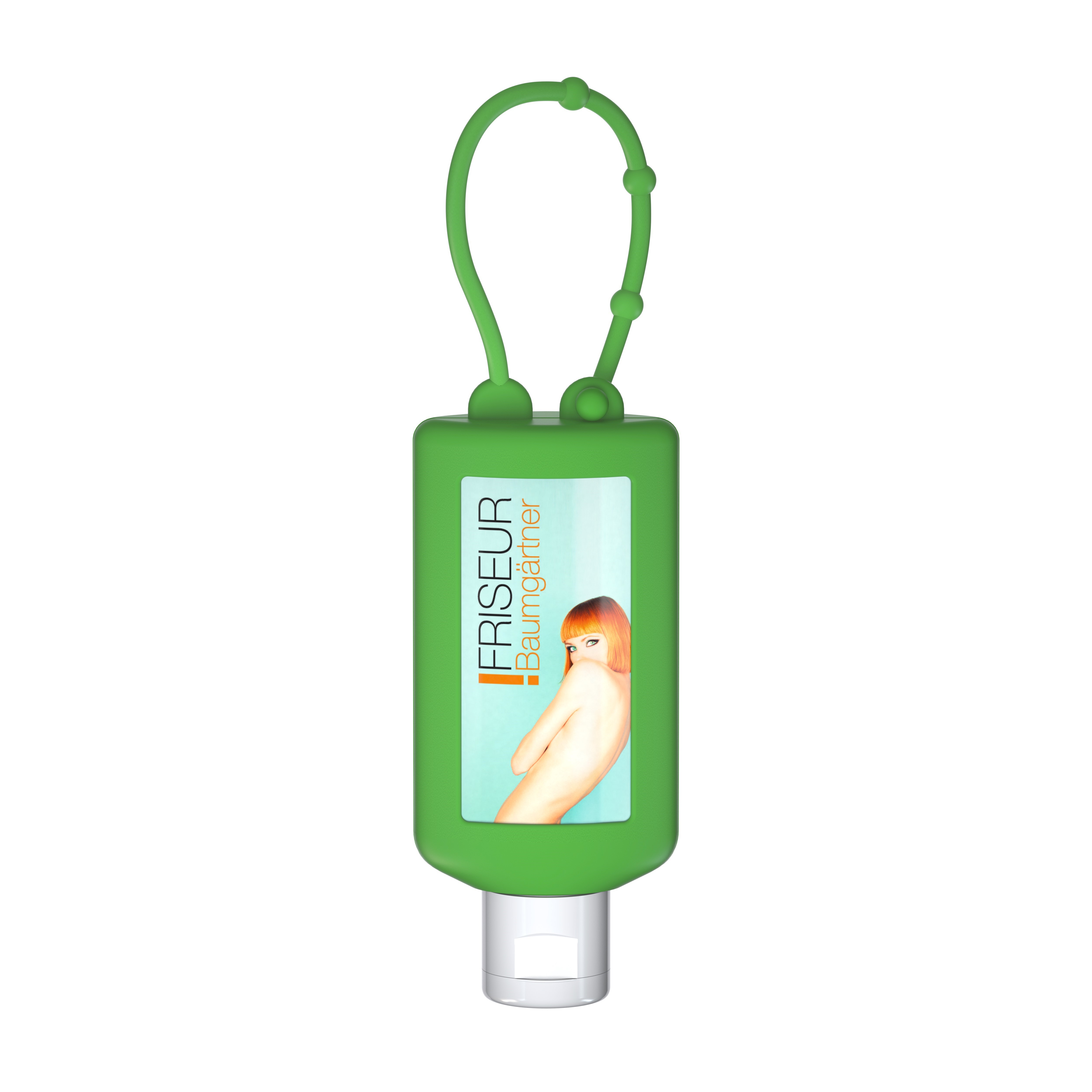 Praktische Kosmetikflasche zum Anhängen! Das Fläschchen mit Silikonhülle ist nicht nur optisch ein echter Hingucker! Raffiniert mit Schlaufe zum Anhängenan die Handtasche, an den Rucksack oder an den Trolli. 50 ml Flasche und Klappdeckel (zufällig ausgerichtet) weiß; Silikonhülle und Schlaufe in Nachfüllbar. Flasche hergestellt aus 100% recyceltem PET, weiß mit leichter R-PET-Färbung. Handbalsam Ringelblume-Aloe Vera: Die Extrakte der Ringelblume enthalten eine Vielzahl natürlicher, entzündungshemmender Substanzen und ätherischer Öle. Aloe Vera wirkt wohltuend kühlend und beruhigend. In dieser hochwertigen Handcreme sind die Vorzüge beider Heilpflanzen stimmig zu einem schnell einziehenden Feuchtigkeitsbalsam vereint. Ideal zur Pflege von trockenen, rauen und strapazierten Händen. • Vegan • pH-hautneutral • Ohne Parabene • Dermatologisch getestet "Sehr gut hautverträglich" • Hergestellt in Deutschland Dekoration: Body Label: Etikett PE (weiß) auf Vorder- und Rückseite, Druck 4c CMYK. Wahlweise glänzend oder matt. Füllung: 50ml