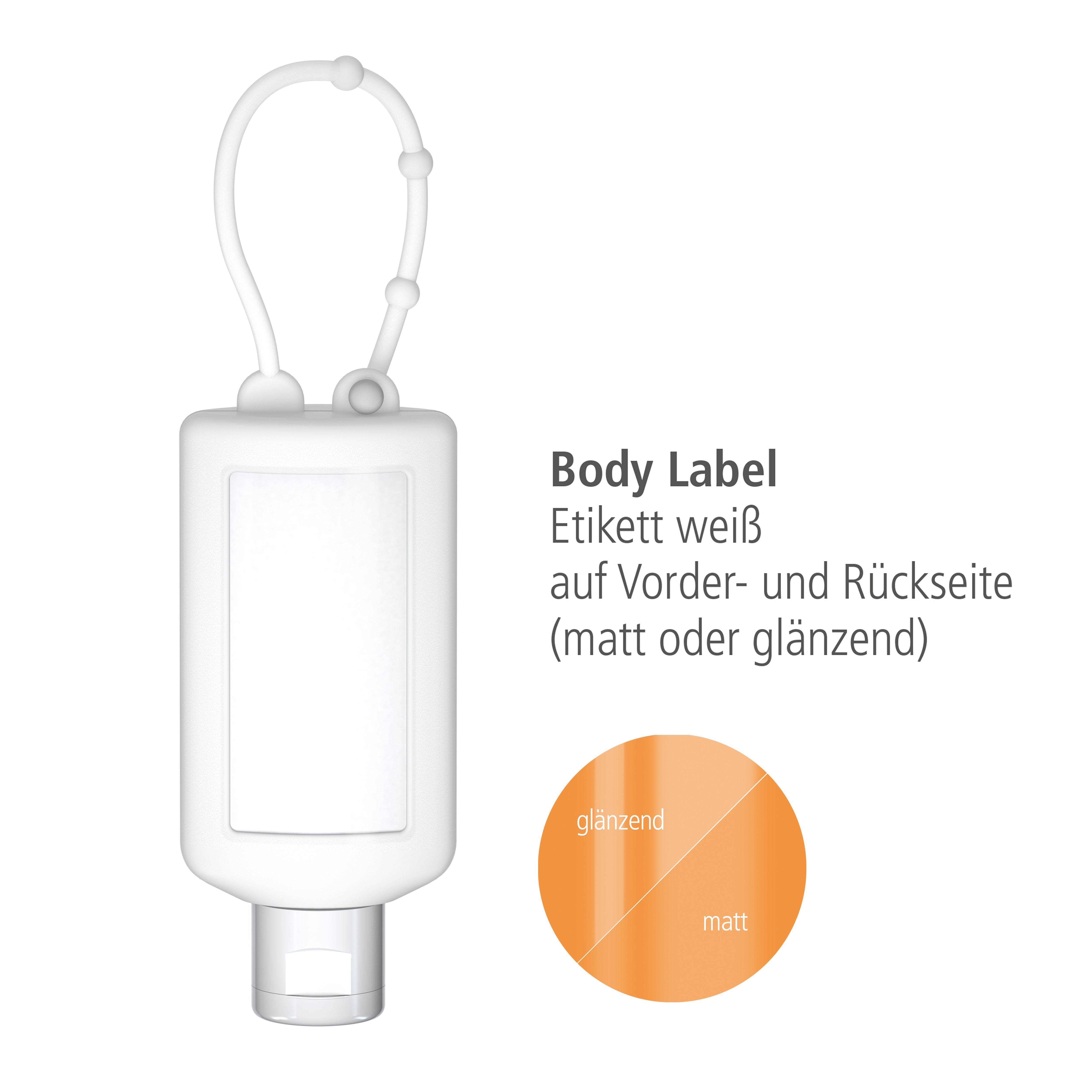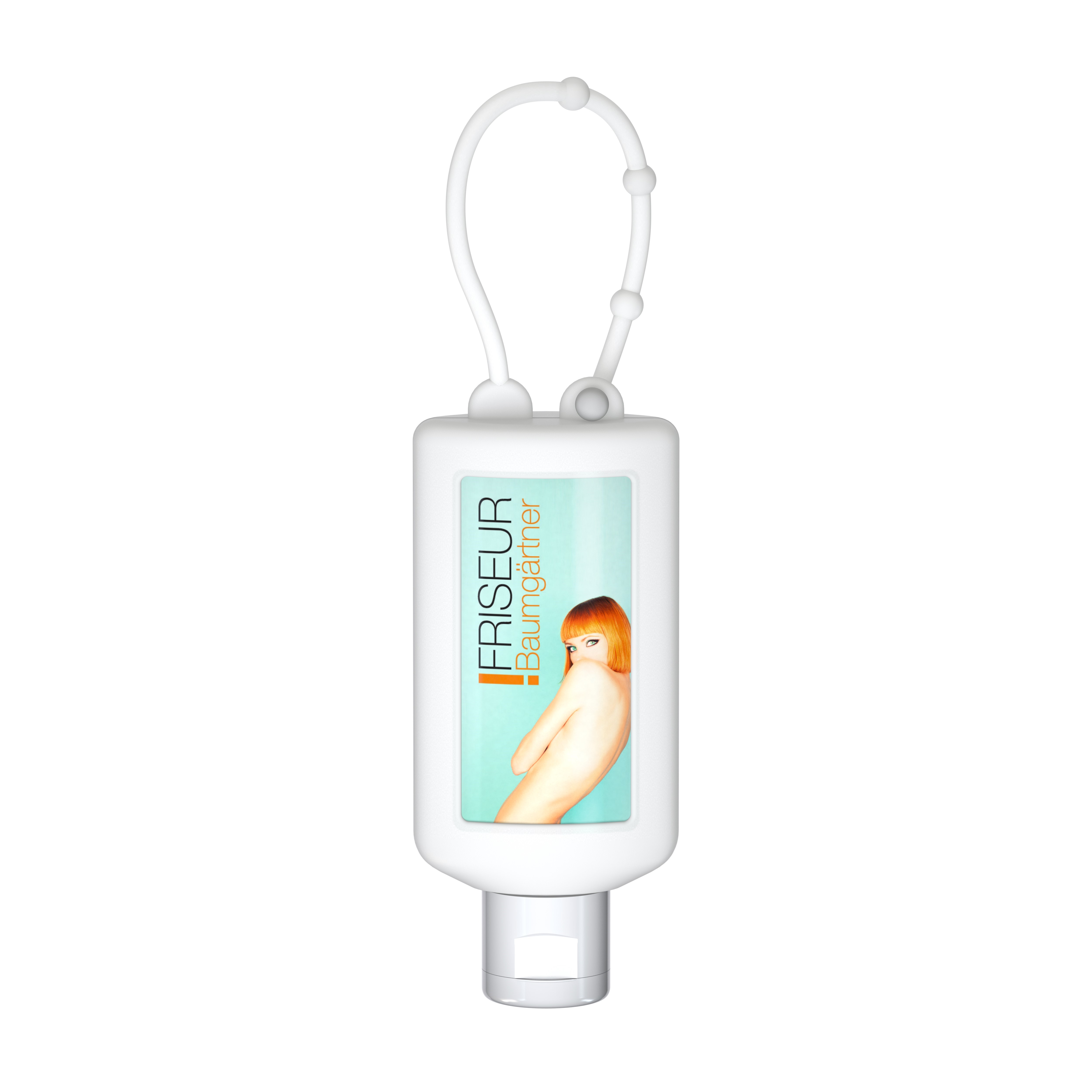 Praktische Kosmetikflasche zum Anhängen! Das Fläschchen mit Silikonhülle ist nicht nur optisch ein echter Hingucker! Raffiniert mit Schlaufe zum Anhängenan die Handtasche, an den Rucksack oder an den Trolli. 50 ml Flasche und Klappdeckel (zufällig ausgerichtet) weiß; Silikonhülle und Schlaufe in Nachfüllbar. Flasche hergestellt aus 100% recyceltem PET, weiß mit leichter R-PET-Färbung. Handbalsam Ringelblume-Aloe Vera: Die Extrakte der Ringelblume enthalten eine Vielzahl natürlicher, entzündungshemmender Substanzen und ätherischer Öle. Aloe Vera wirkt wohltuend kühlend und beruhigend. In dieser hochwertigen Handcreme sind die Vorzüge beider Heilpflanzen stimmig zu einem schnell einziehenden Feuchtigkeitsbalsam vereint. Ideal zur Pflege von trockenen, rauen und strapazierten Händen. • Vegan • pH-hautneutral • Ohne Parabene • Dermatologisch getestet "Sehr gut hautverträglich" • Hergestellt in Deutschland Dekoration: Body Label: Etikett PE (weiß) auf Vorder- und Rückseite, Druck 4c CMYK. Wahlweise glänzend oder matt. Füllung: 50ml