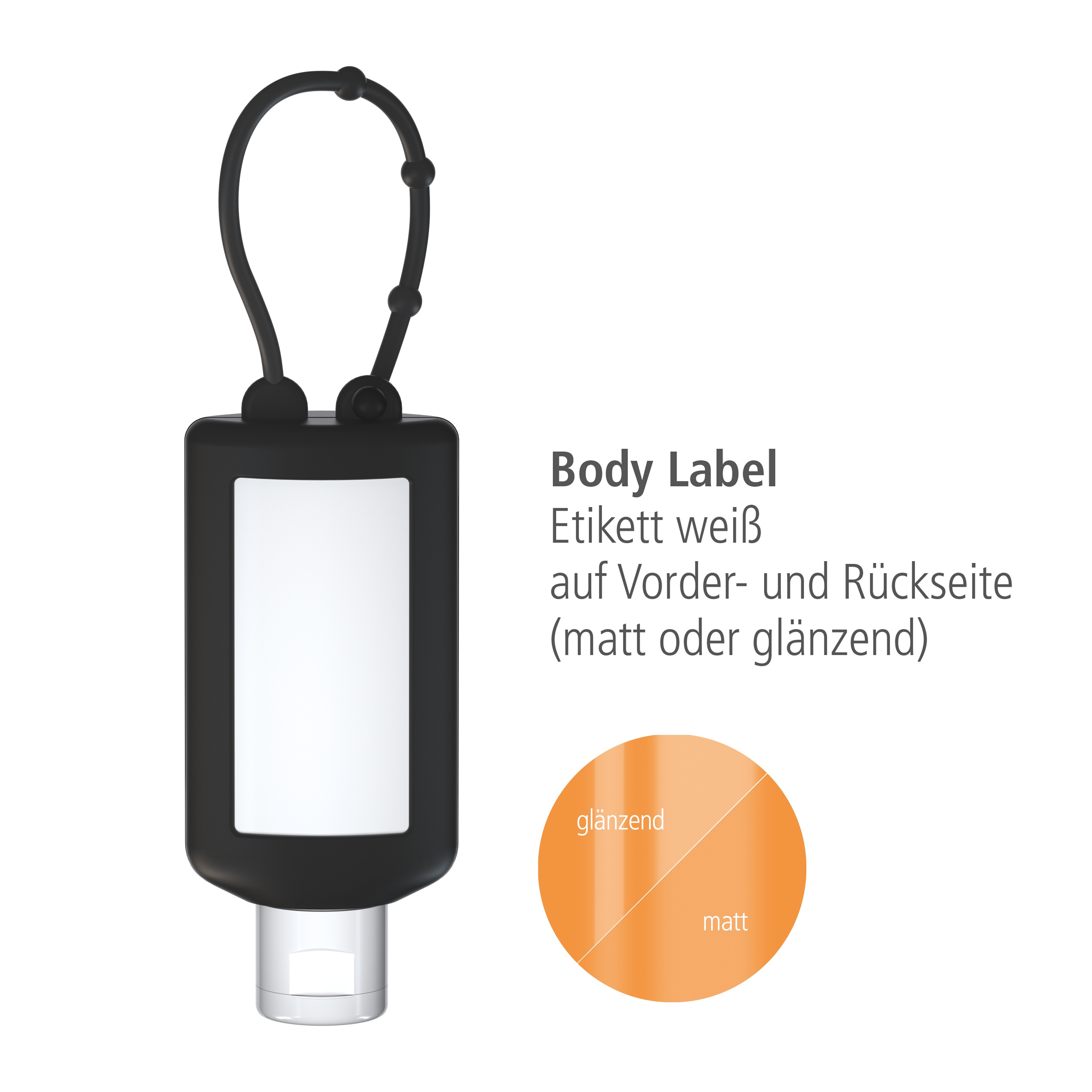 Praktische Kosmetikflasche zum Anhängen! Das Fläschchen mit Silikonhülle ist nicht nur optisch ein echter Hingucker! Raffiniert mit Schlaufe zum Anhängenan die Handtasche, an den Rucksack oder an den Trolli. 50 ml Flasche und Klappdeckel (zufällig ausgerichtet) weiß; Silikonhülle und Schlaufe in Nachfüllbar. Flasche hergestellt aus 100% recyceltem PET, weiß mit leichter R-PET-Färbung. Handbalsam Ringelblume-Aloe Vera: Die Extrakte der Ringelblume enthalten eine Vielzahl natürlicher, entzündungshemmender Substanzen und ätherischer Öle. Aloe Vera wirkt wohltuend kühlend und beruhigend. In dieser hochwertigen Handcreme sind die Vorzüge beider Heilpflanzen stimmig zu einem schnell einziehenden Feuchtigkeitsbalsam vereint. Ideal zur Pflege von trockenen, rauen und strapazierten Händen. • Vegan • pH-hautneutral • Ohne Parabene • Dermatologisch getestet "Sehr gut hautverträglich" • Hergestellt in Deutschland Dekoration: Body Label: Etikett PE (weiß) auf Vorder- und Rückseite, Druck 4c CMYK. Wahlweise glänzend oder matt. Füllung: 50ml