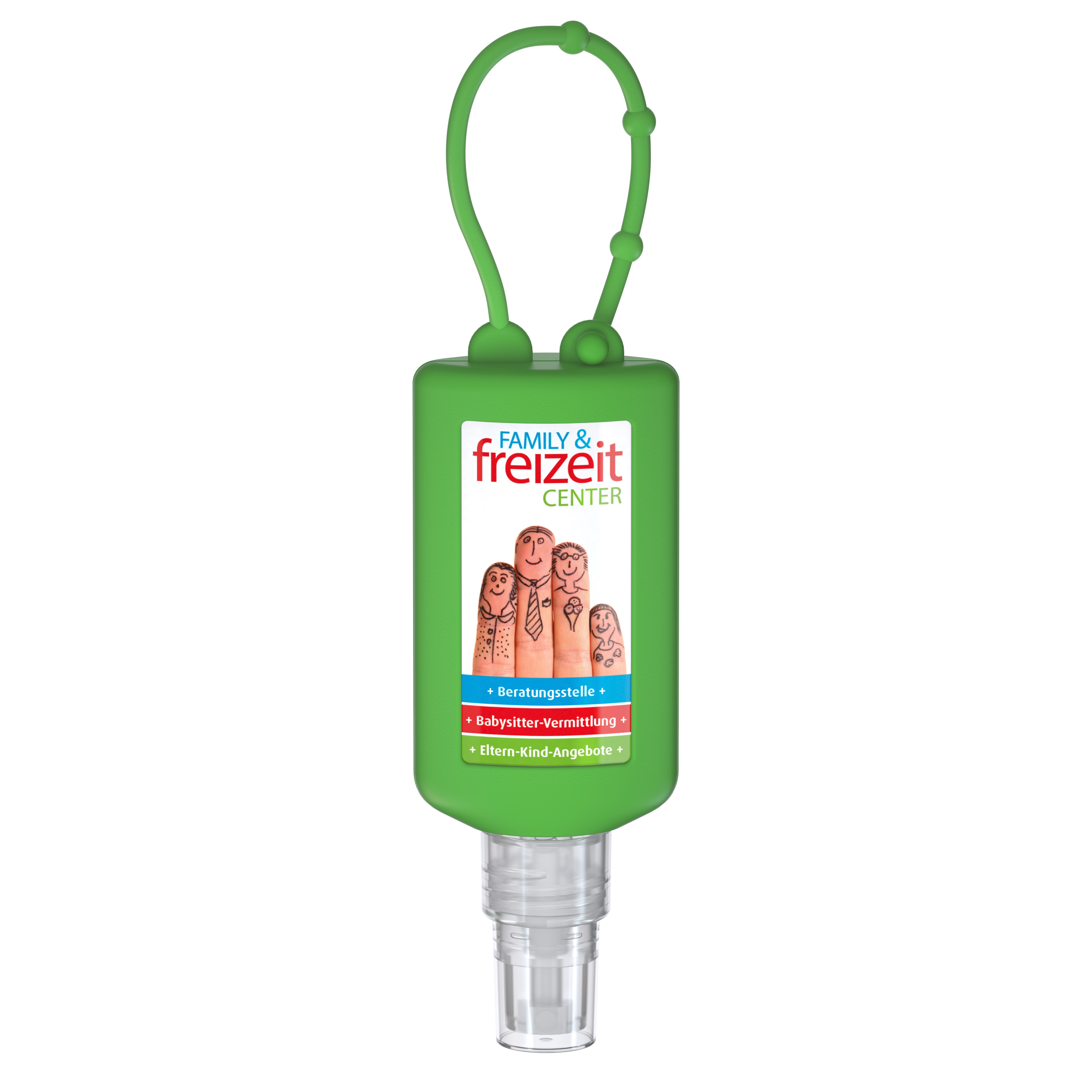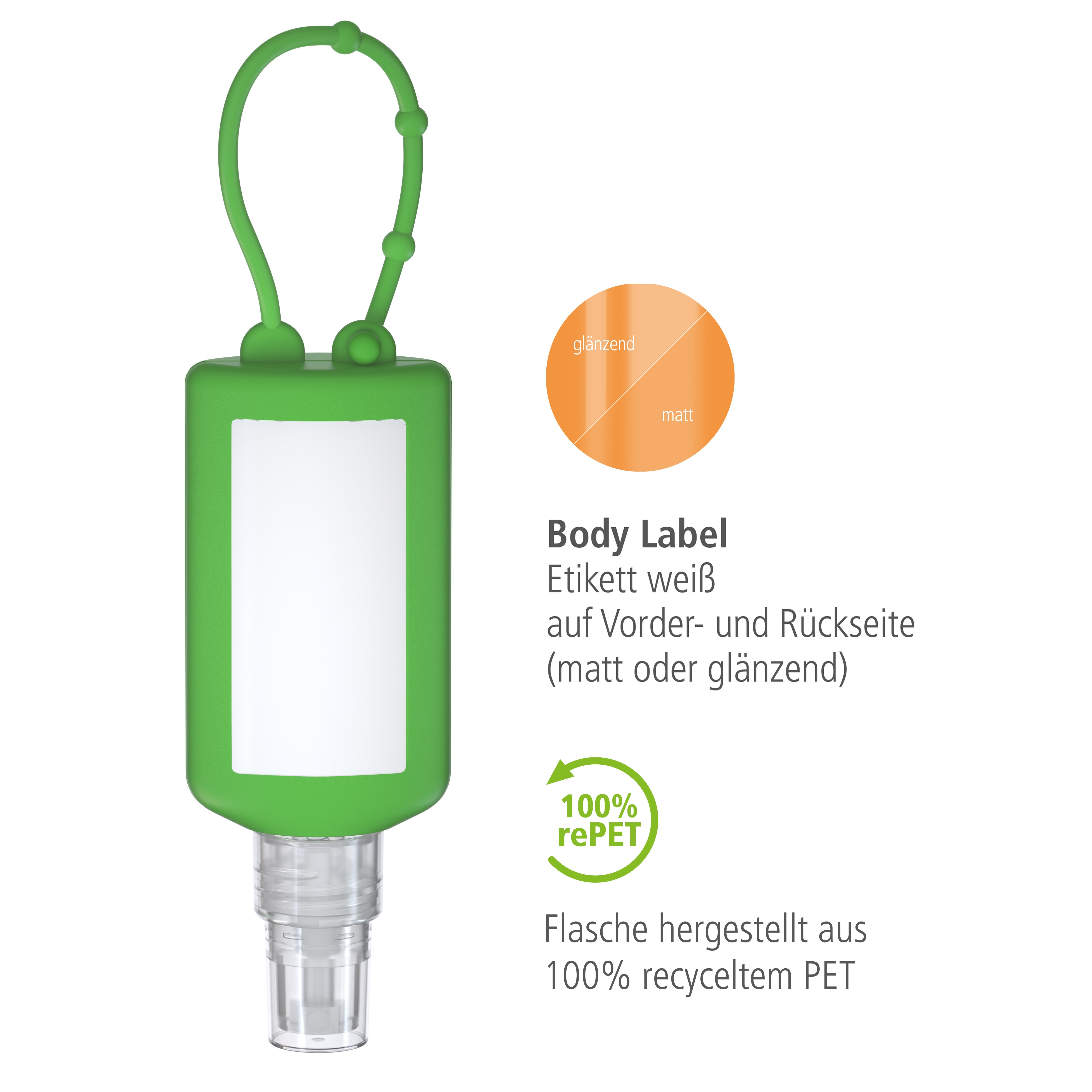Praktische Kosmetikflasche zum Anhängen! Das Spray mit Silikonhülle ist nicht nur optisch ein echter Hingucker! Raffiniert mit Schlaufe zum Anhängen ans Handgepäck, an den Rucksack oder an den Kinderwagen. 50 ml Flasche aus 100% recyceltem PET, transparent mit leichter R-PET-Färbung. Mit Pumpaufsatz "transparent" mit Schutzkappe; Silikonhülle und Schlaufe in Nachfüllbar. Täglich kommen unsere Hände mit Schmutz in Kontakt. Besonders praktisch für unterwegs ist das alkoholische Handreinigungsspray: Dieses "flüssige Hygienetuch" ist einfach in der Anwendung, sparsam in der Dosierung und Ihre Hände fühlen sich frisch, gepflegt und geschmeidig an. • Vegan • pH-neutral • Ohne Parabene • Ohne Konservierungsstoffe Dermatologisch "sehr gut hautverträglich" getestet. Dekoration: Body Label: Etikett PE (weiß), Druck 4c CMYK. Wahlweise glänzend oder matt. Füllung: 50ml