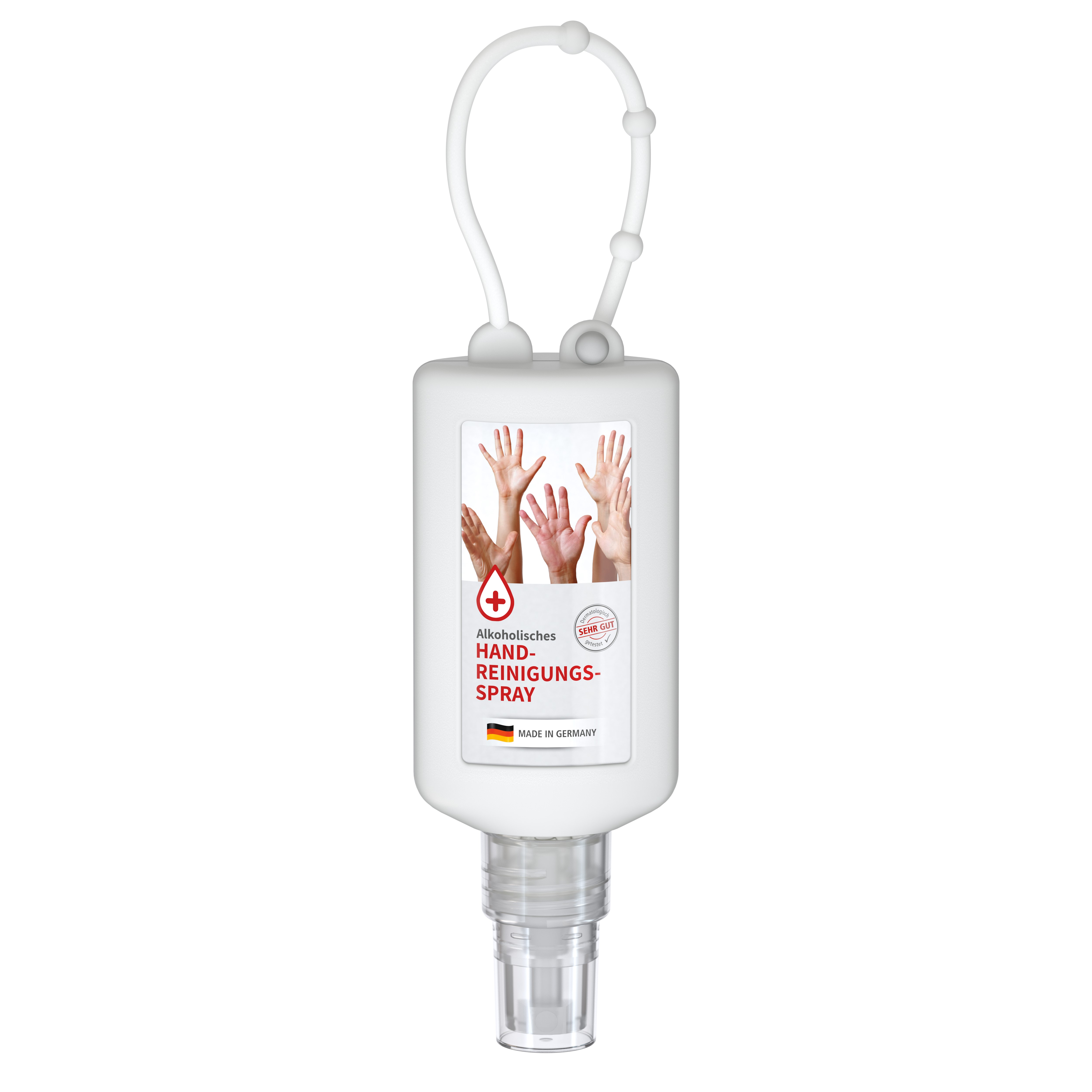 Praktische Kosmetikflasche zum Anhängen! Das Spray mit Silikonhülle ist nicht nur optisch ein echter Hingucker! Raffiniert mit Schlaufe zum Anhängen ans Handgepäck, an den Rucksack oder an den Kinderwagen. 50 ml Flasche aus 100% recyceltem PET, transparent mit leichter R-PET-Färbung. Mit Pumpaufsatz "transparent" mit Schutzkappe; Silikonhülle und Schlaufe in Nachfüllbar. Täglich kommen unsere Hände mit Schmutz in Kontakt. Besonders praktisch für unterwegs ist das alkoholische Handreinigungsspray: Dieses "flüssige Hygienetuch" ist einfach in der Anwendung, sparsam in der Dosierung und Ihre Hände fühlen sich frisch, gepflegt und geschmeidig an. • Vegan • pH-neutral • Ohne Parabene • Ohne Konservierungsstoffe Dermatologisch "sehr gut hautverträglich" getestet. Dekoration: Body Label: Etikett PE (weiß), Druck 4c CMYK. Wahlweise glänzend oder matt. Füllung: 50ml