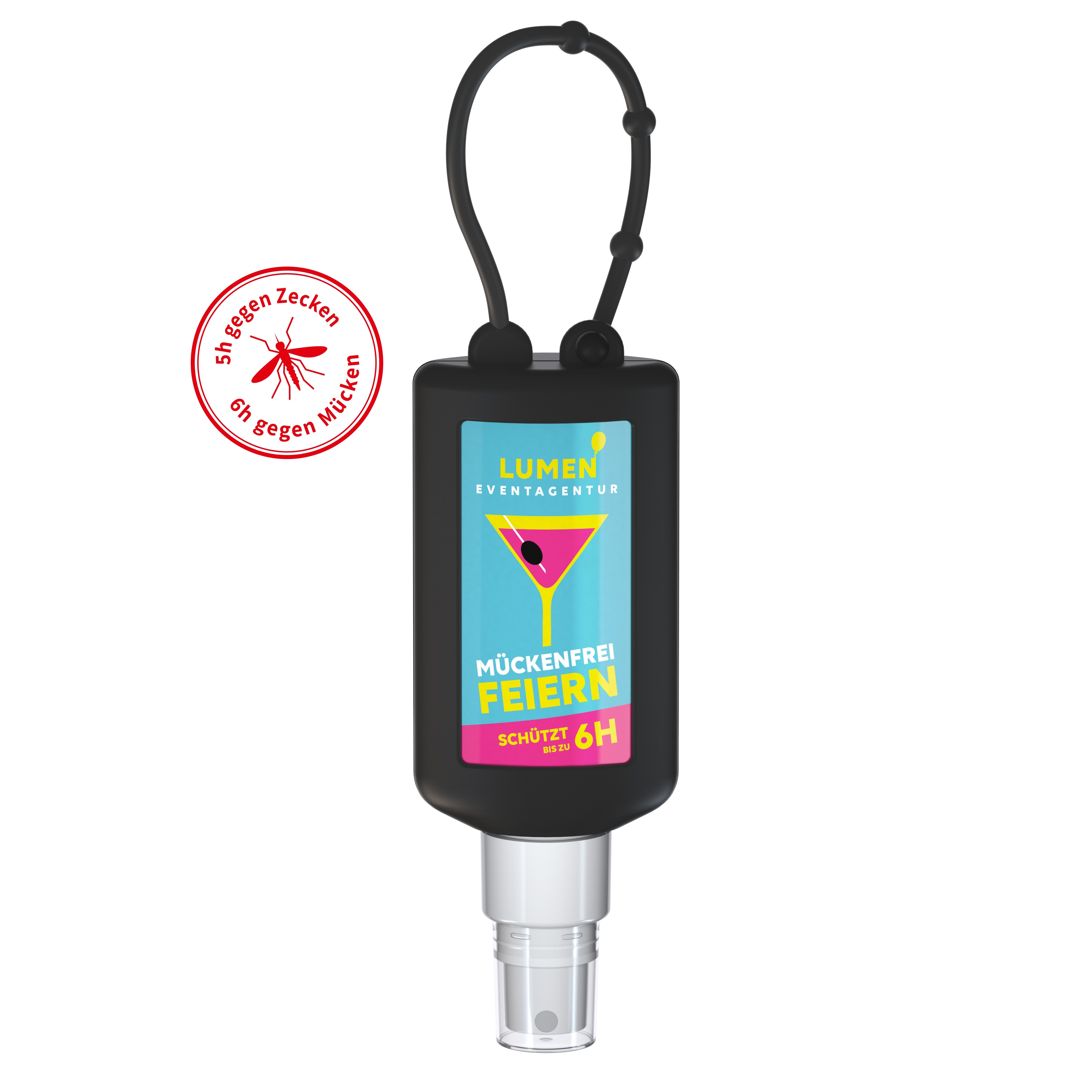 Praktische Kosmetikflasche zum Anhängen! Das Fläschchen mit Silikonhülle ist nicht nur optisch ein echter Hingucker! Raffiniert mit Schlaufe zum Anhängenan den Gürtel, an den Rucksack oder an den Werkzeugkoffer. 50 ml Flasche und Klappdeckel (zufällig ausgerichtet) weiß; Silikonhülle und Schlaufe in Nachfüllbar. Flasche hergestellt aus 100% recyceltem PET, weiß mit leichter R-PET-Färbung. Insektenschutz-Spray Sensitiv. Die speziell für Allergiker entwickelte Rezeptur bietet optimalen Schutz für empfindliche Haut. Es ist geeignet für Kinder ab 2 Jahren und kann von der ganzen Familie verwendet werden. Dank des Wirkstoffes Icaridin und besonderen Wirkstoffverstärkern sorgt es für langanhaltenden Schutz: • Bis zu 6 Stunden vor Mückenstichen • Bis zu 5 Stunden vor Zeckenbissen • Für Allergiker und Kinder ab 2 Jahren geeignet • Dermatologisch "Sehr gut hautverträglich" getestet • Hergestellt in Deutschland Biozidprodukte vorsichtig verwenden. REPISOL Wirkstoff: 9,8 g / 100 g (9,8%) Icaridin. BAuA-Reg.-Nr.: N-101067. Verwendung: Repellent. Ohne Alkohol, kein Gefahrgut. Dekoration: Body Label: Etikett PE (weiß) auf Vorder• und Rückseite, Druck 4c CMYK. Wahlweise glänzend oder matt. Füllung: 50ml